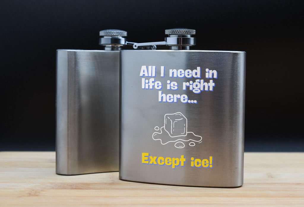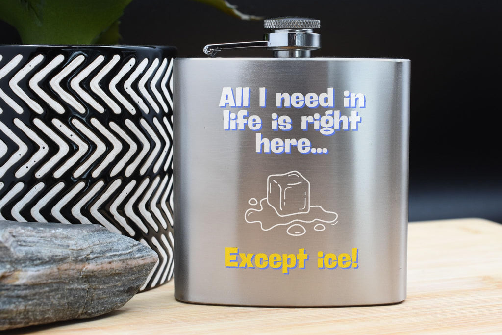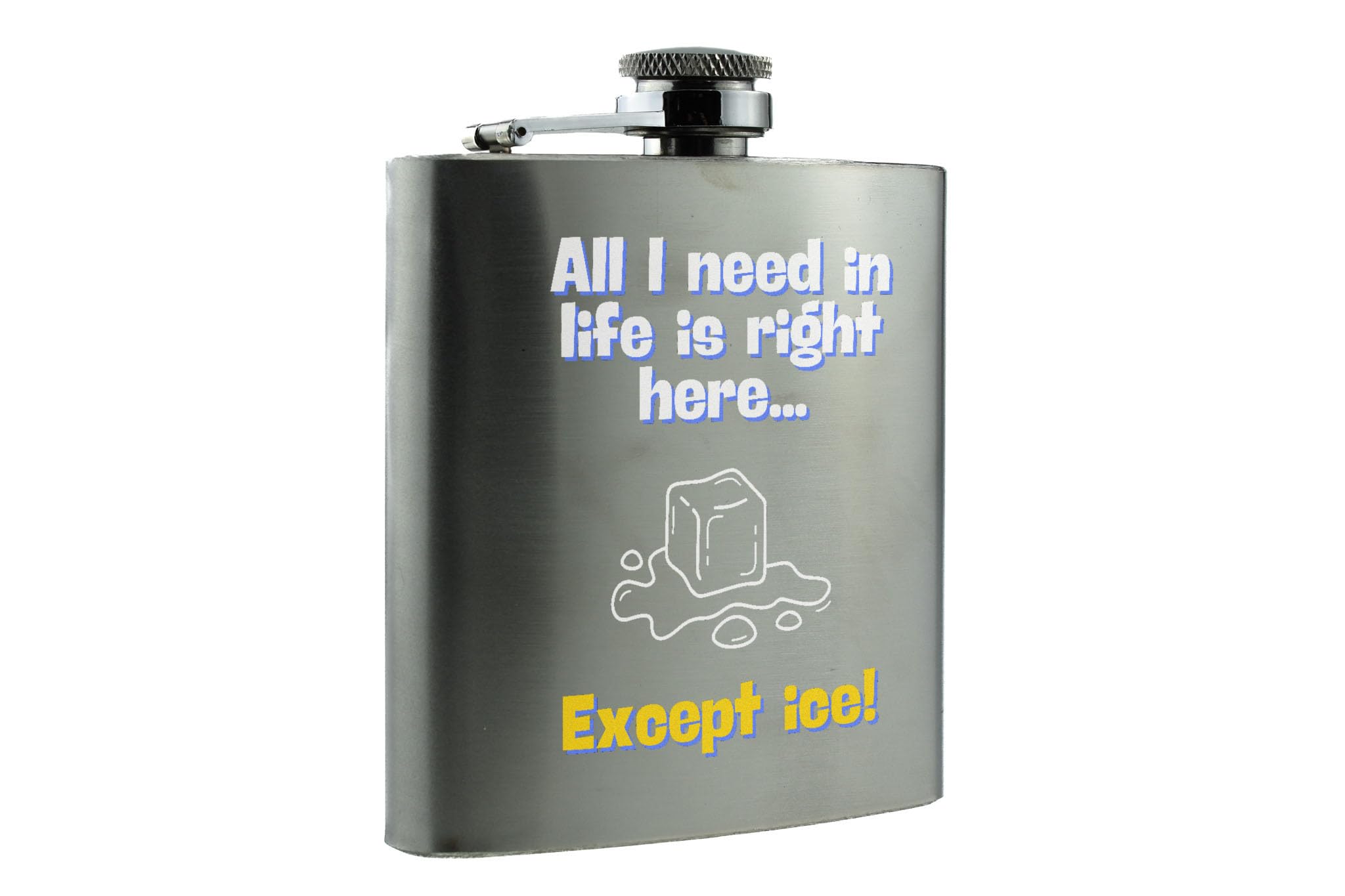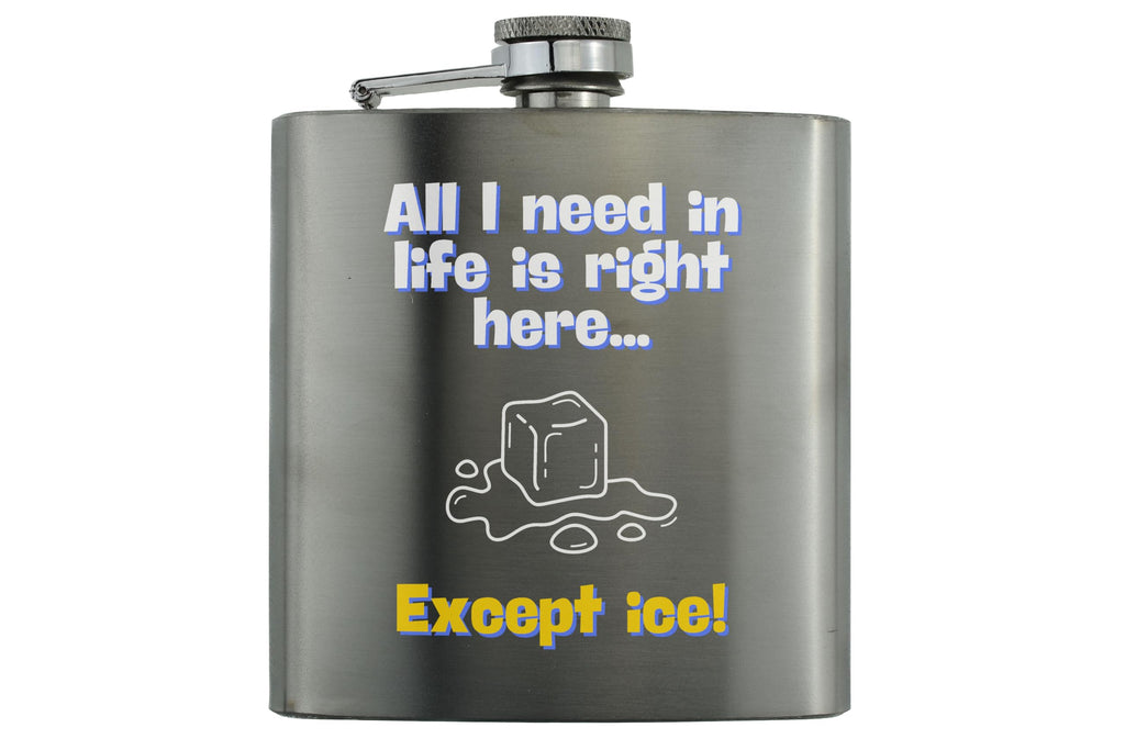 Add a touch of humour to your drinking experience with this Funny Quote Stainless Steel Flask! This beverage container is made from durable stainless steel, ensuring that your drinks stay cool and refreshing. The full colour printed flask features a fun cartoon style text-based design with the humorous quote 'All I need in life is right here... Except ice!' printed on it. This quirky gift is perfect for drink lovers and partygoers alike, making it a great addition to any barware collection. Whether you're sipping on your favourite liquor or enjoying a cocktail, this alcohol accessory is sure to bring a smile to your face. Give the gift of laughter with this unique and ironic design that is sure to prioritize laughs at any social gathering.