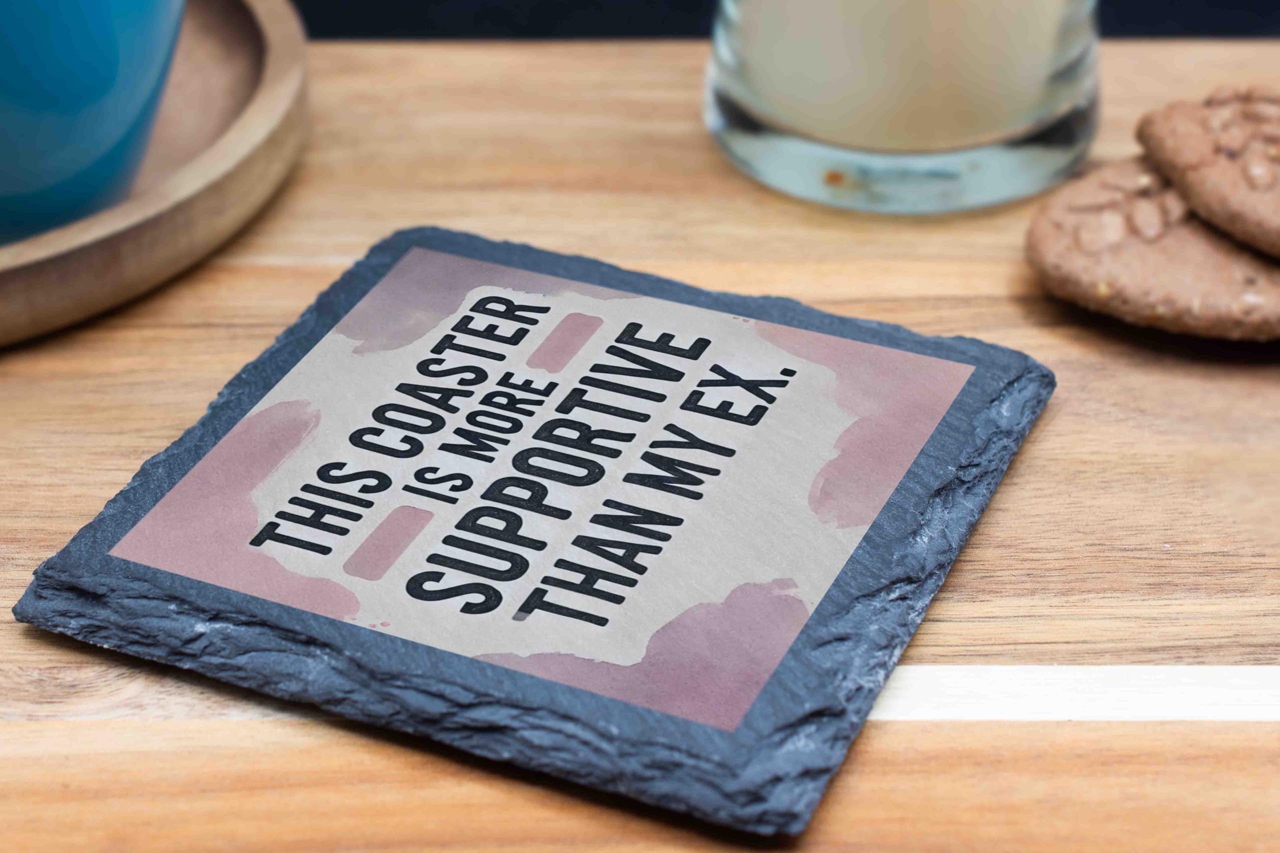 • Quirky Humor: Showcases the witty phrase, "This Coaster is More Supportive Than My Ex," for a good laugh.