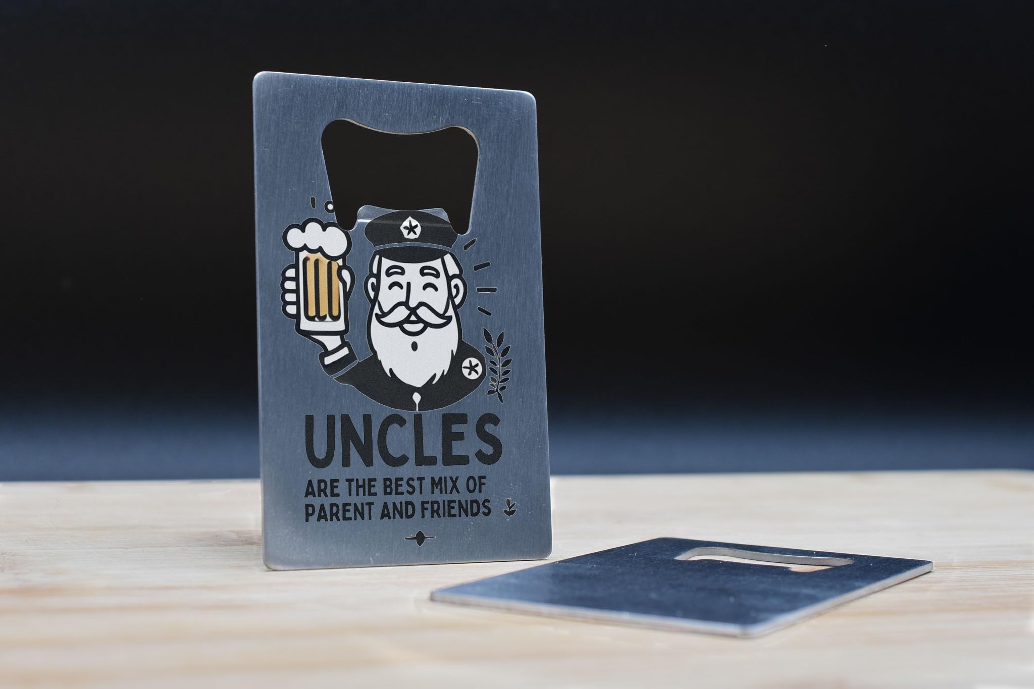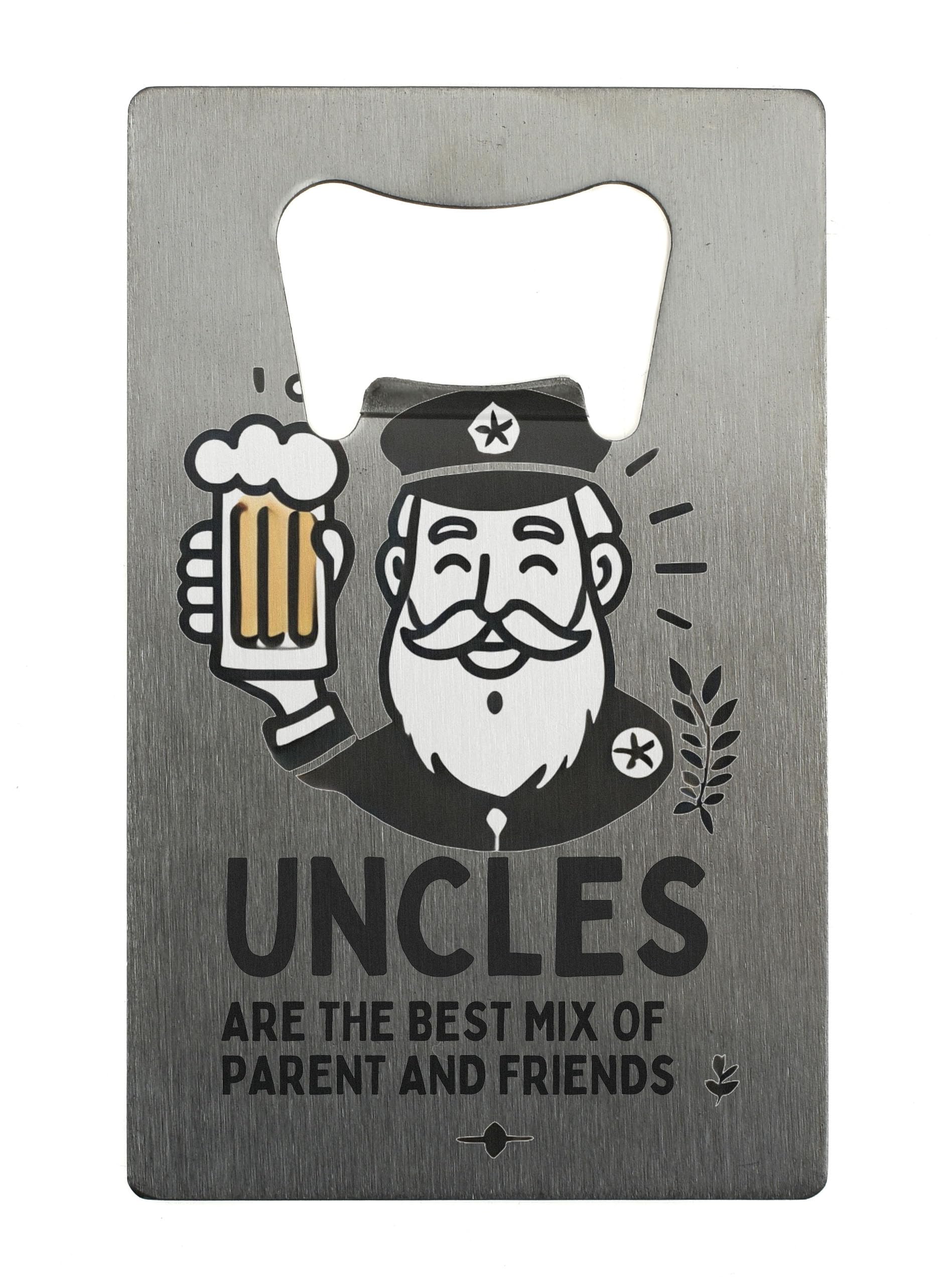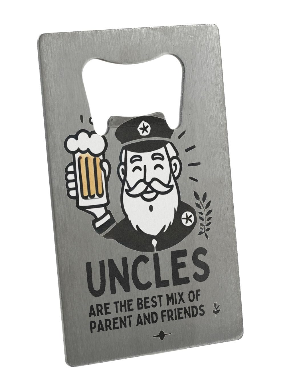 Introducing the Funny Uncle Stainless Steel Bottle Opener, the perfect beer opener tool for your quirky and fun uncle! This compact and portable bottle opener is the ideal bar tool for uncles who love a good laugh. Made of durable stainless steel, this novelty drink opener is pocket-sized and features a UV printed design that reads 'uncles are the best mix of parents and friends'. The full colour printed cartoon design adds humour to any gathering, making it a fun bar accessory and a great gag gift for uncles. Surprise your uncle with this unique uncle-themed opener on his birthday or any special occasion!
