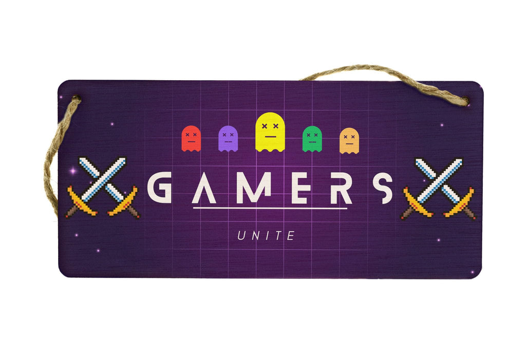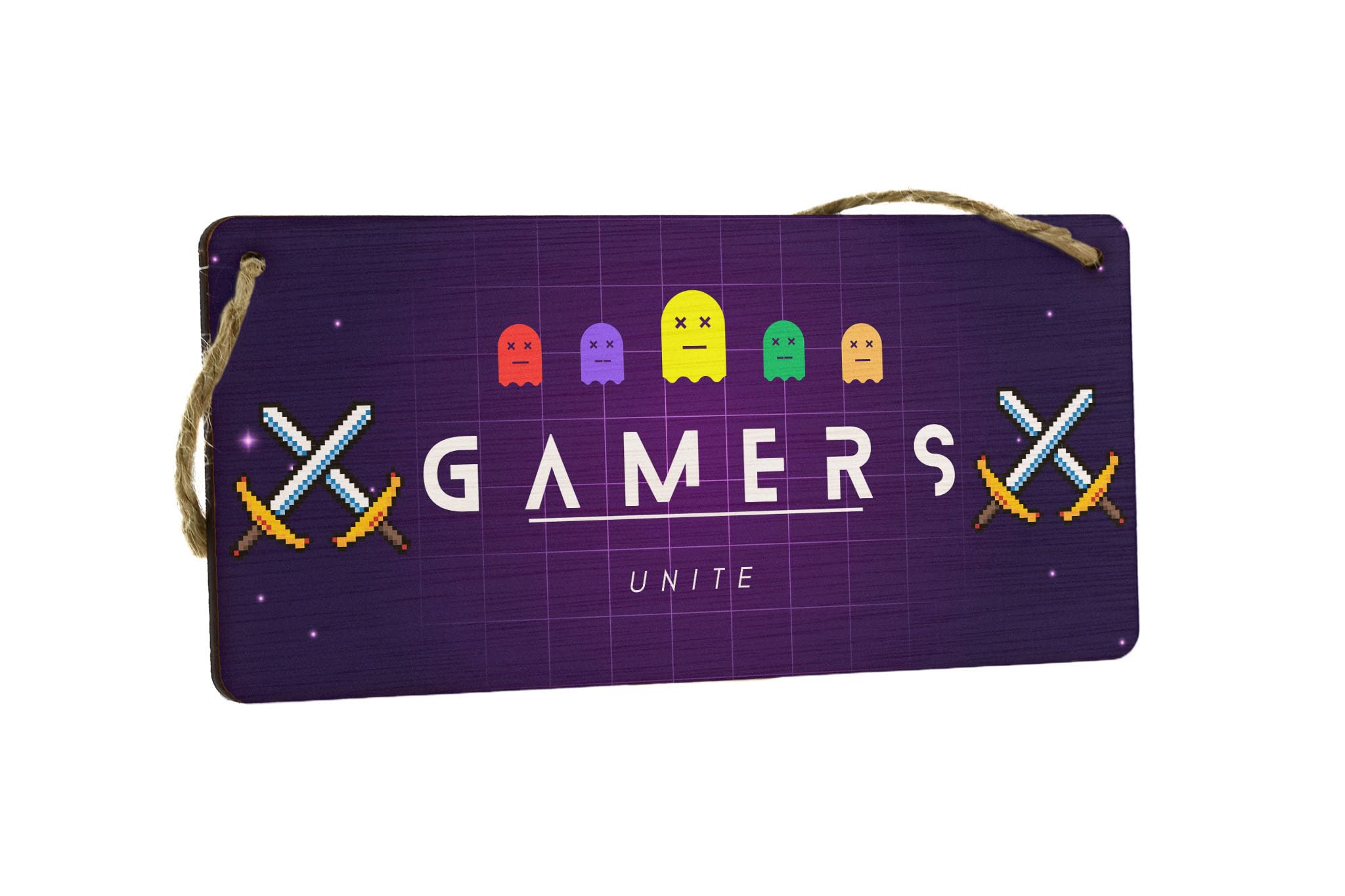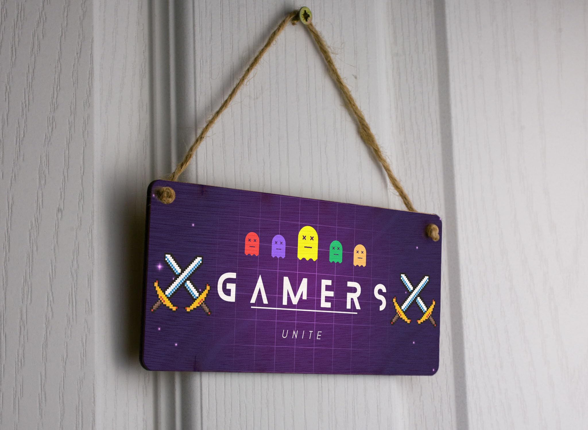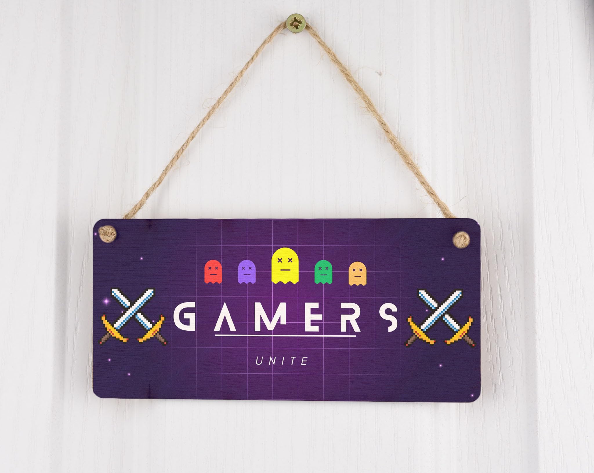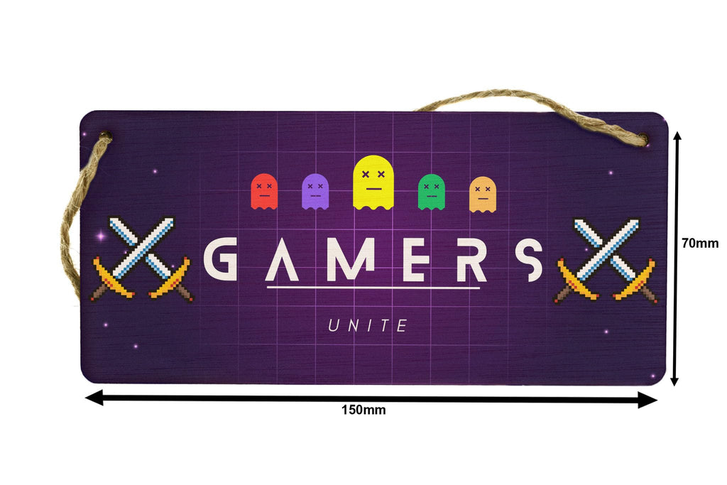 Introducing our Gamers Unite - Plywood Hanging Sign! This unique and eye-catching room sign is the perfect gift for family and friends who are avid gamers. Whether it's for your wife, husband, girlfriend, boyfriend, son, daughter, or siblings, this novelty sign is sure to be a hit. The colourful design features pixel swords and ghosts on a purple background, with white writing that reads 'Gamers Unite'. Made of quality plywood, this sign is perfect for hanging in a kids room or game room, adding a touch of fun and personality to any space.