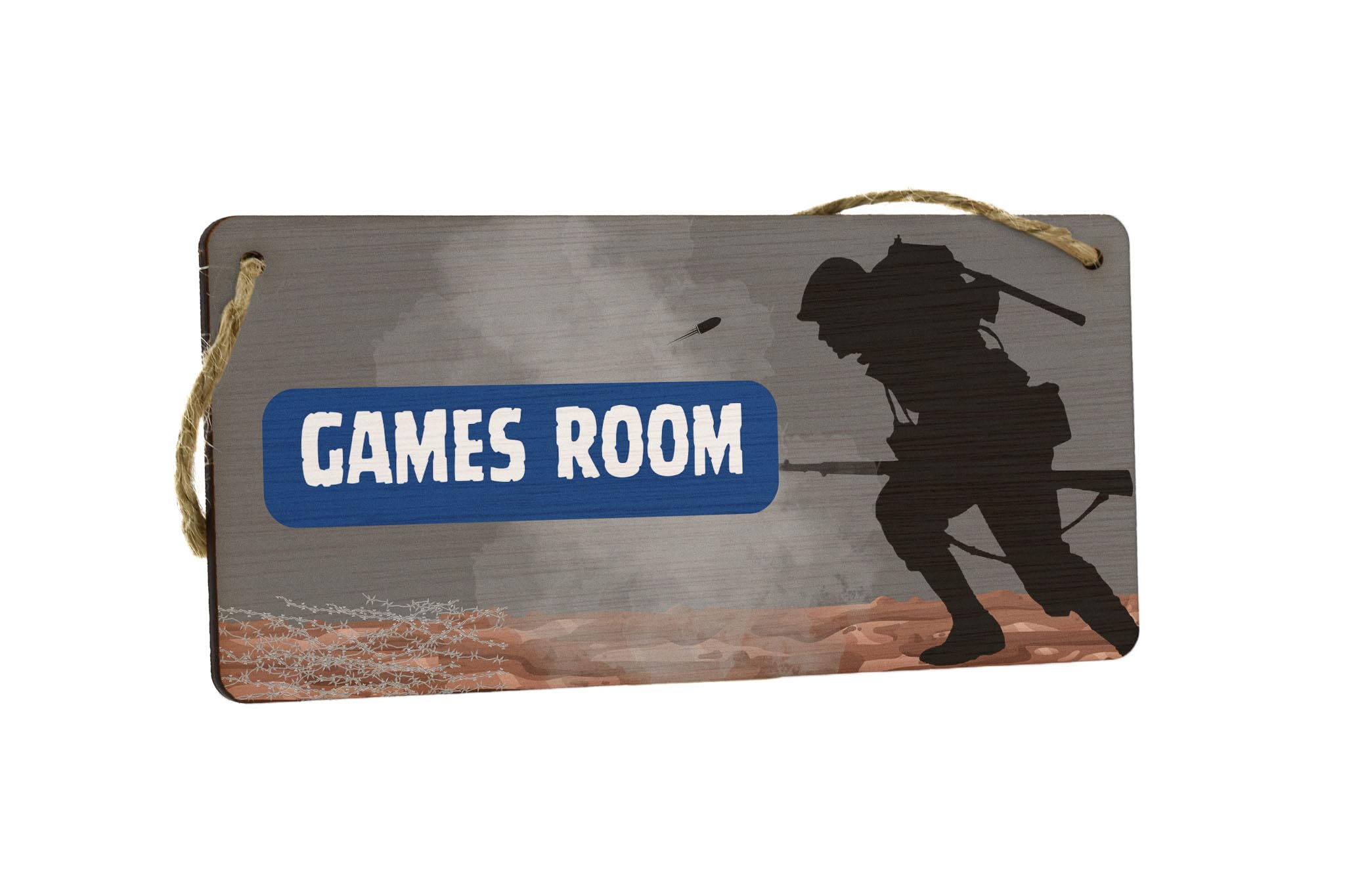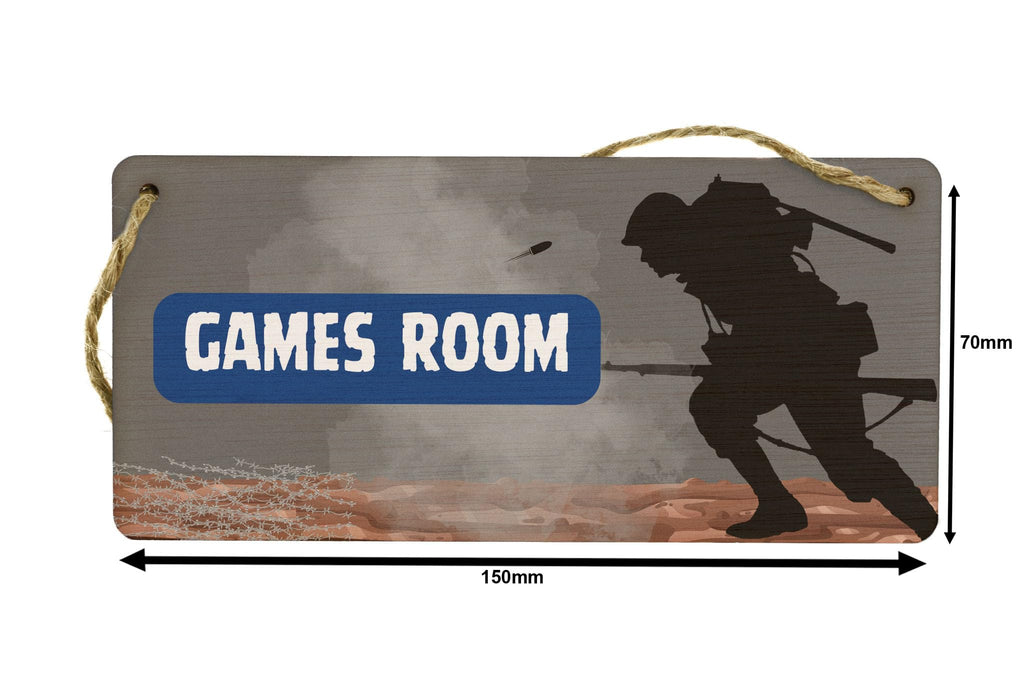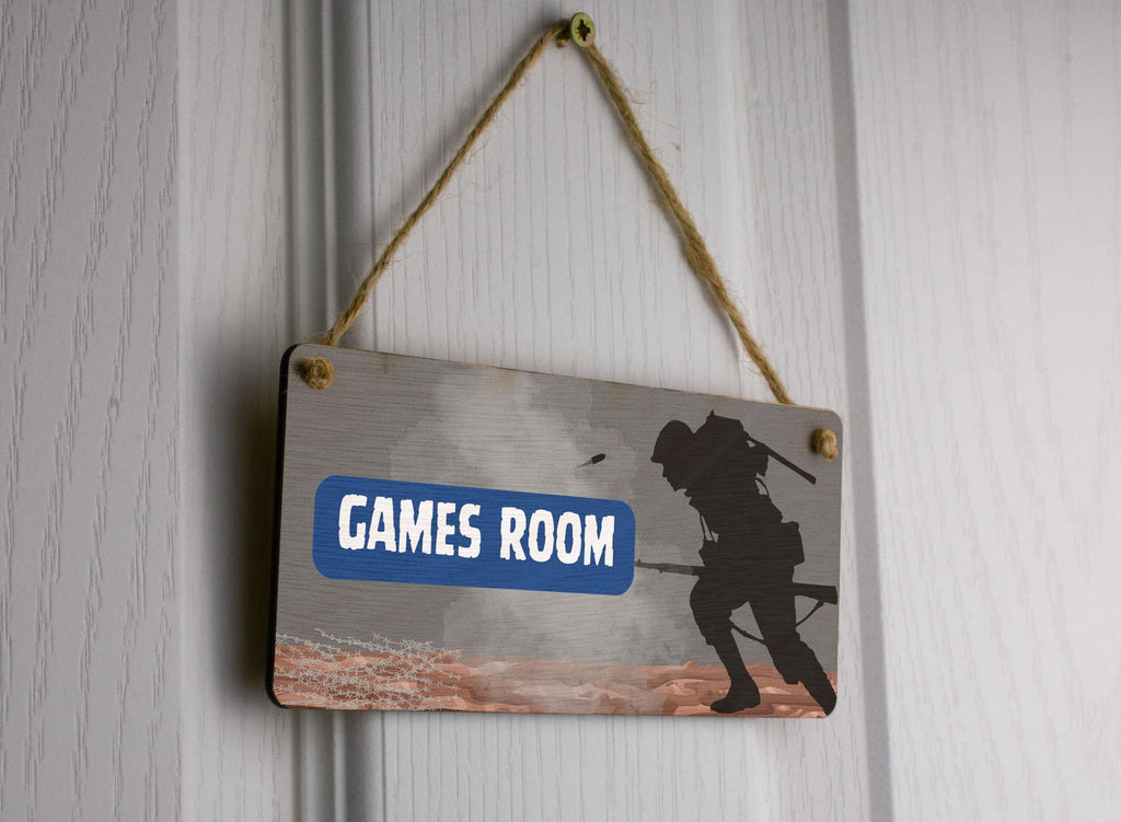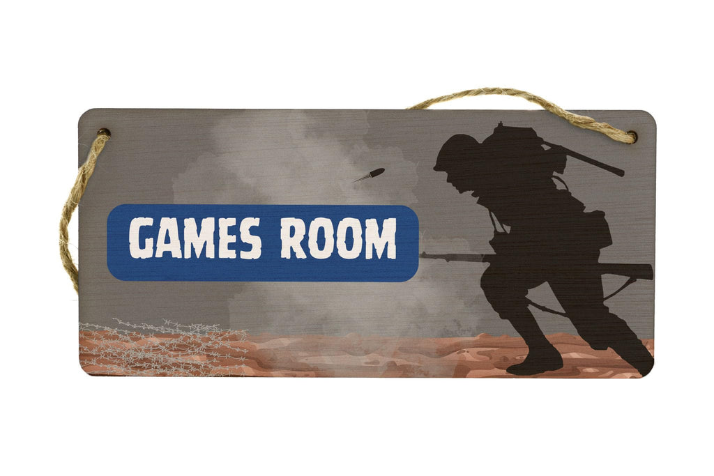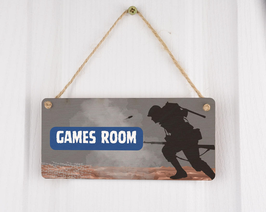 Transform your family and friends' gamer's room with this unique hanging plywood sign. This soldier theme room door sign gift is perfect for any gamer in your life, whether it be your wife, husband, girlfriend, boyfriend, son, daughter, or siblings. The full colour design features a background image of a war field with a black silhouette image of a soldier contrasted against the white writing. This plywood sign is a great addition to any kids room or games room, and reads 'games room' in a bold and eye-catching font.