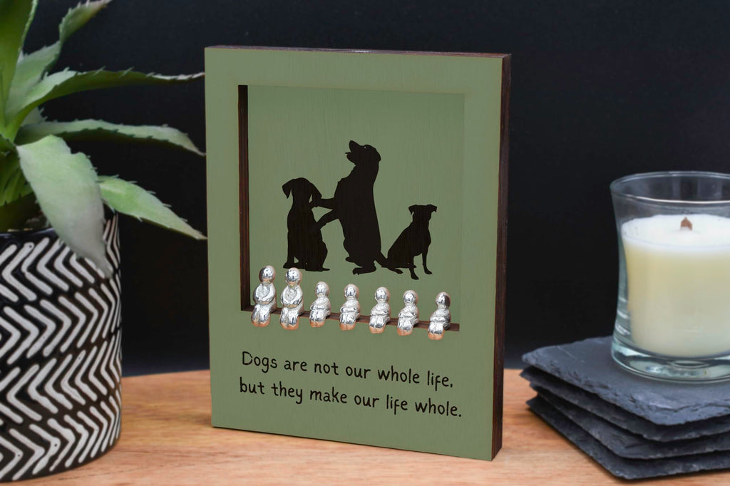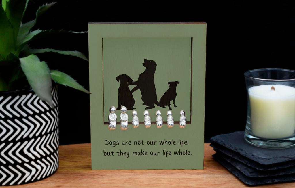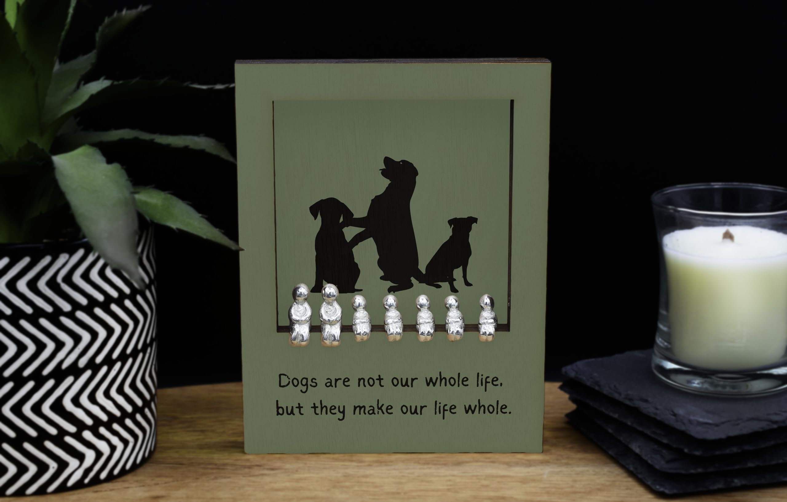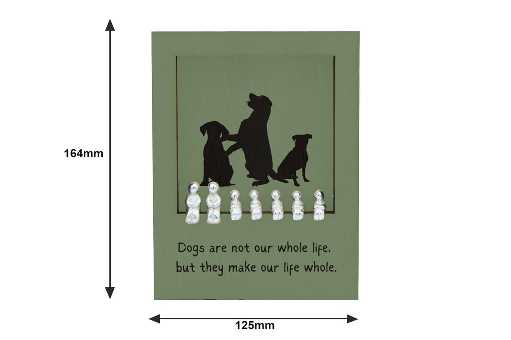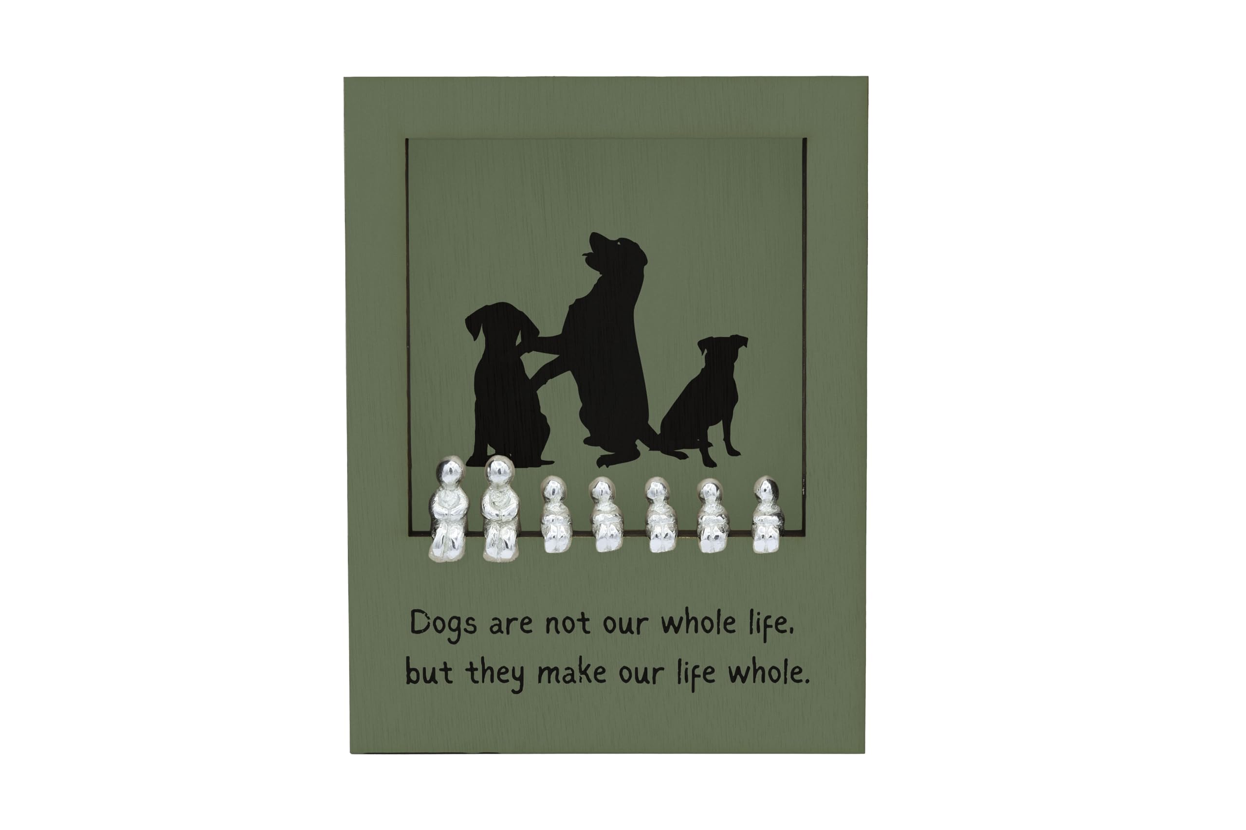 Introducing the Dogs Complete Our Lives! Family Ornament - the perfect home decor or gift for dog lovers. This beautiful ornament features a customisable 7 people set, printed in full colour on plywood and is free standing. It reads 'Dogs Are Not Our Whole Life But They Make Our Life Whole', reminding us of the special bond between our families and our beloved dogs. The metal figures fit seamlessly in the frame with a green background adorned with charming images of dogs. This ornament will serve as the centre piece for dog owner families, adding warmth and love to any home.