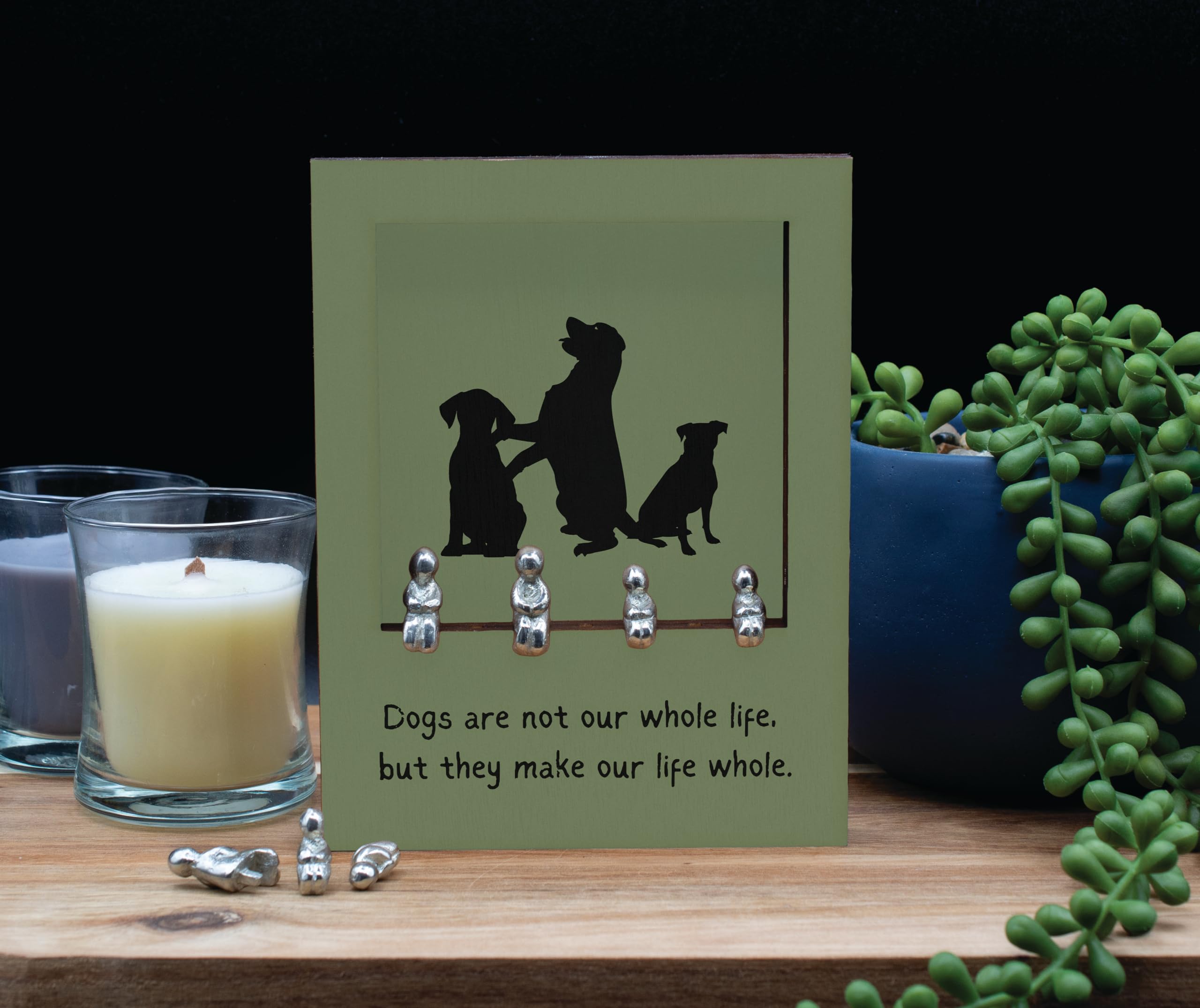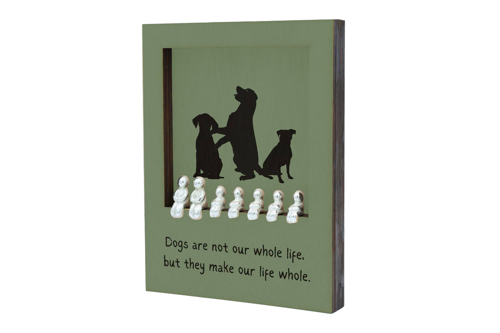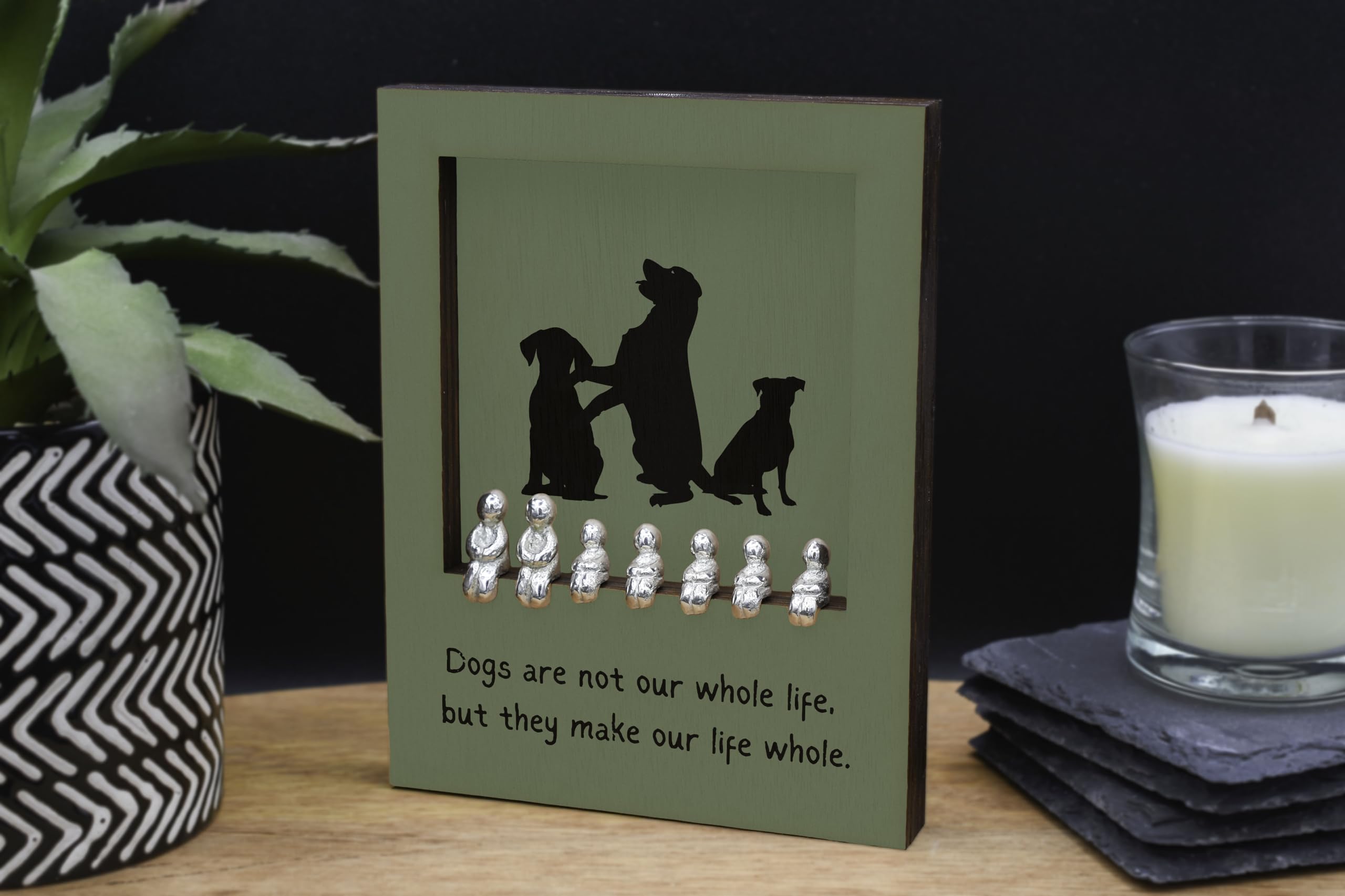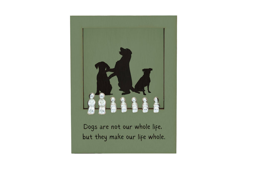 Introducing the Dogs Complete Our Lives! Family Ornament - the perfect home decor or gift for dog lovers. This beautiful ornament features a customisable 7 people set, printed in full colour on plywood and is free standing. It reads 'Dogs Are Not Our Whole Life But They Make Our Life Whole', reminding us of the special bond between our families and our beloved dogs. The metal figures fit seamlessly in the frame with a green background adorned with charming images of dogs. This ornament will serve as the centre piece for dog owner families, adding warmth and love to any home.