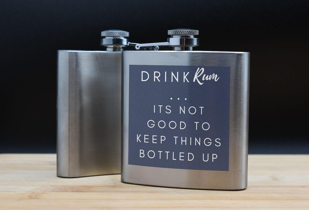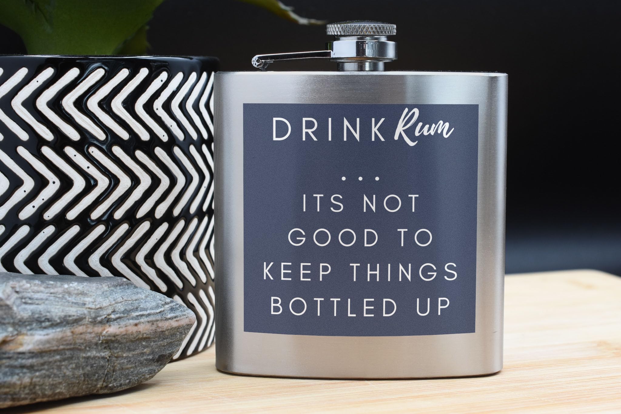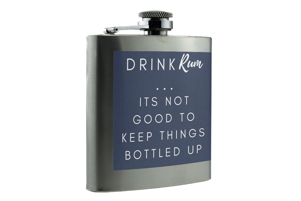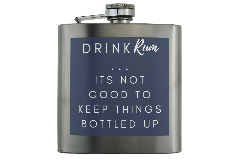 Introducing our Drink Rum, It's Not Good to Keep Things Bottled Up - Novelty Funny Gift Stainless Steel Hip Flask - the perfect accessory for those who love to have a good time! Made from quality stainless steel, this hip flask is durable and built to last. The full colour design features a blue square background with white writing that reads 'Drink Rum, It's Not Good to Keep Things Bottled Up'. It's a hilarious and cheeky way to express your love for rum and share a laugh with your friends and family. This hip flask makes a great gift for anyone, including your wife, husband, girlfriend, boyfriend, sons, daughters, and siblings. It's perfect for special occasions like birthdays, anniversaries, or just to show someone you care. With its unique design and sturdy construction, this novelty hip flask is sure to be a hit!