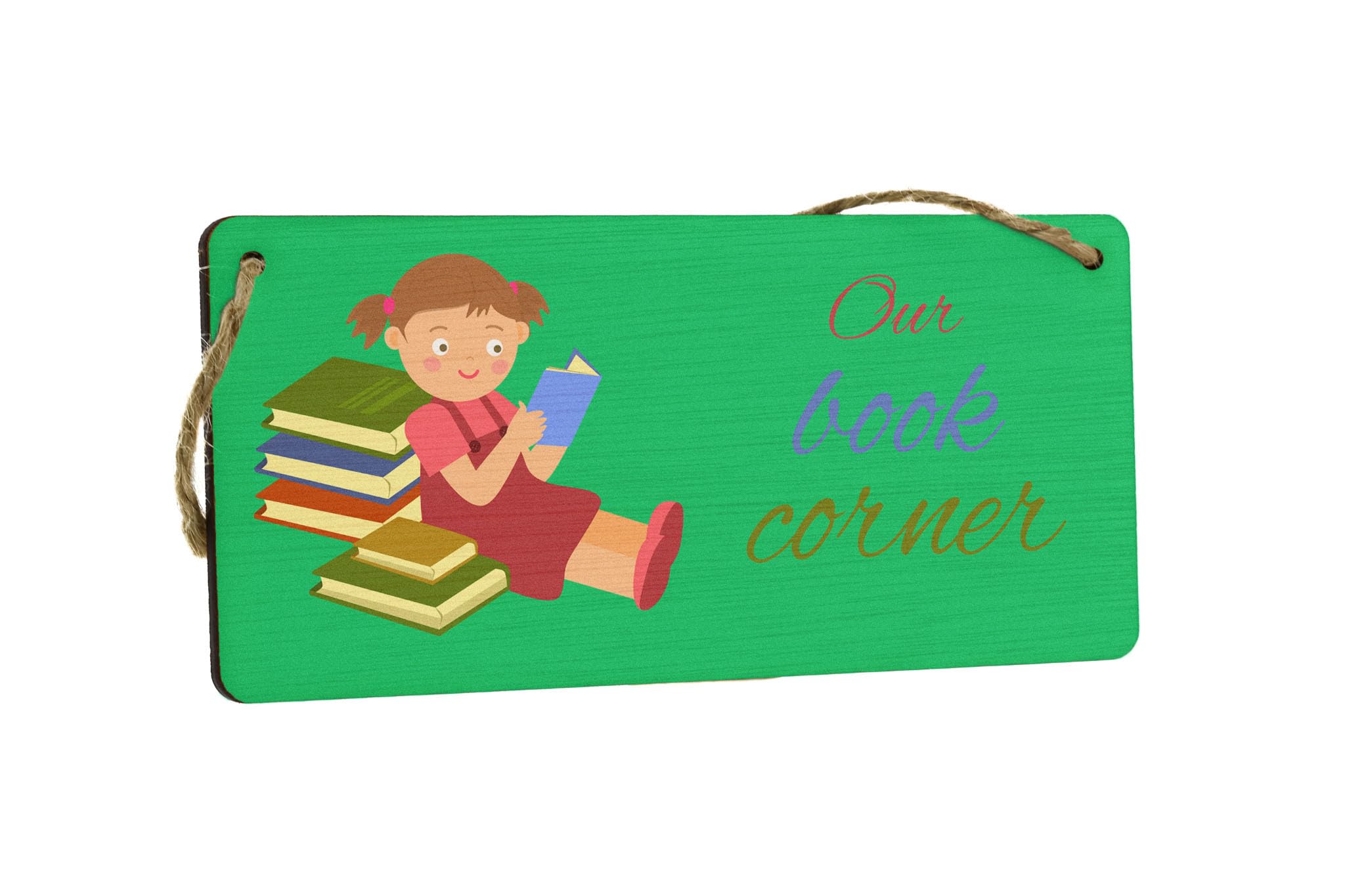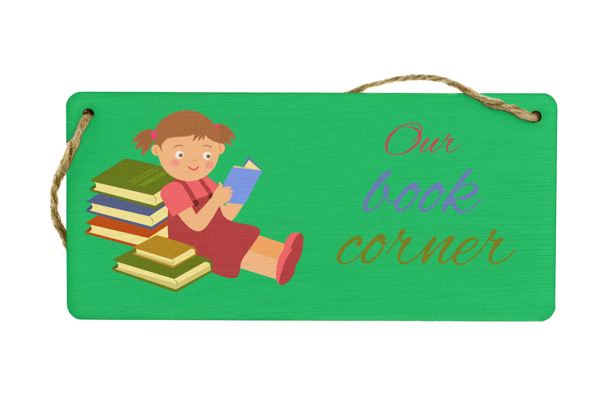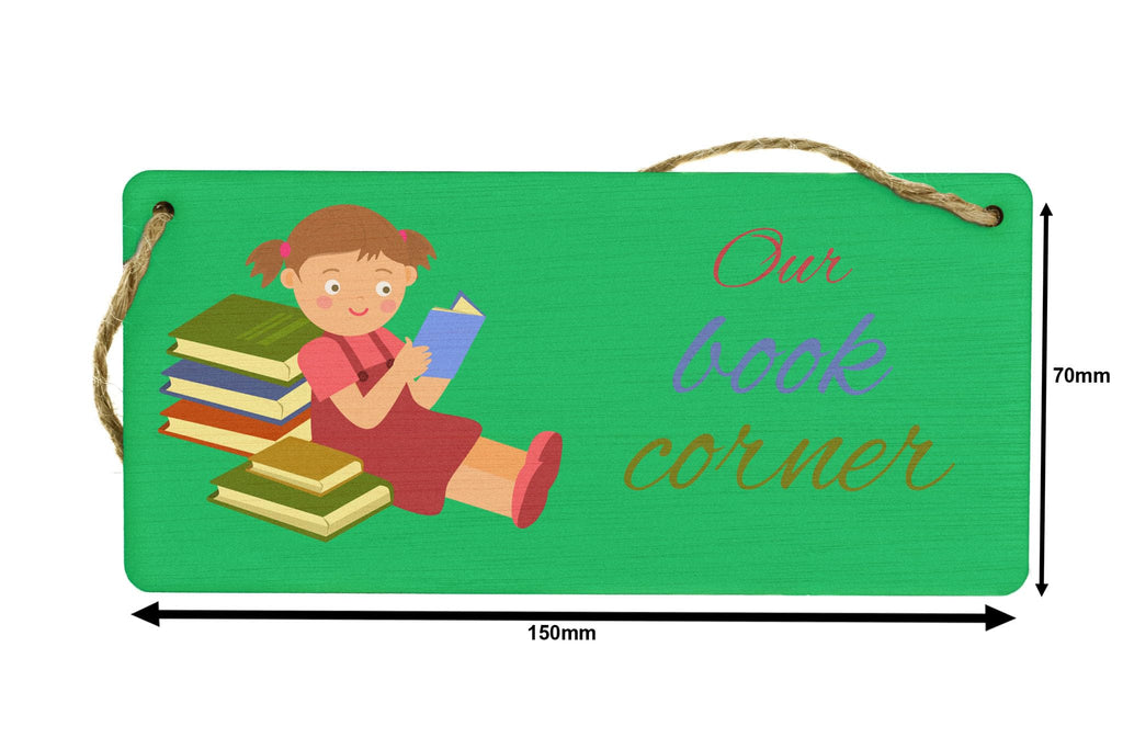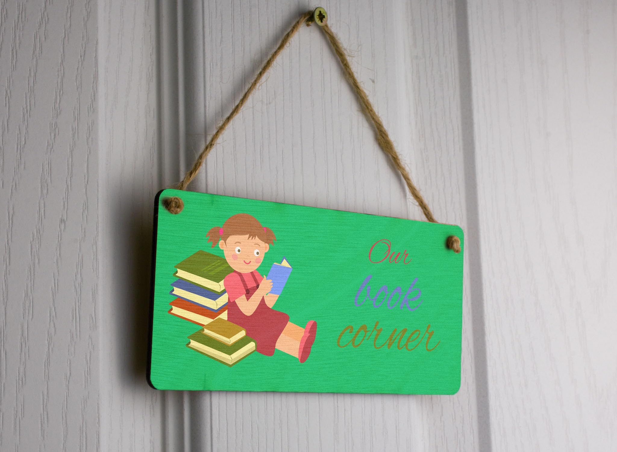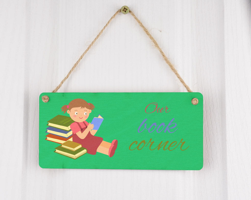 Enhance your home decor with this beautiful and vibrant Our Book Corner - Plywood Hanging Sign. Designed specifically for book corners and reading nooks, this sign is the perfect addition to any room in your house. Made from quality plywood, it is durable and long-lasting. The colourful design features a girl reading a book while leaning against a pile of books, set against a green background. Surprise your wife, husband, family, and friends with this thoughtful and charming home decor gift.