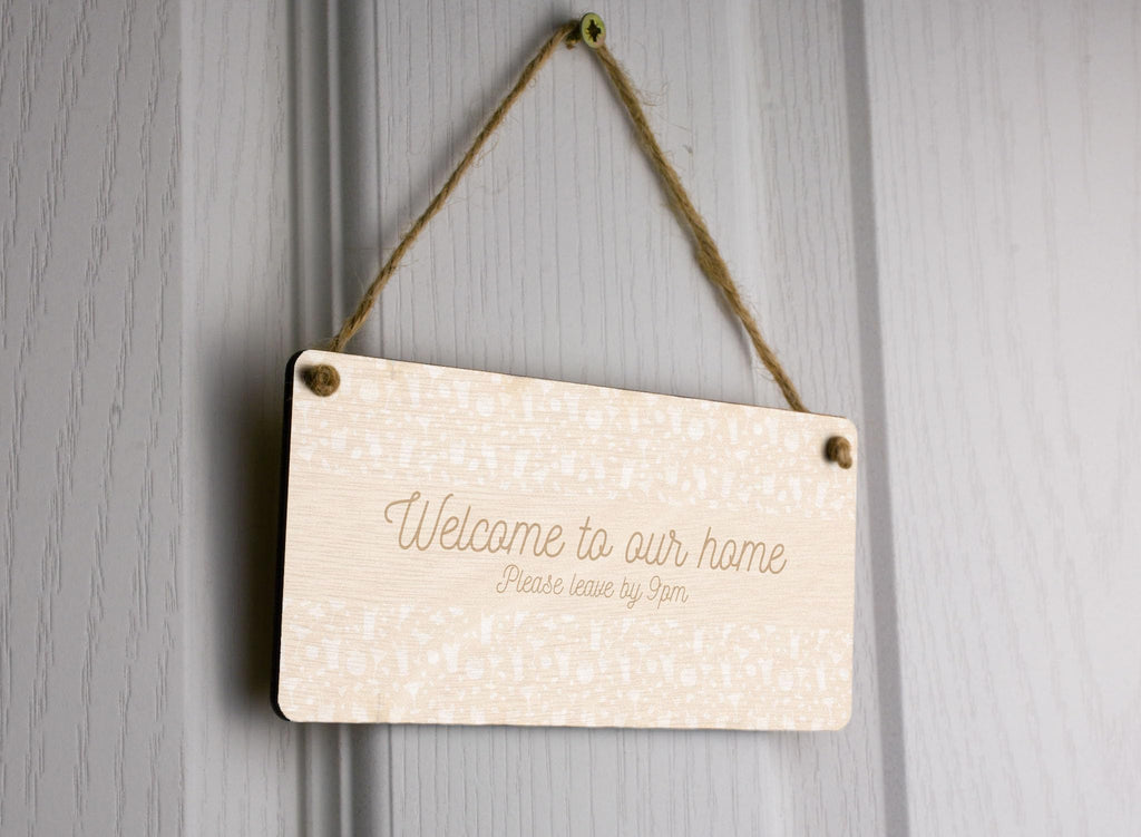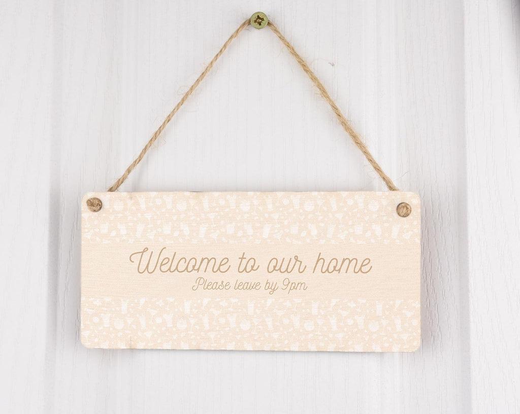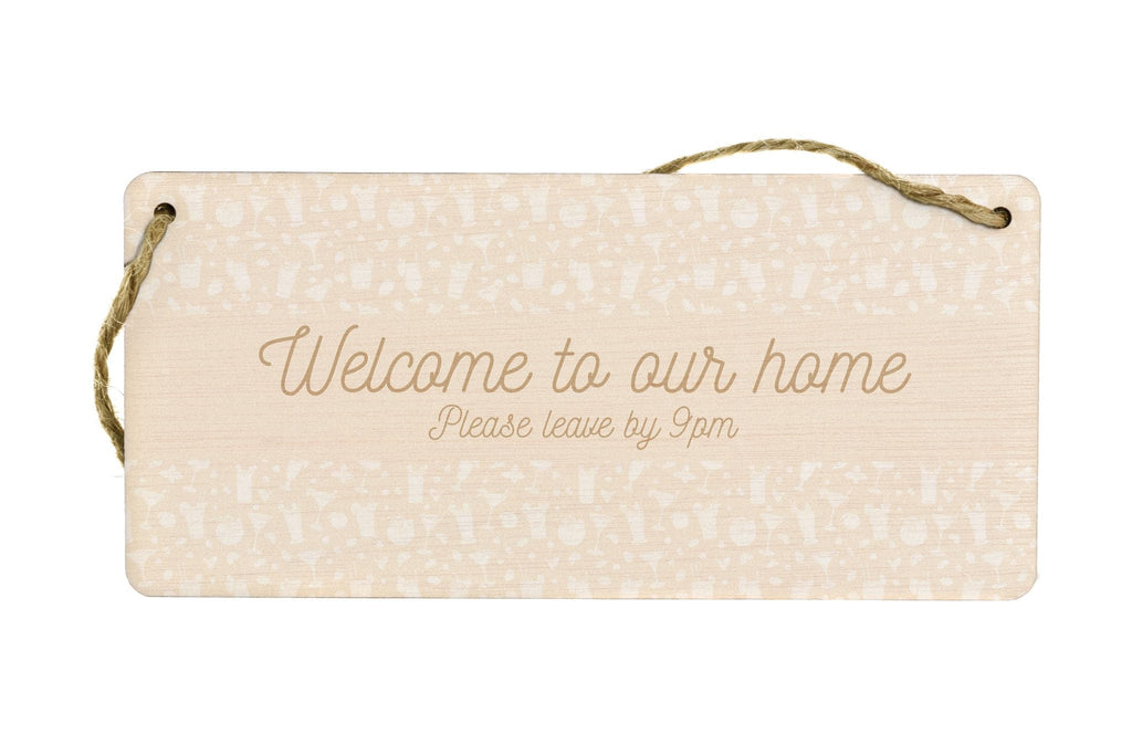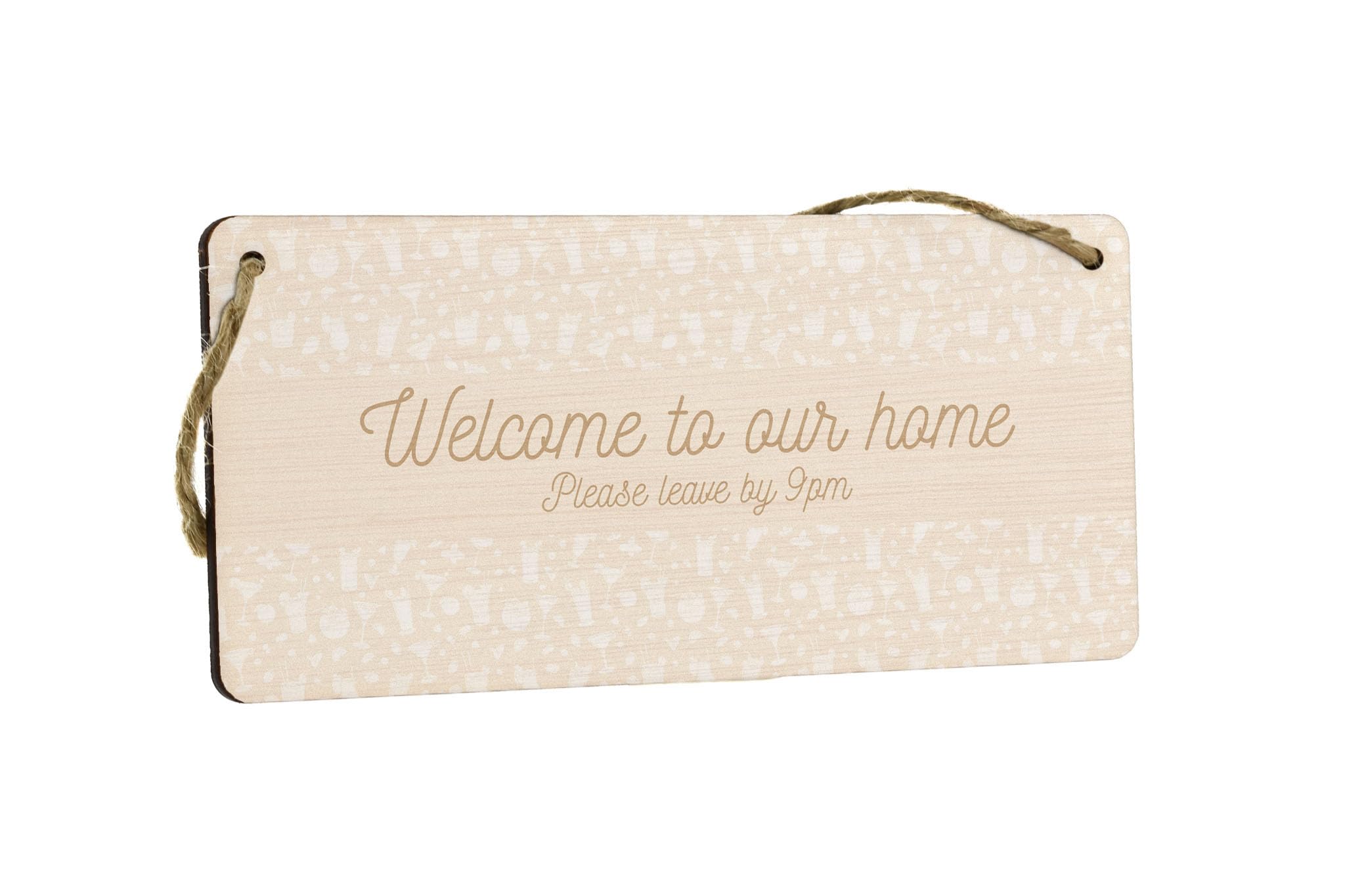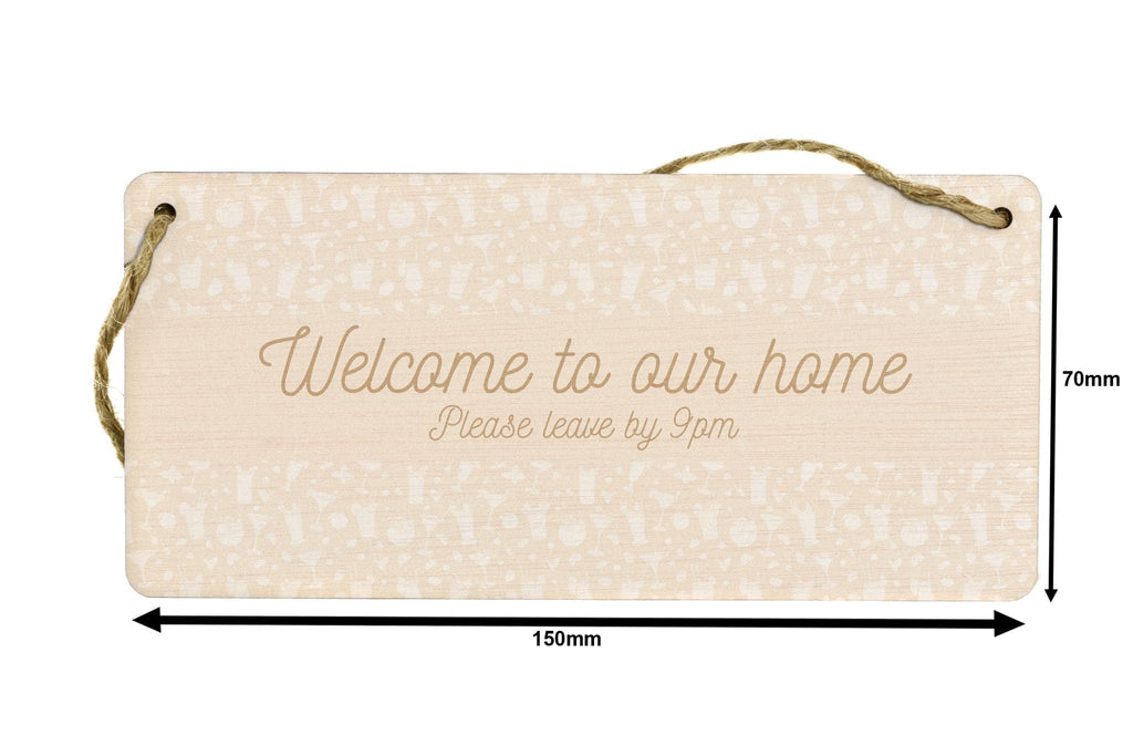 Add a touch of humour to your home decor with our Funny Plywood Hanging Room Sign. This sign is the perfect novelty gift for family and friends, featuring a full colour design with brown writing on a light brown background. The sign reads 'Welcome to Our Home, Please Leave by 9pm' with cocktail glasses patterned background. Hang this sign in your living room, bedroom, or any room in your home to set a lighthearted tone for your guests. Whether you're looking for a gift for your wife, husband, girlfriend, boyfriend, son, daughter, or siblings, this sign is sure to bring a smile to their face.