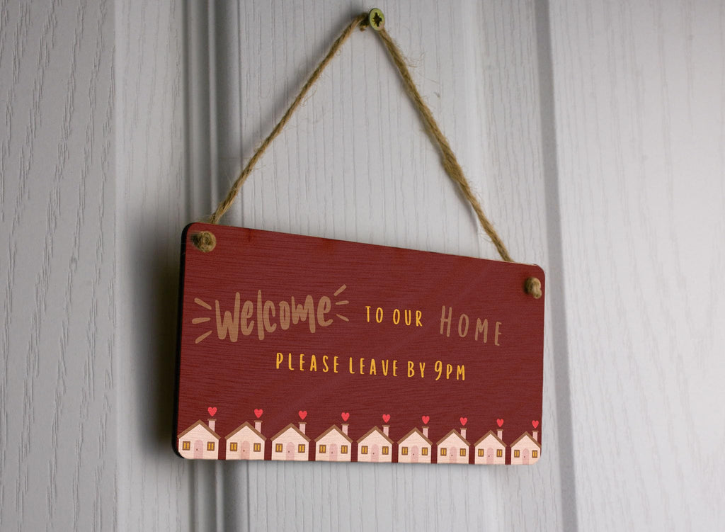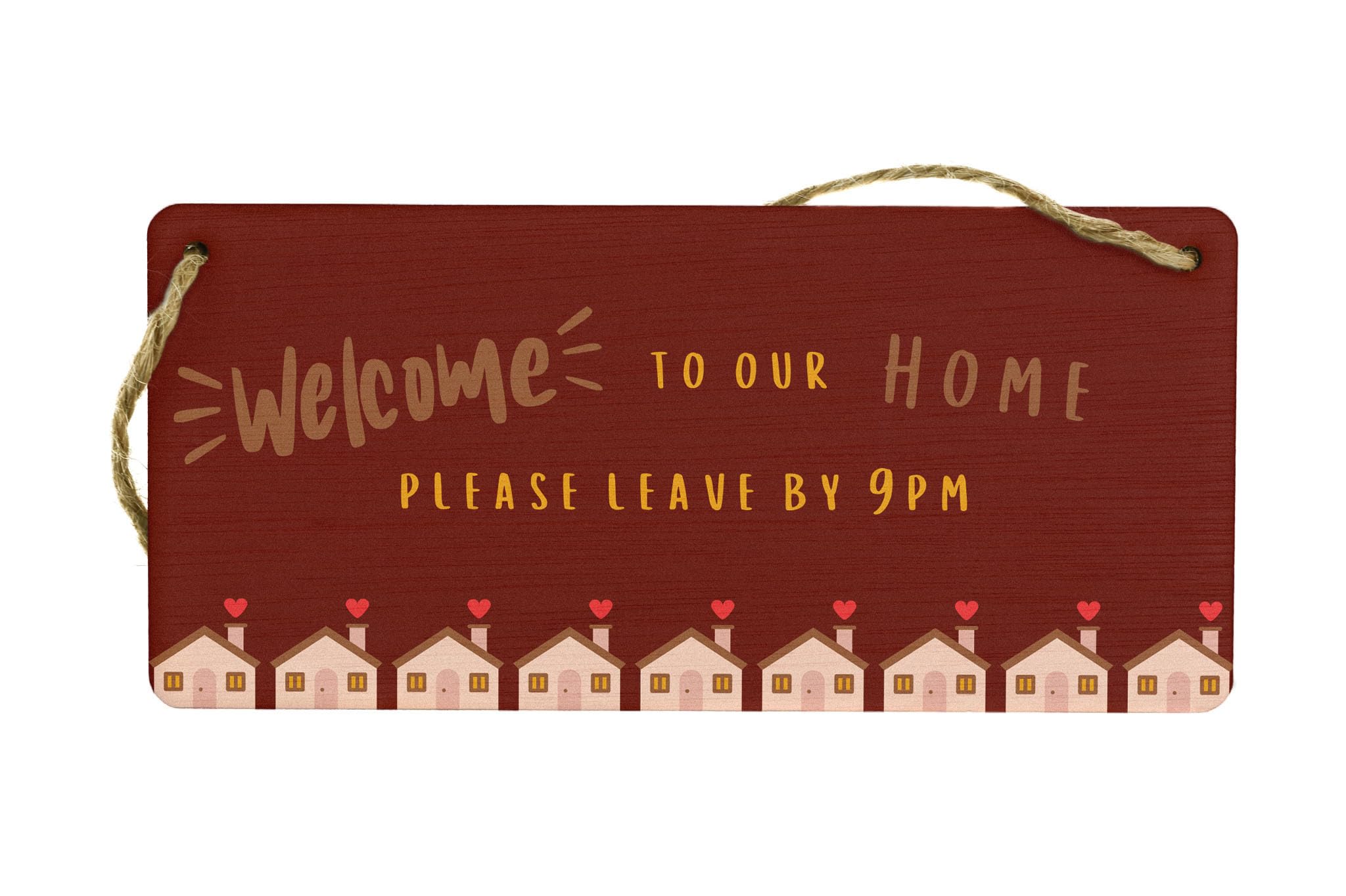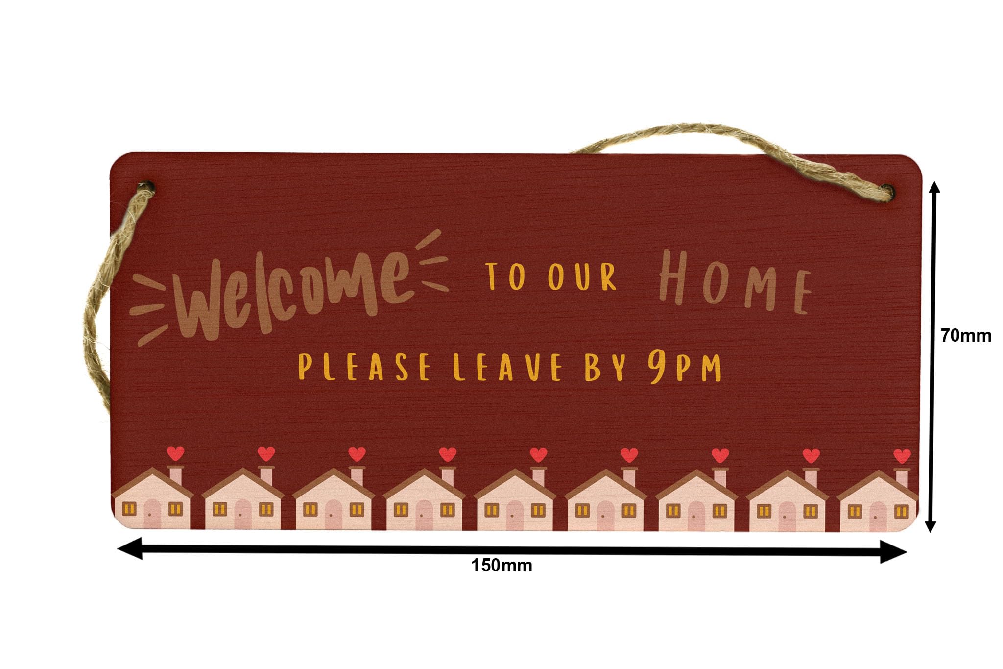 • Adds a touch of humour to your living space with the message 'Welcome to our home please leave by 9pm'