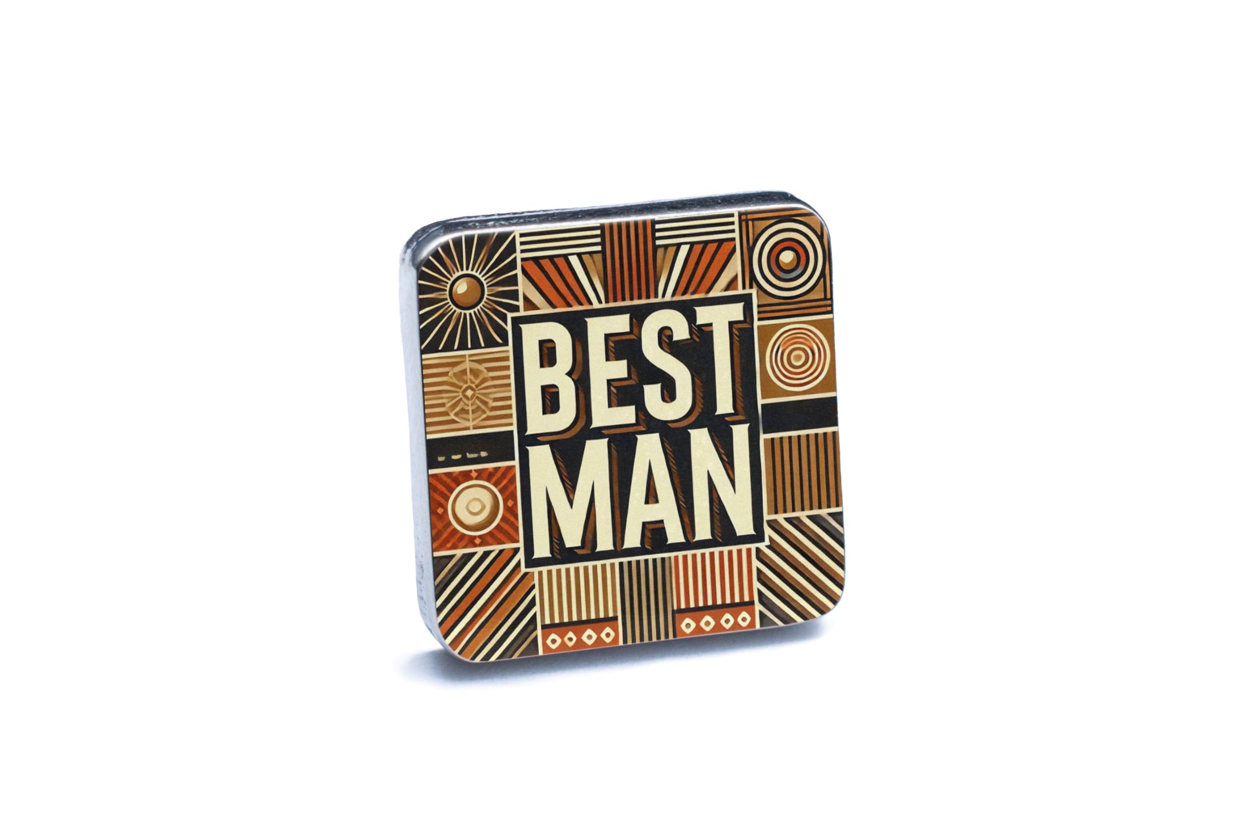 These handcrafted tin and pewter cufflinks with a UV printed design are the perfect addition to any groom's party outfit. The elegant geometric pattern cufflinks are a modern take on retro-style cufflinks, adding a touch of art deco flair to your formal wear. The unique gift for groomsmen features a full-colour printed design that reads 'best man', making it a special memento for your best man on your wedding day. These stylish cufflinks are a must-have accessory for any groom looking to accessorize with a touch of sophistication and style.