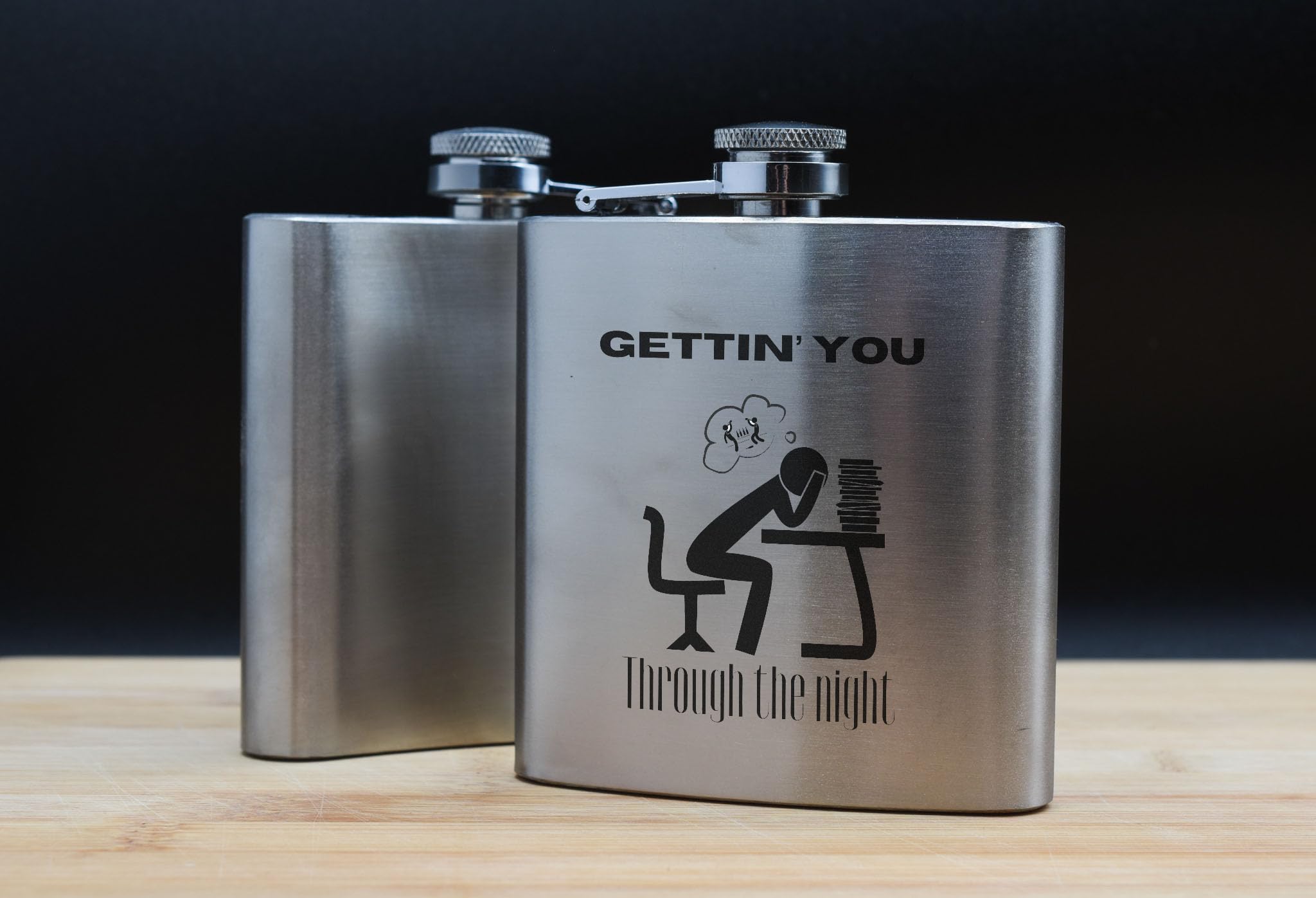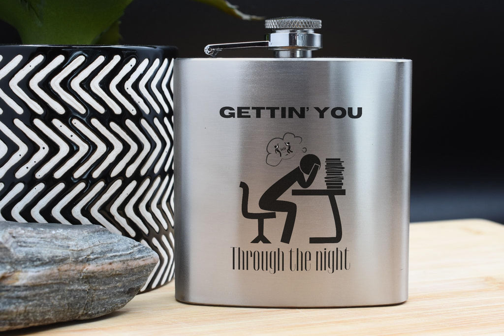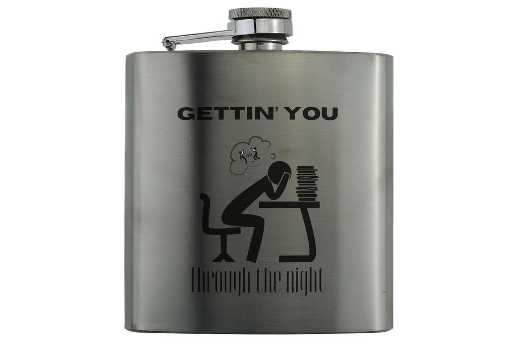 Introducing our Funny Novelty Stainless Steel Hip Flask - Gettin' You Through the Night! This stainless steel hip flask is the perfect companion for when you need a little pick-me-up. Whether you're filling it with whiskey, rum, gin, vodka, or any other favourite spirit, this flask will keep your drink safe and secure. The black writing on the flask reads 'gettin you through the night', accompanied by a black shadow image of a person at their desk, clearly thinking about partying. This novelty hip flask is a great gift for family and friends, whether it's for your wife, husband, girlfriend, boyfriend, son, daughter, or siblings. Give the gift of laughter and spirits with this unique stainless steel hip flask!