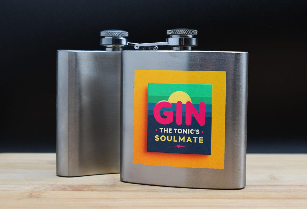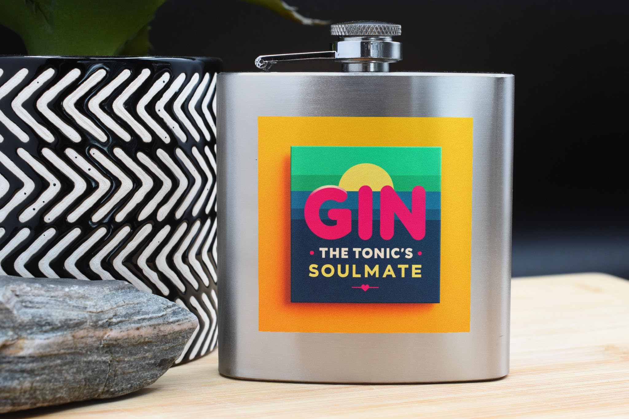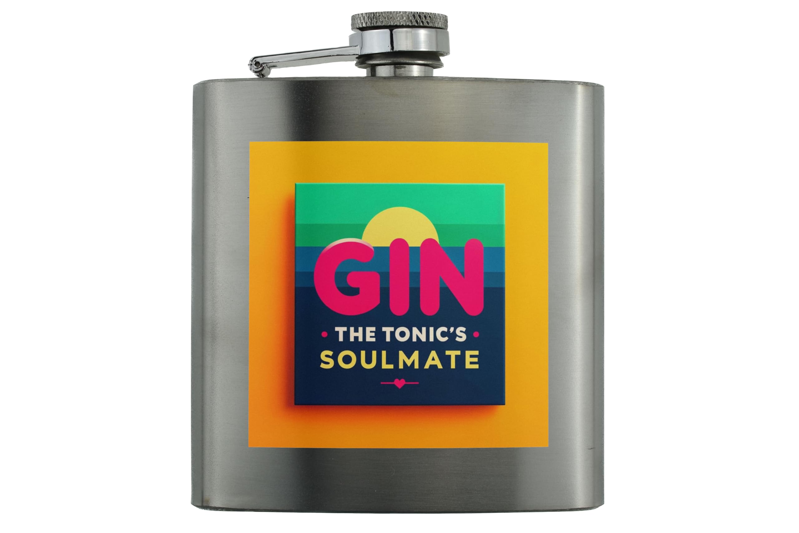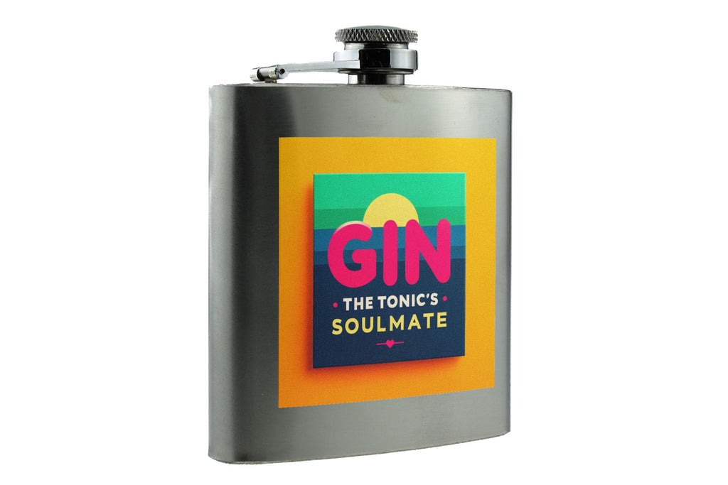 Introducing the Gin Lover's Soulmate Flask - Colourful Sunset Design! This novelty item is the perfect tonic companion for any gin fan. With its fun and quirky design, this stainless steel flask is a must-have for any gin lover. The full colour printed flask features a unique AI generated artwork, showcasing a colourful sunset inspired retro design that is sure to impress at any party. The flask reads 'gin - the tonic's soulmate', making it a humorous and thoughtful gift for any gin enthusiast. This portable drinkware is not only practical but also a stylish accessory for any gin lover. Treat yourself or your loved one to this colourful hip flask today!