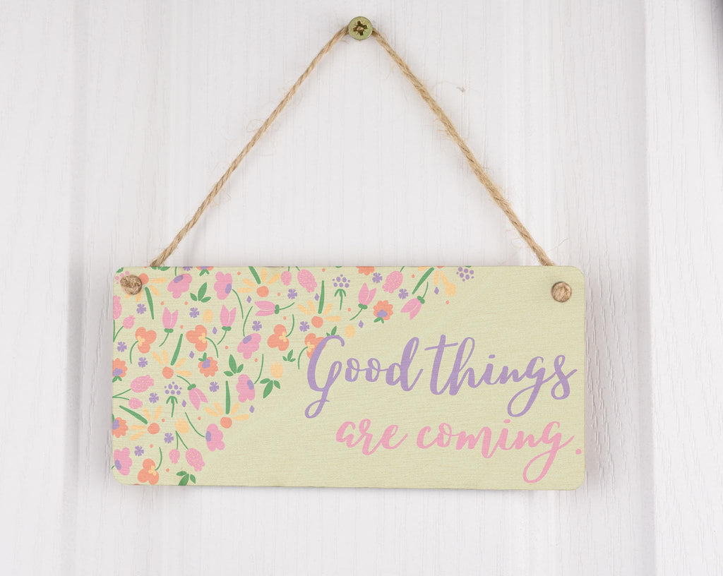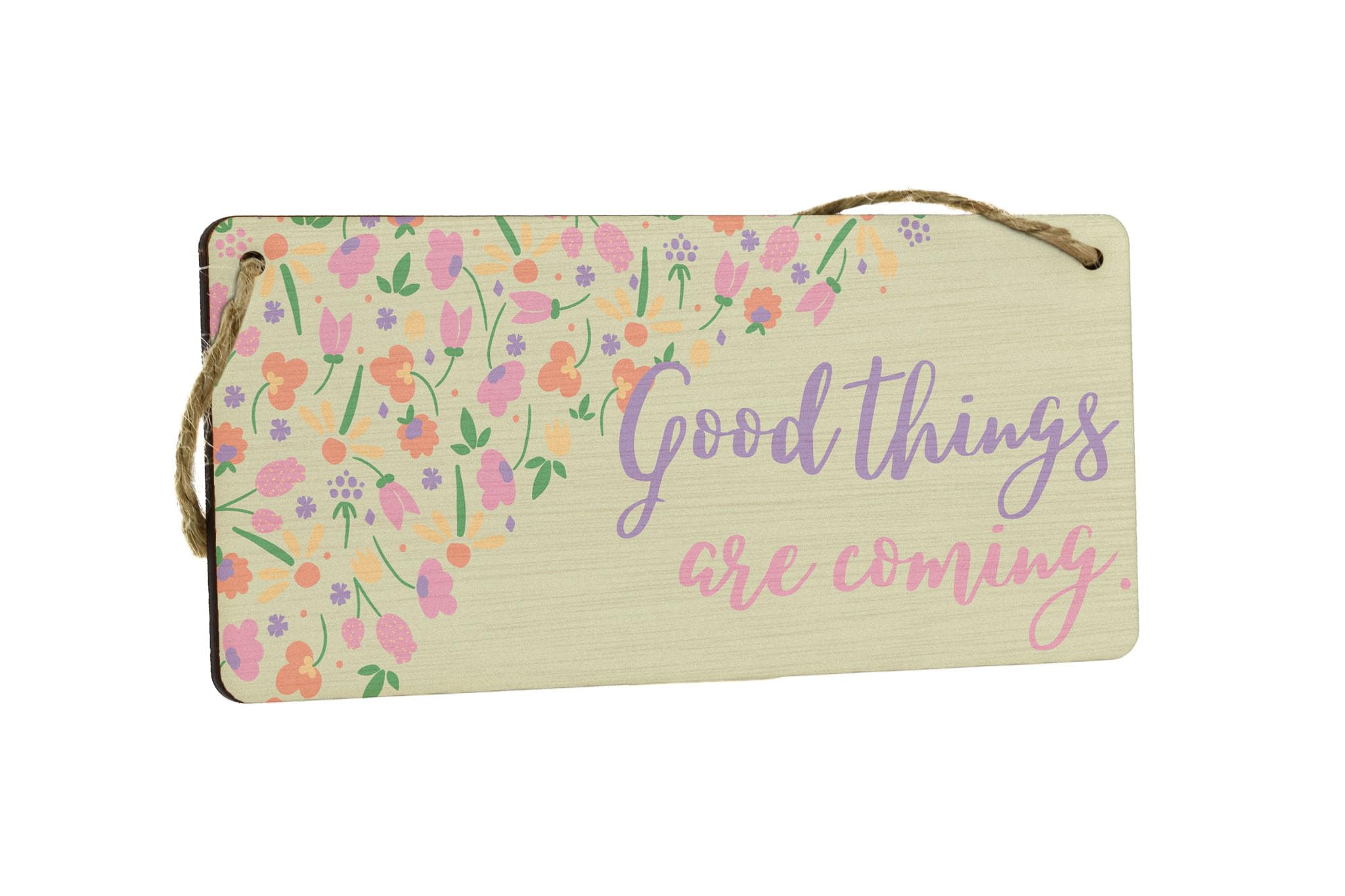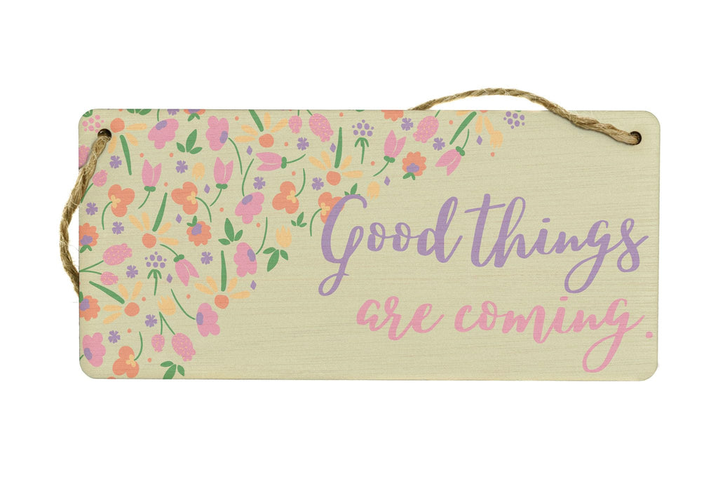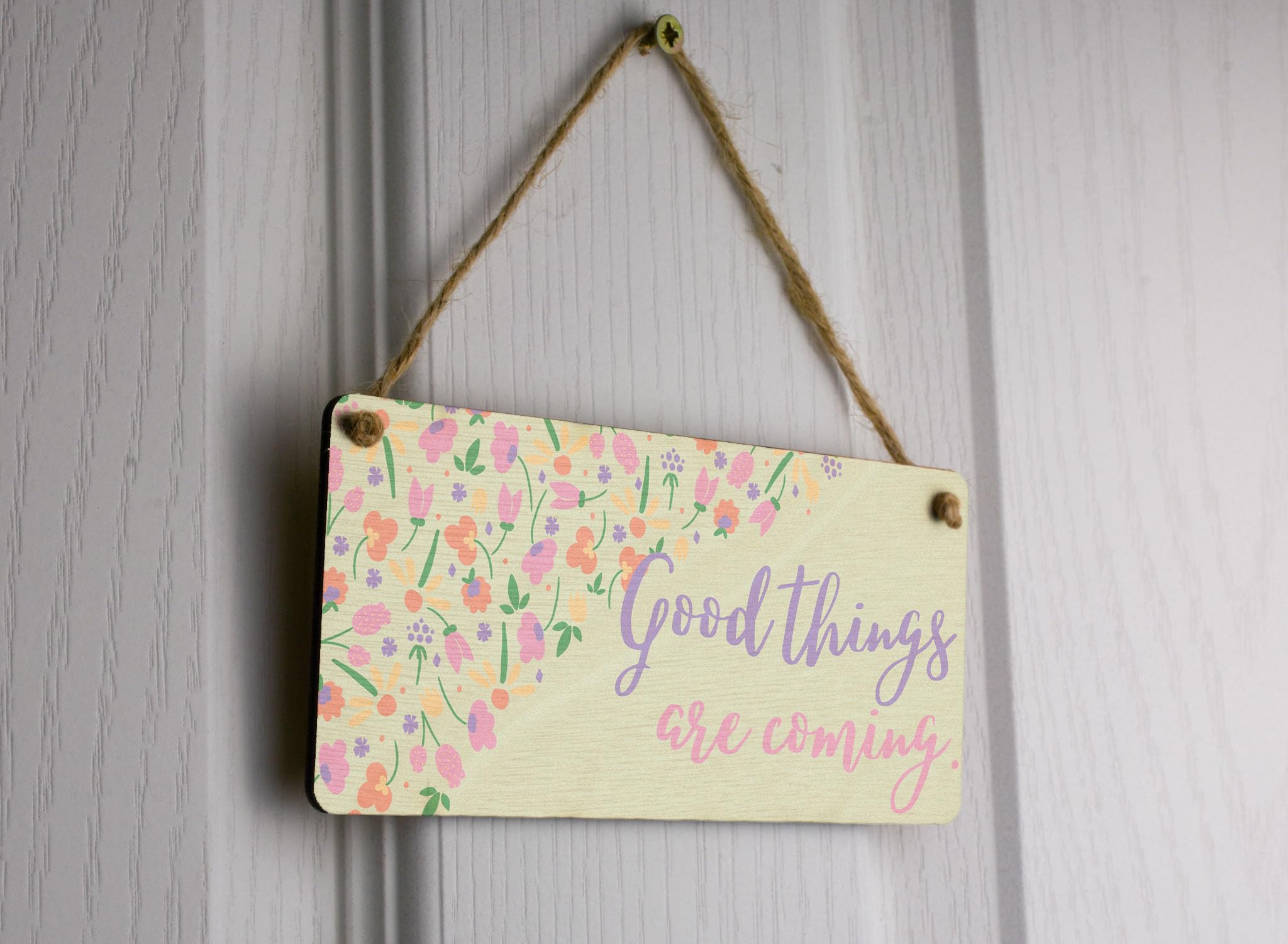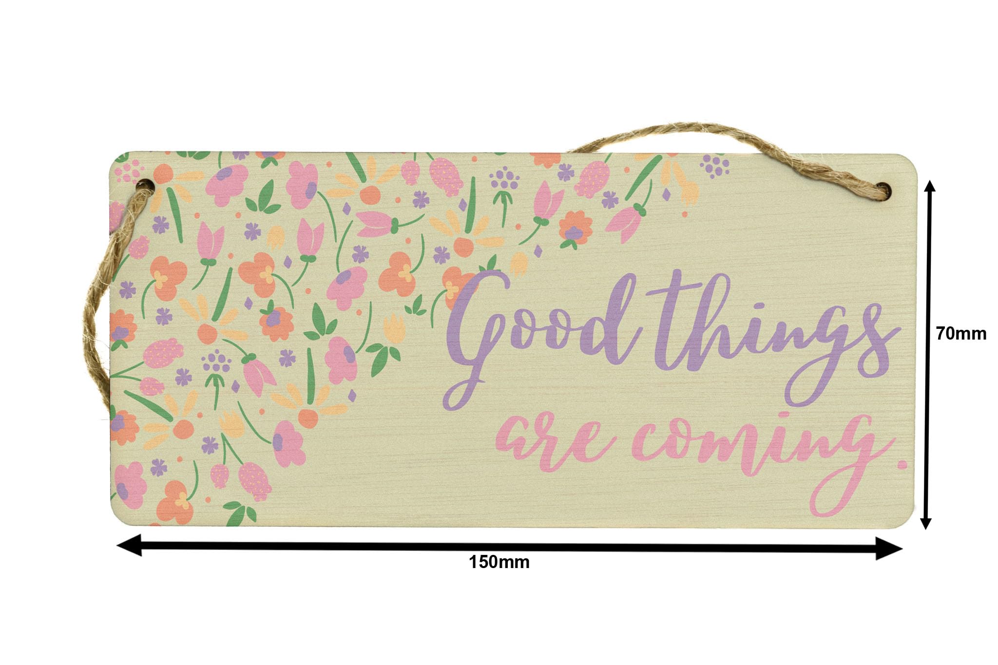 Introducing our Good Things are Coming - Plywood Hanging Room Sign - a beautiful addition to any home decor. Made from quality plywood, this hanging sign features an uplifting message that reads 'Good Things are Coming' in vibrant purple and pink writing. The pale green background adds a touch of tranquillity and the beautiful images of flowers bring a sense of natural beauty to any room. This sign is the perfect gift for family and friends, including your wife, husband, girlfriend, boyfriend, son, daughter, and siblings. It will add a positive touch to any home, spreading love and optimism throughout the space. Hang it on your door, in your living room, bedroom, or any other room you desire. Simple yet impactful, this plywood hanging sign is a must-have for your home decor collection.
