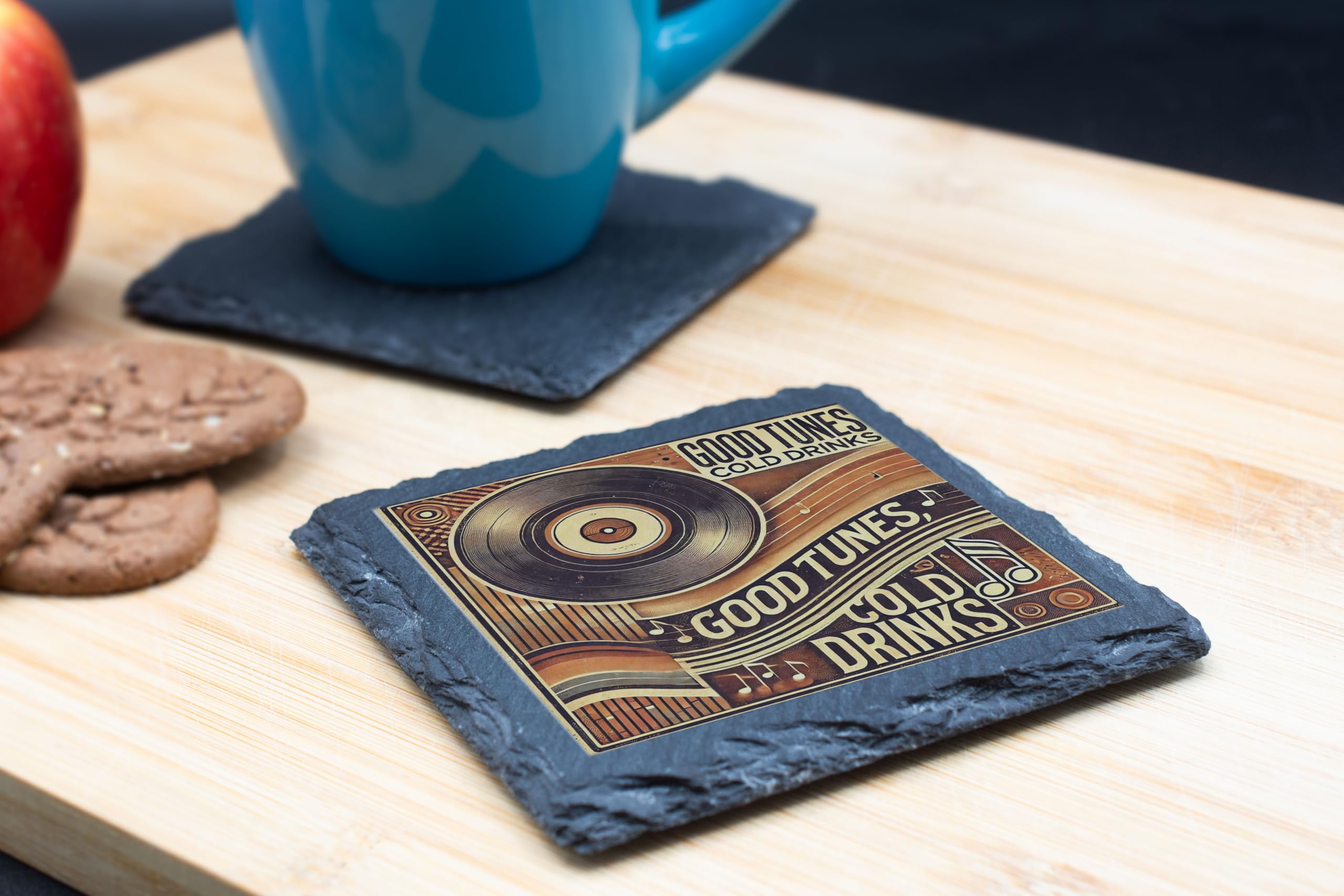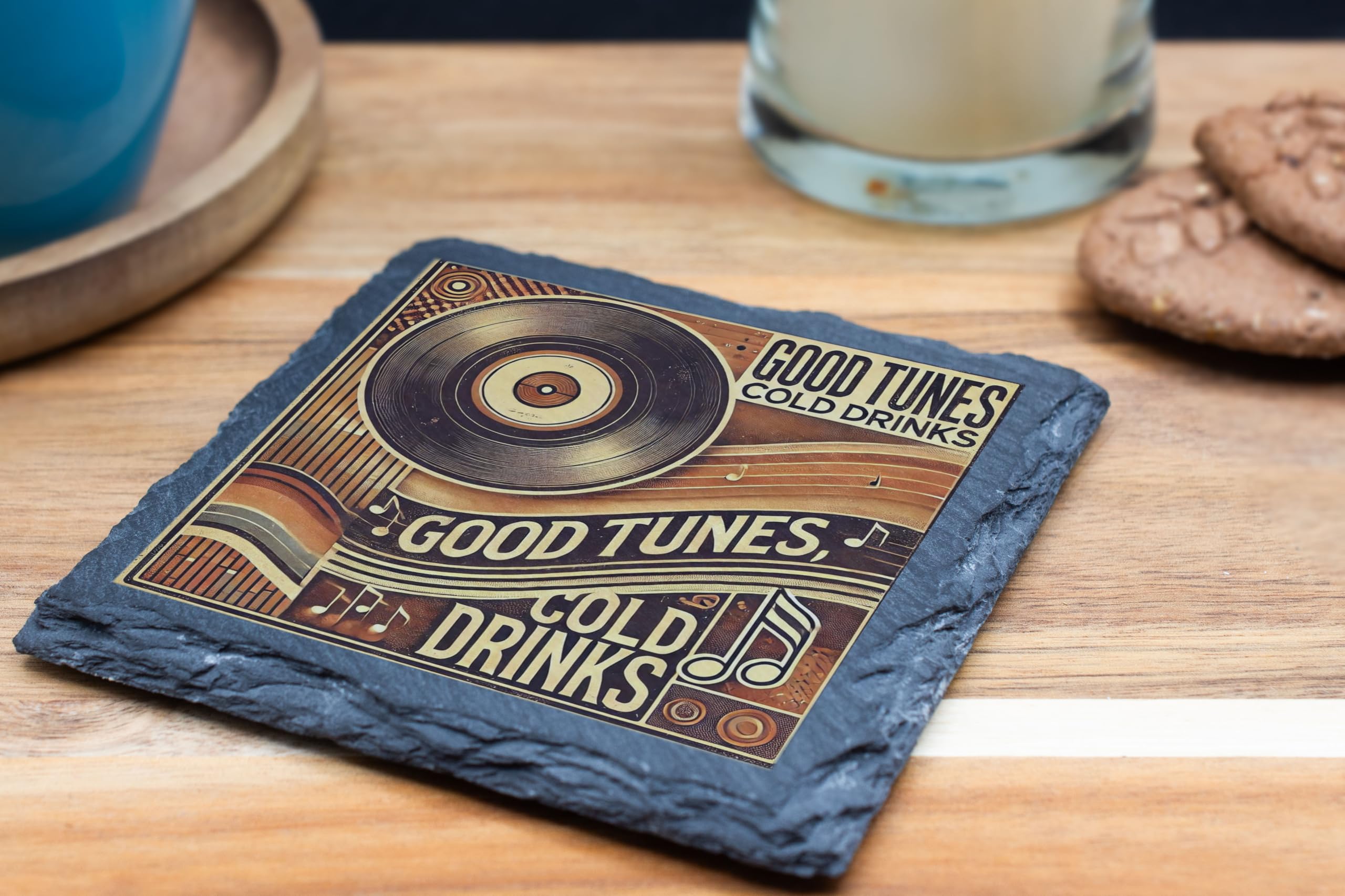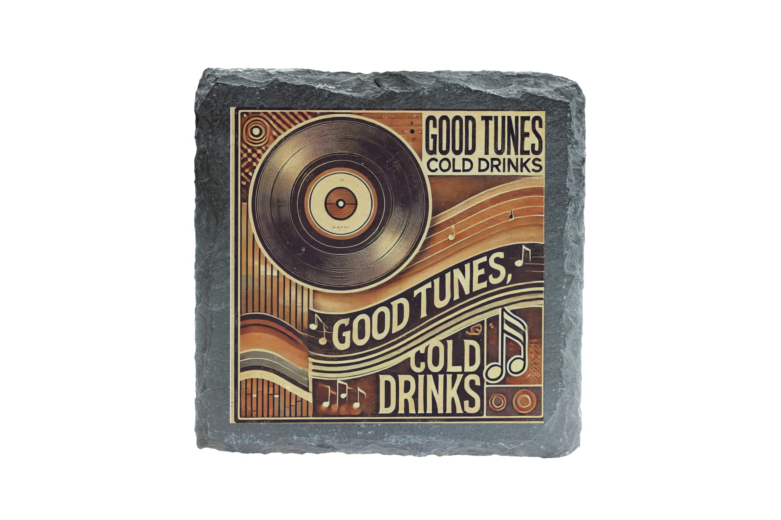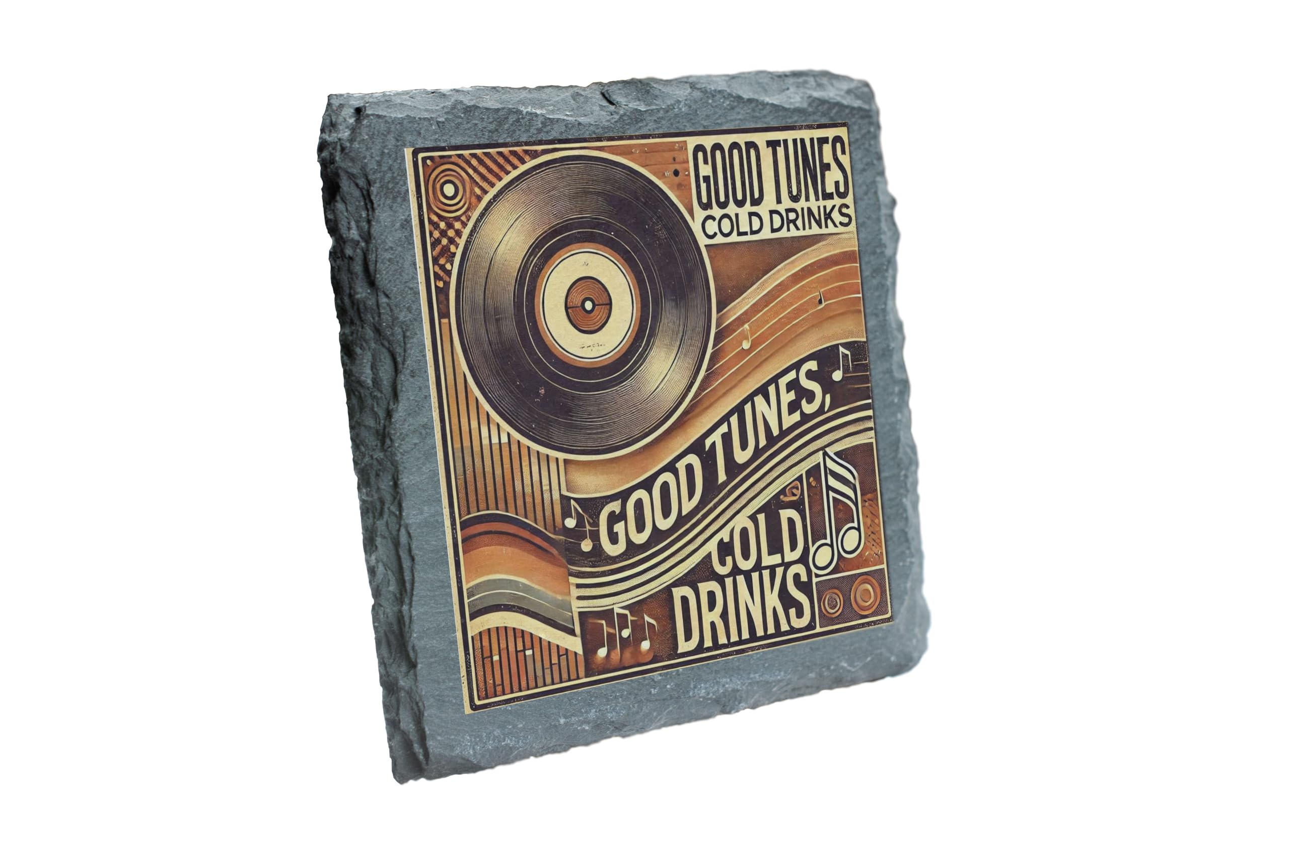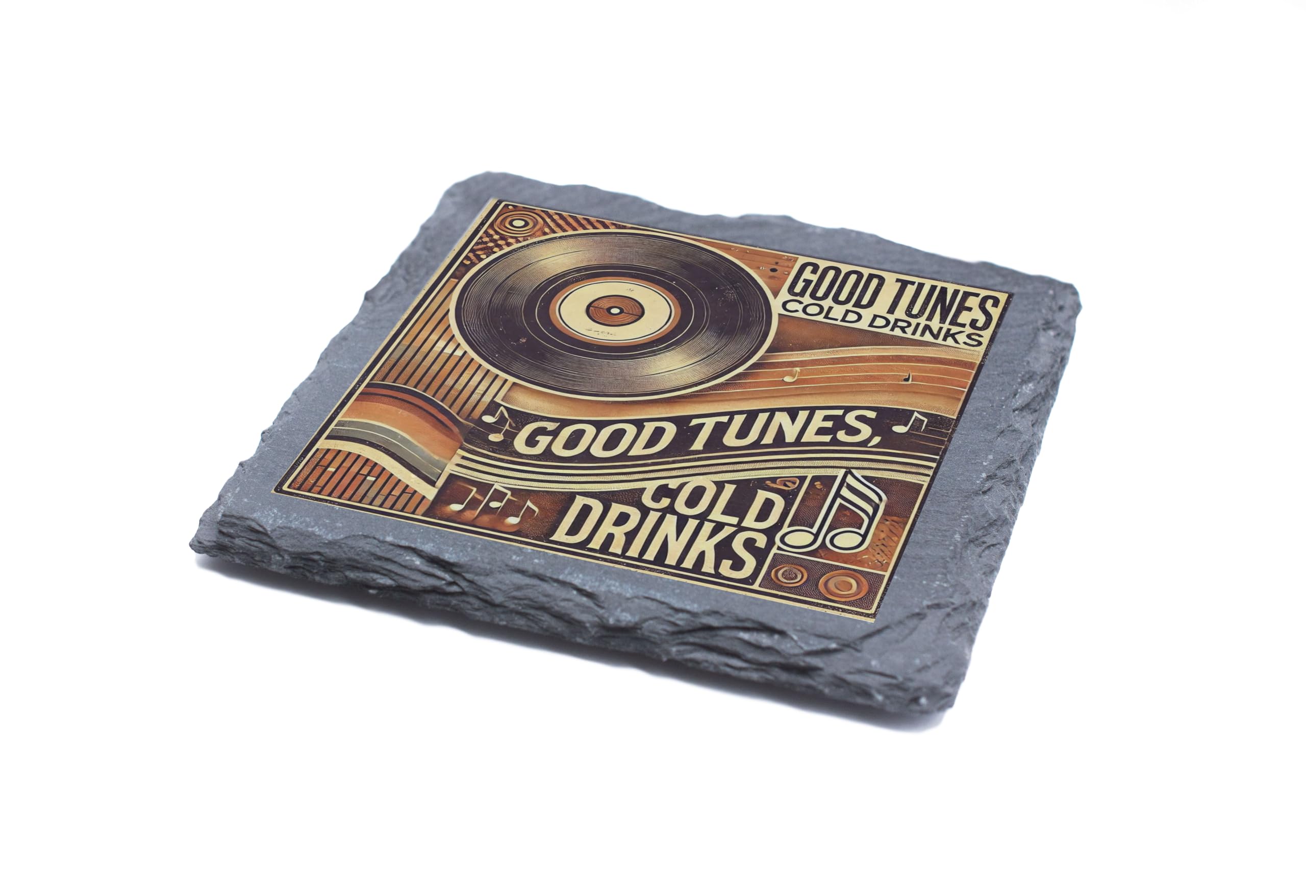 Celebrate the perfect combination of good music and refreshing drinks with the "Good Tunes, Cold Drinks" Slate Drinks Coaster. Made from durable slate stone, this coaster brings a touch of retro charm to any setting with its classic vinyl record design and nostalgic vibes. Whether you're hosting a party, relaxing with friends, or searching for a unique gift for the music lover in your life, this coaster is the ultimate accessory. It?s not just practical for protecting your surfaces from moisture and scratches ? it?s a conversation starter that will be admired by all. Perfect for home bars, music rooms, or man caves, this coaster offers both style and functionality. Its easy-to-clean surface ensures long-lasting use, making it a must-have for music and drink enthusiasts alike. Keep the tunes flowing and the drinks cold with this timeless coaster!