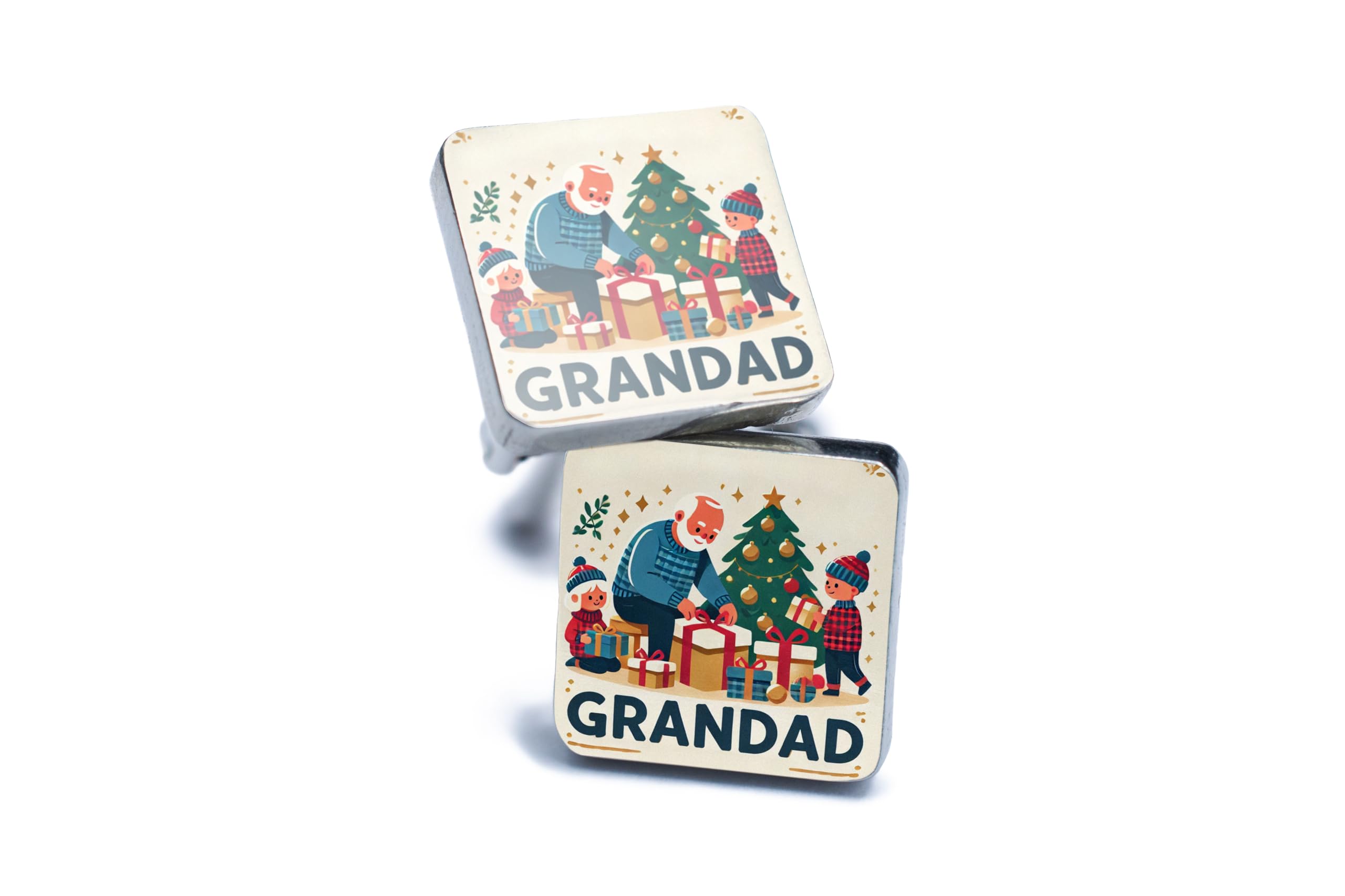 - Festive and Heartwarming Design: Celebrate the joy of Christmas with these charming cufflinks featuring a cheerful grandad and grandchildren scene under the Christmas tree.