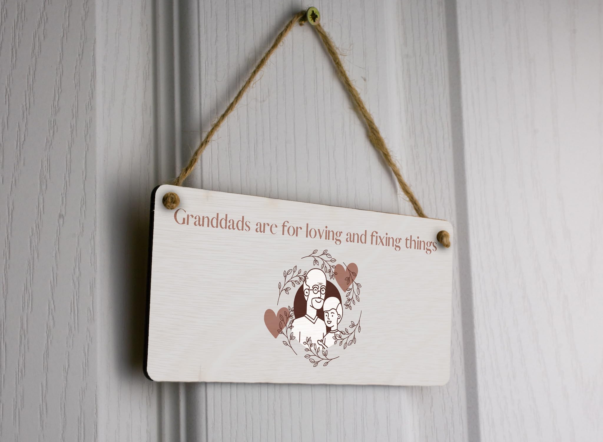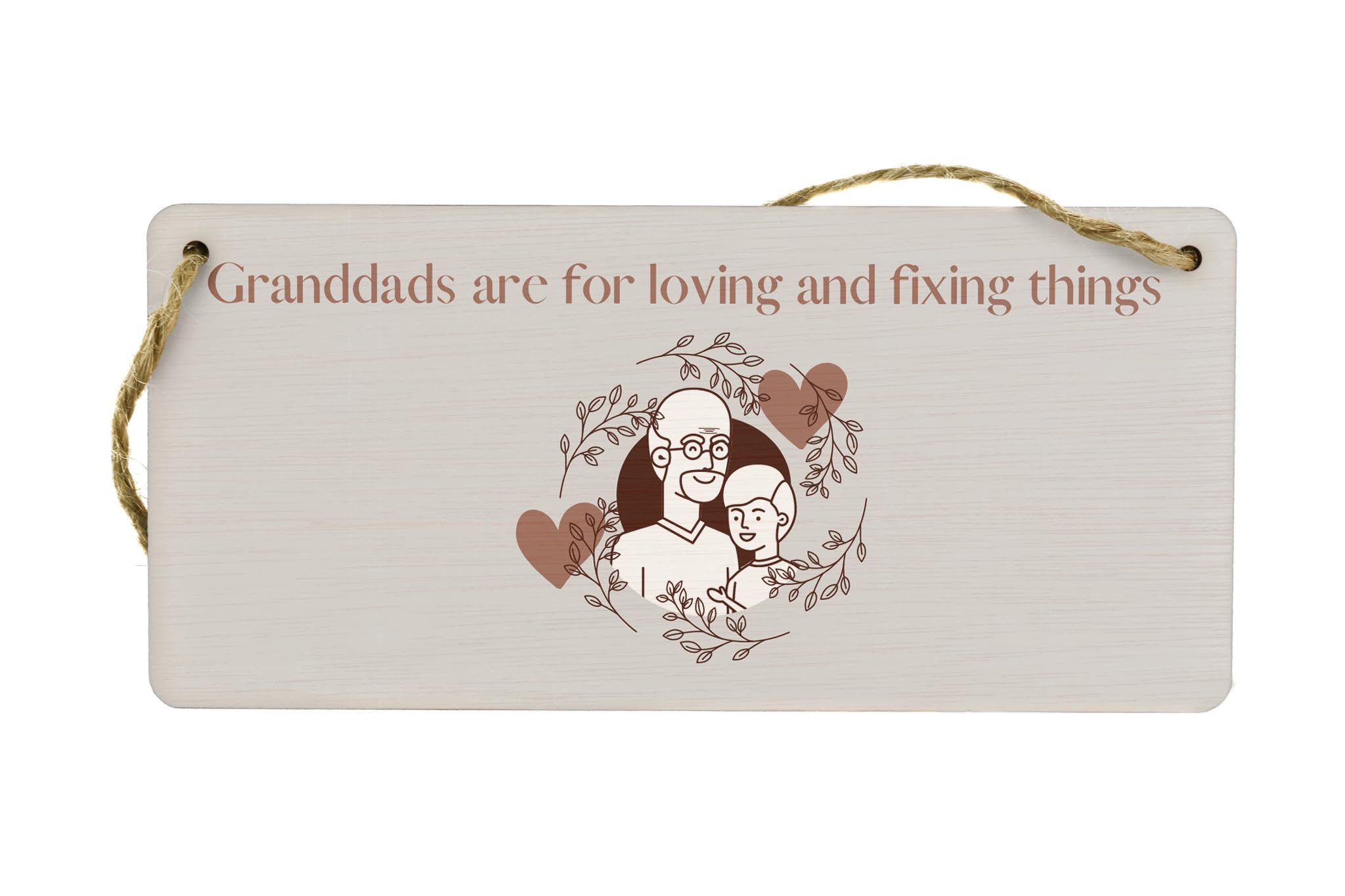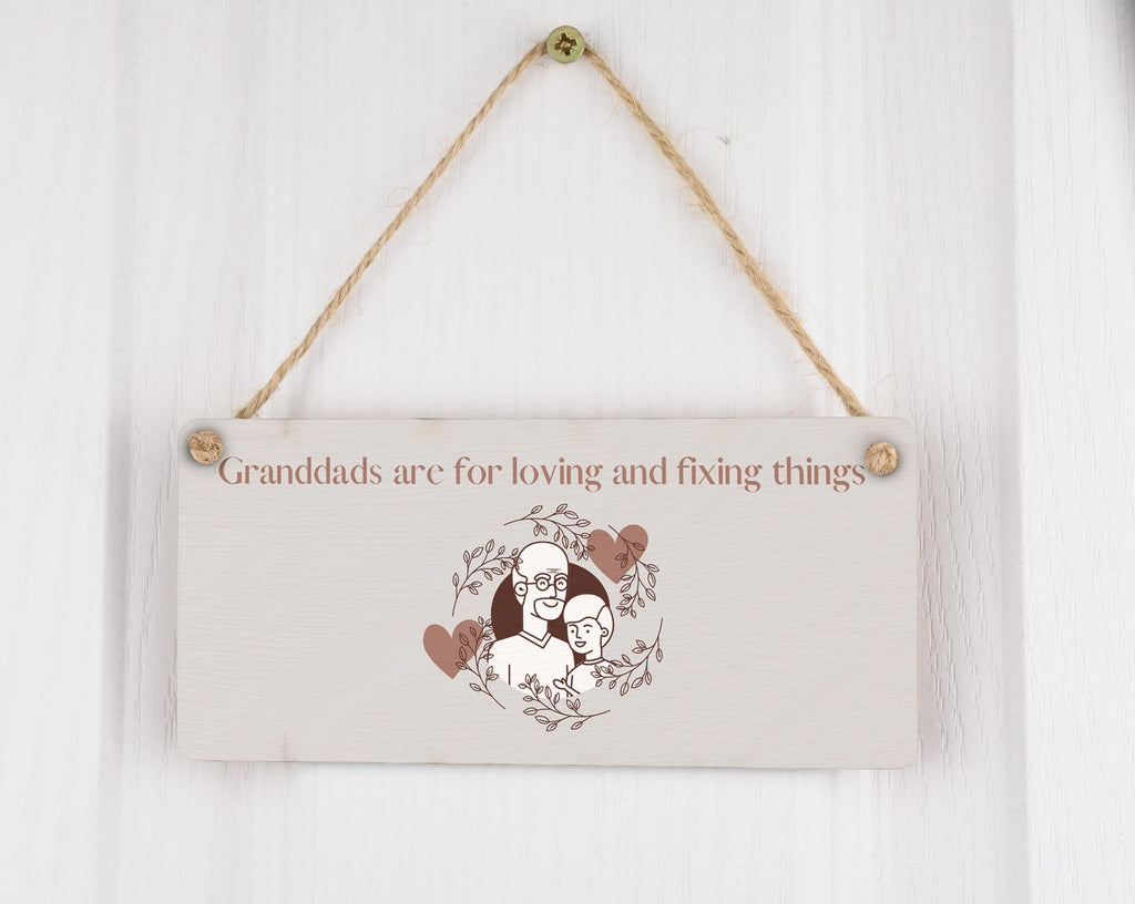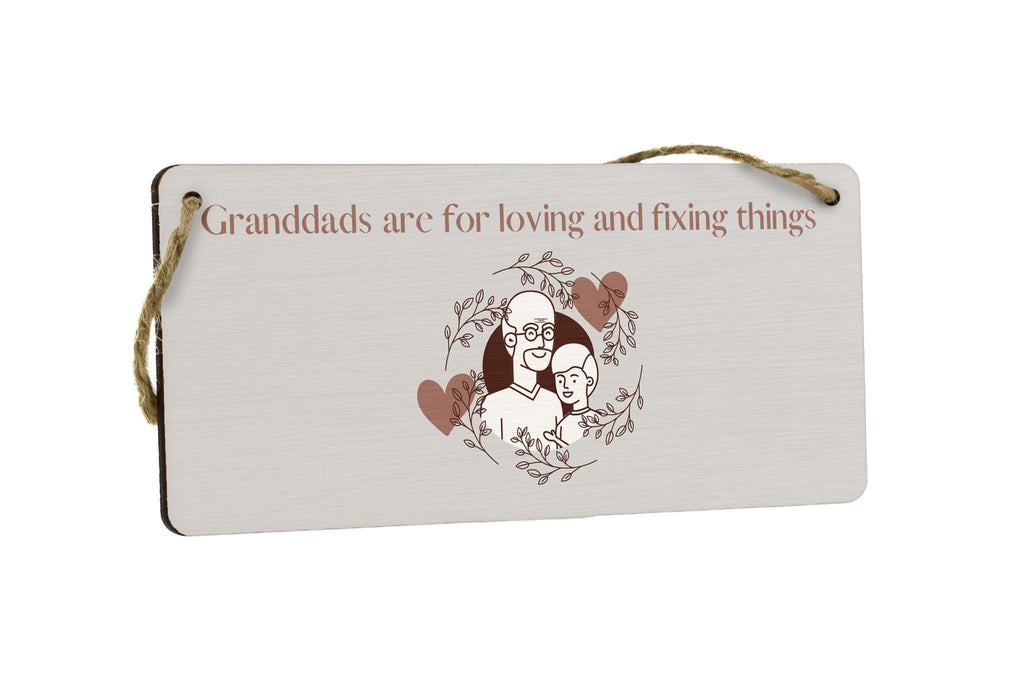 Enhance your home decor with this beautiful and heartwarming Grandad's Love & Fix Wooden Hanging Sign. Made from premium quality plywood, this hanging sign is a perfect gift for any grandparent. The sign features a charming quote that reads 'Grandads are for loving and fixing things', capturing the essence of their role in our lives. With its rustic and elegant design, this wooden sign will add a touch of warmth and love to any living room. Whether you're celebrating Father's Day, birthdays, or simply want to show your appreciation, this Grandad Sign is the ideal choice for expressing your love for your grandfather. It also makes a thoughtful and sentimental gift for any occasion, and a perfect addition to your home decor collection.