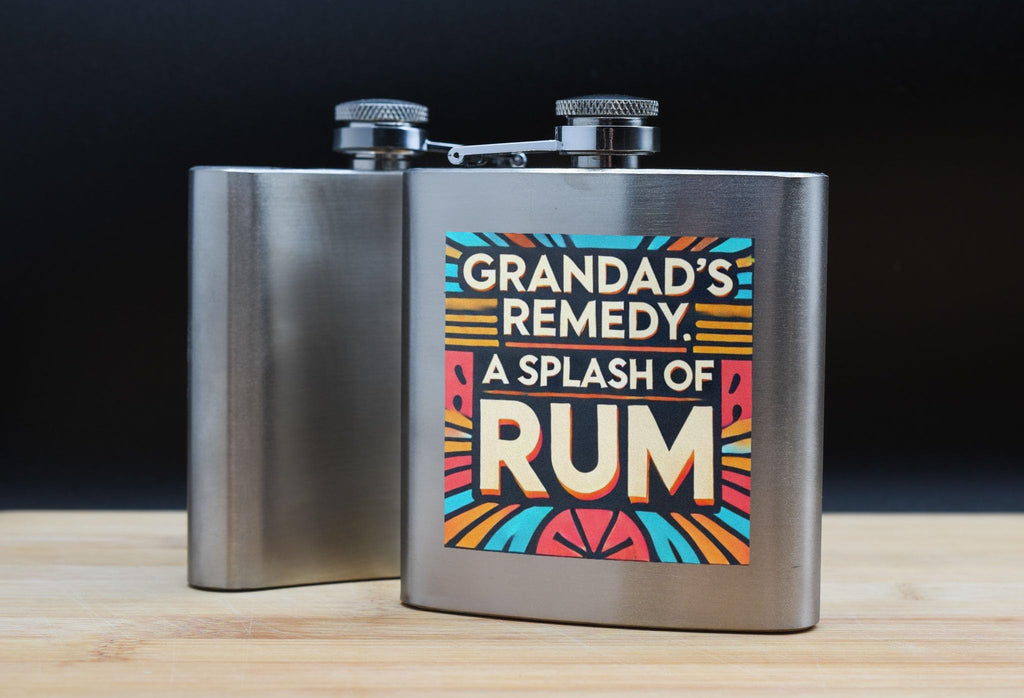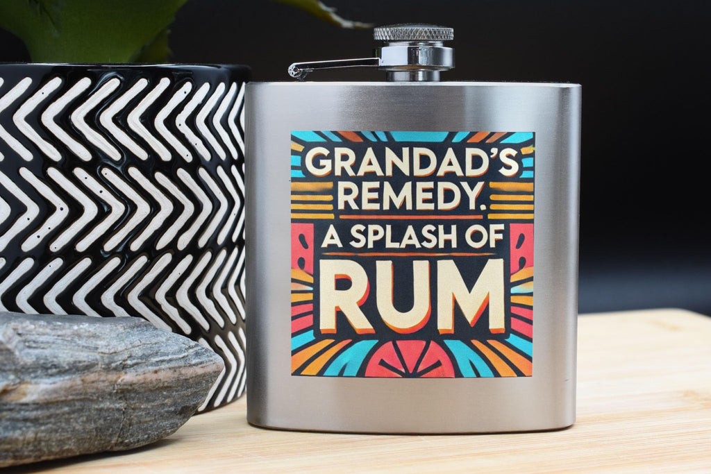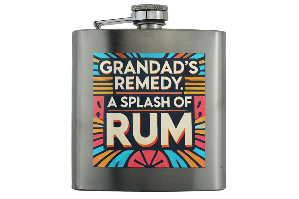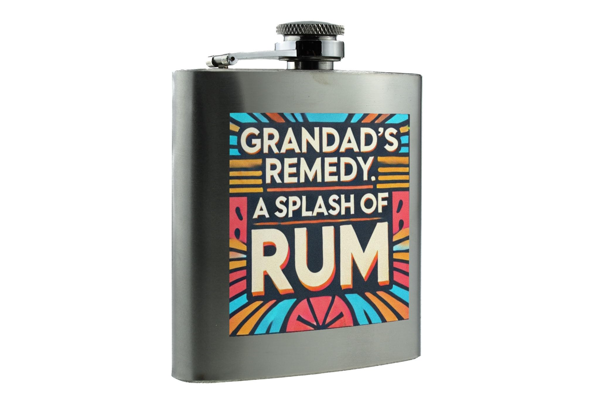 Introducing Grandad's Remedy: the perfect gift for the rum lover in your life! This novelty stainless steel rum flask features a colourful design that is sure to bring a smile to Grandad's face. This portable drinkware is ideal for taking a splash of rum on the go, with a pocket-sized design that makes it easy to carry wherever you go. The unique rum flask is a funny and quirky gift idea, ideal for adding a touch of humour to any occasion. The flask features UV printed artwork that reads 'Grandad's Remedy. A Splash of Rum', making it a truly special gift for any Grandad. The full-colour printed flask showcases a vibrant pattern and text-based design, adding a pop of colour to your next drink. Treat your Grandad to this bright and fun flask and make him smile with every sip!