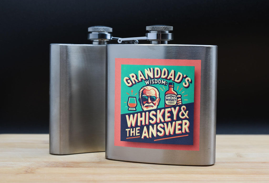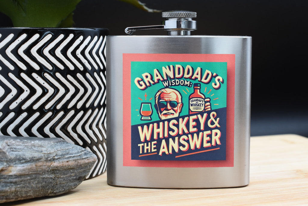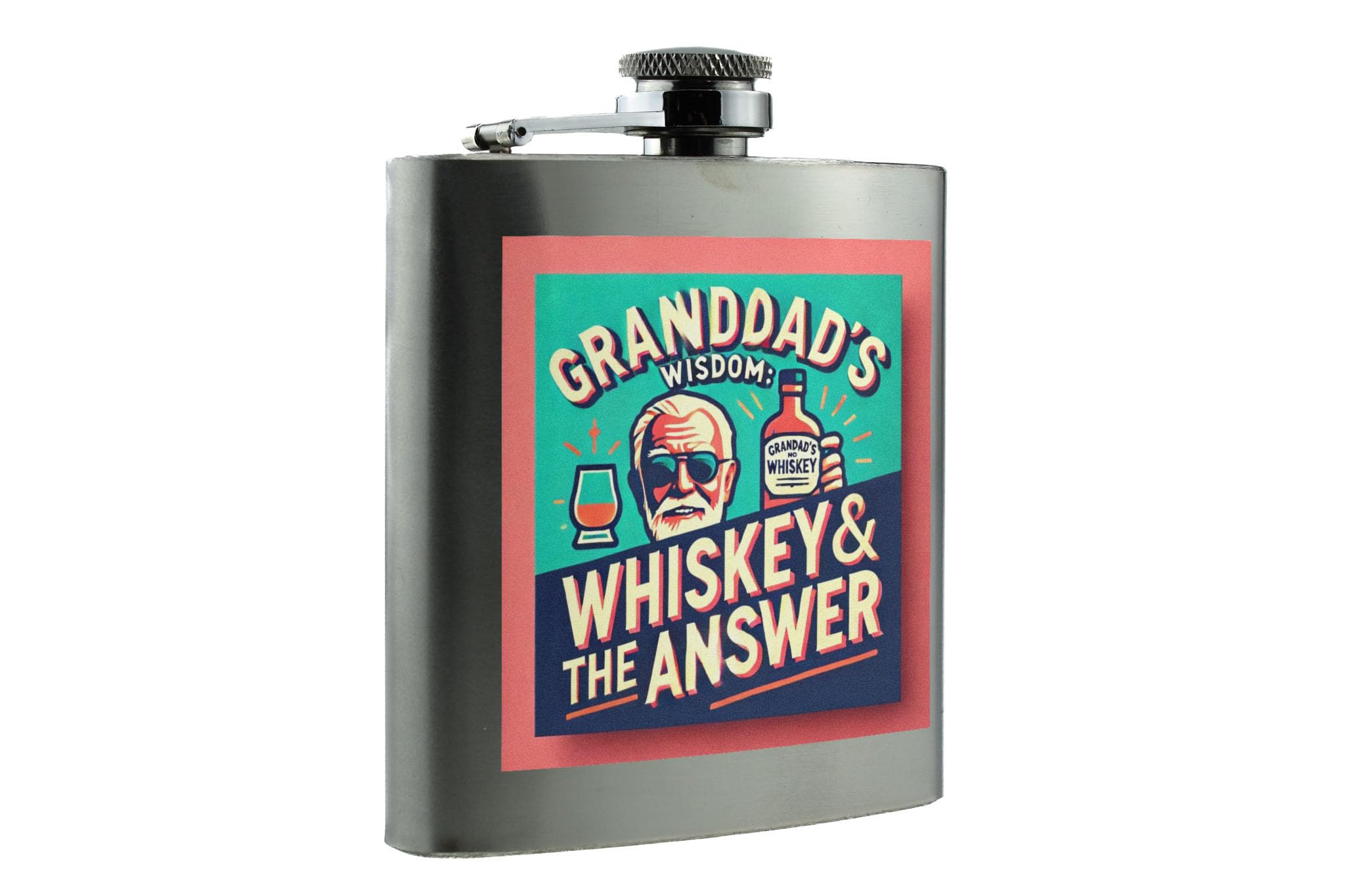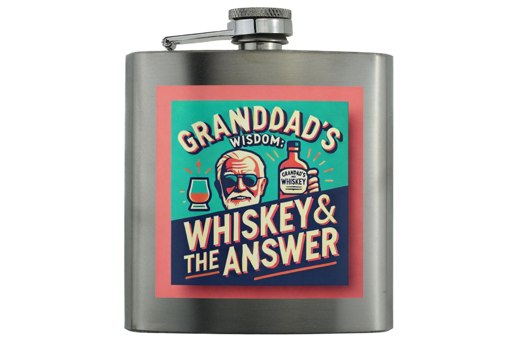 Introducing Granddad's Whiskey Wisdom Flask, the perfect gift for the whiskey lover in your life. This funny and nostalgic flask features a vintage-style design with a touch of humour. Made from quality stainless steel, this novelty item is durable and built to last. The UV printed artwork showcases AI-generated art that reads 'Grandad's Wisdom: Whiskey and the Answer'. Whether it's for grandad's birthday or Father's Day, this cool hip flask is sure to bring a smile to his face. Give a unique gift that will be cherished for years to come with this alcohol-themed drinkware.