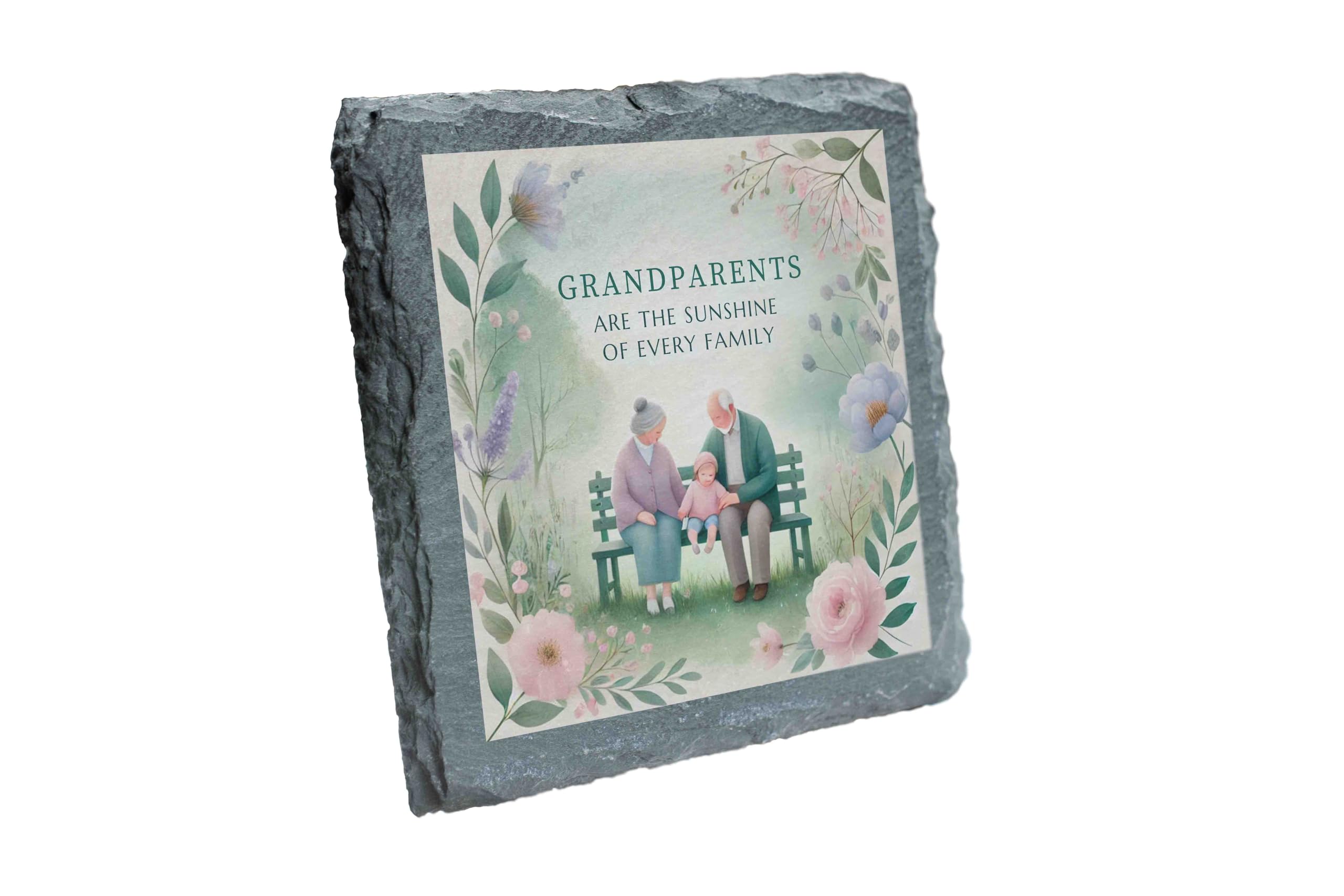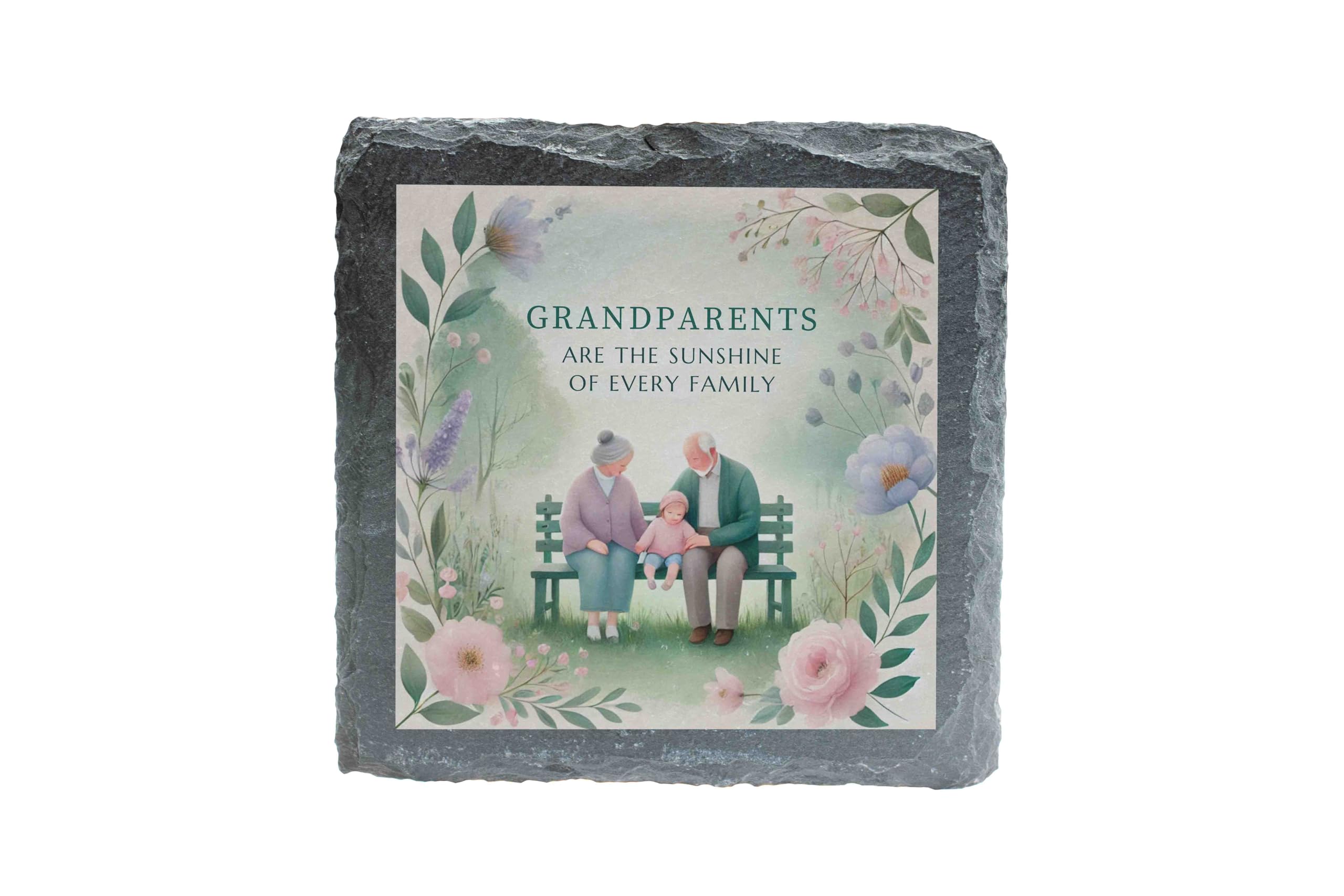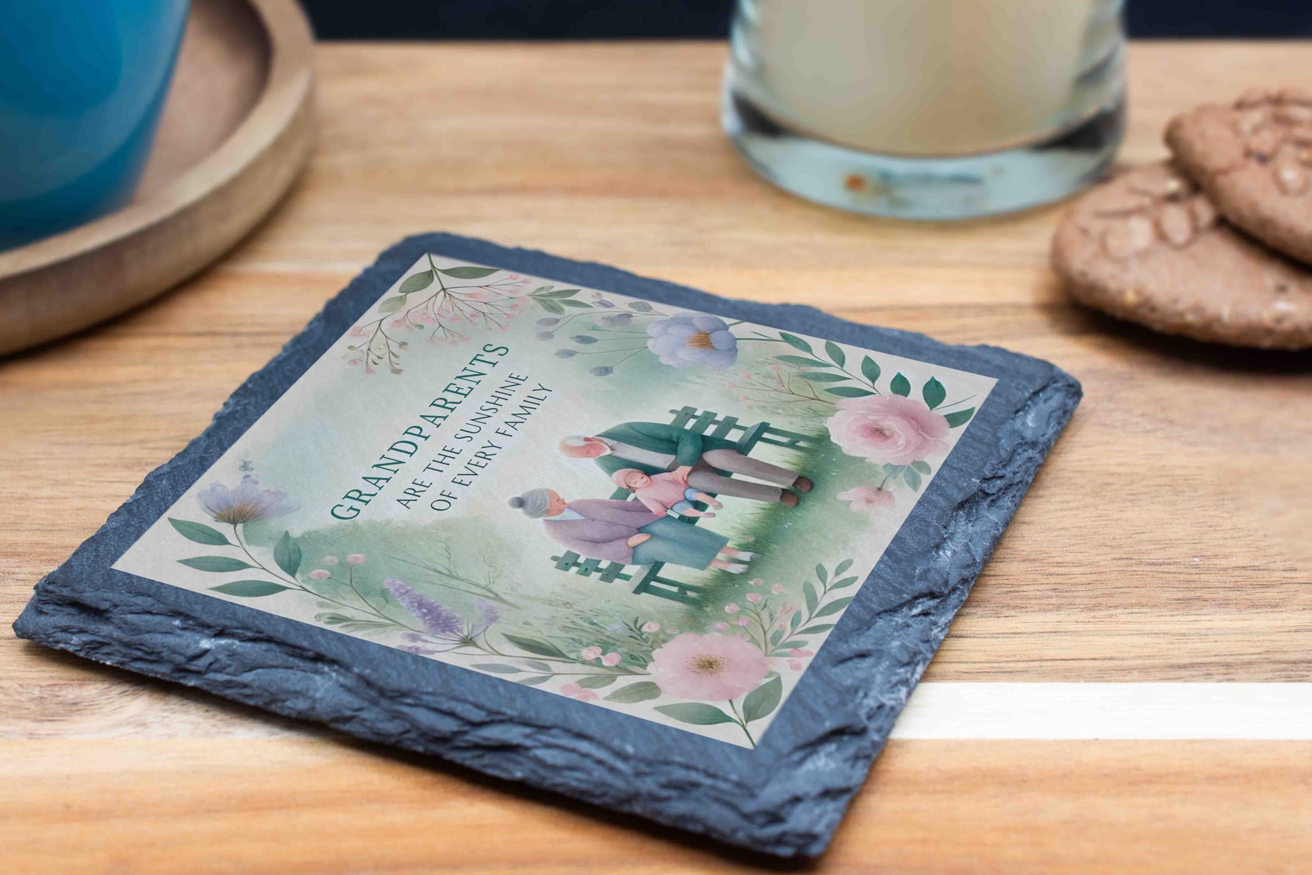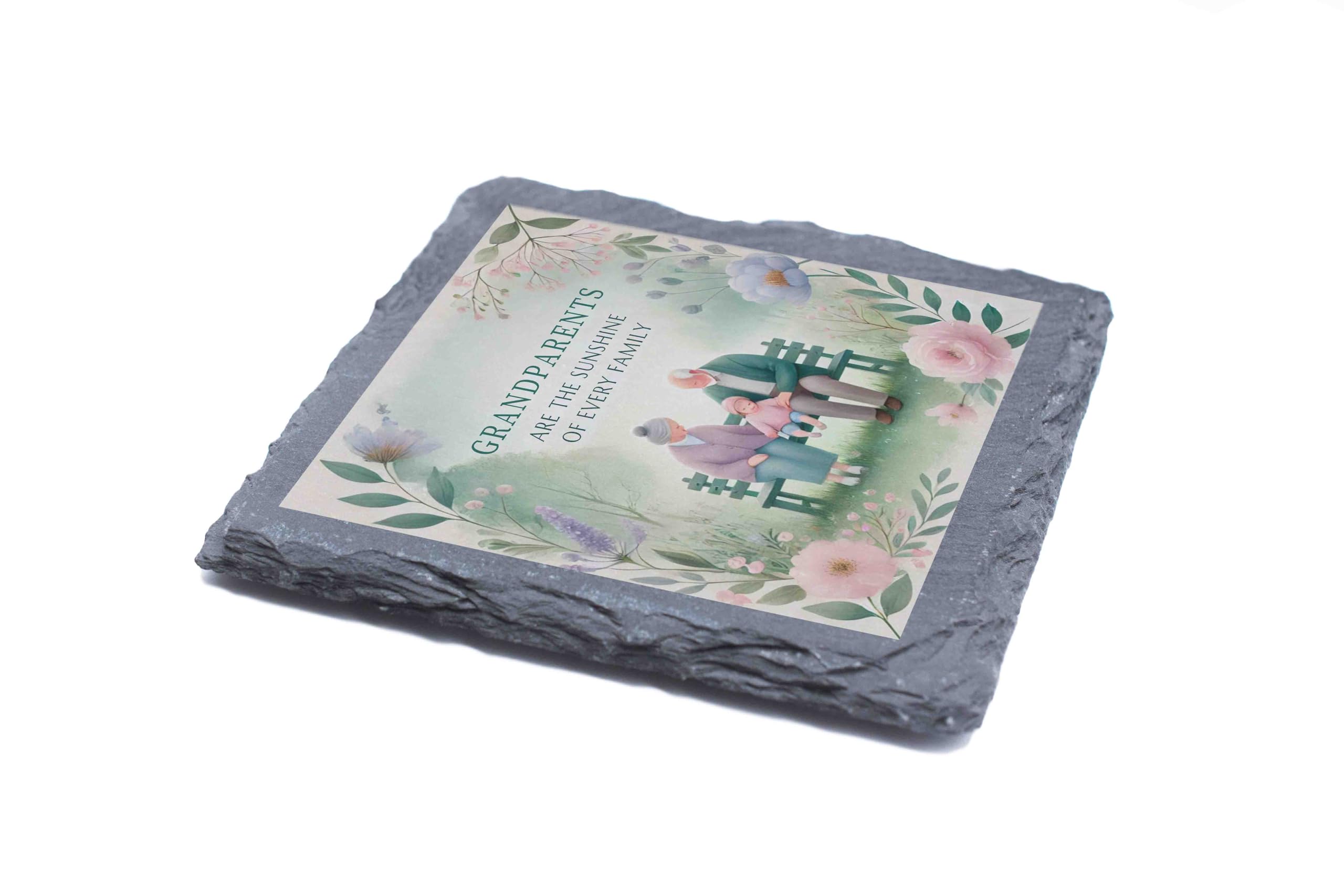 Celebrate the warmth, love, and guidance of grandparents with this beautifully crafted slate coaster. Featuring an endearing illustration of grandparents enjoying a moment on a park bench, surrounded by pastel flowers, and the touching phrase, "Grandparents are the Sunshine of Every Family," this coaster is a heartfelt reminder of their cherished role in our lives. Crafted from durable natural slate, this coaster combines functionality with sentimentality. The protective backing ensures your surfaces remain scratch-free, while the elegant design adds a decorative touch to any space. Whether you're looking for a meaningful gift or a piece to enhance your home, this coaster makes every moment special. Perfect for honoring the grandparents who brighten every family gathering!