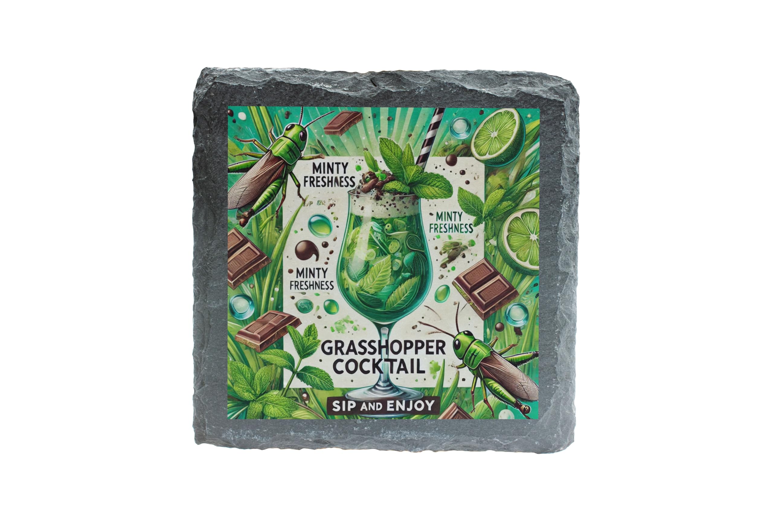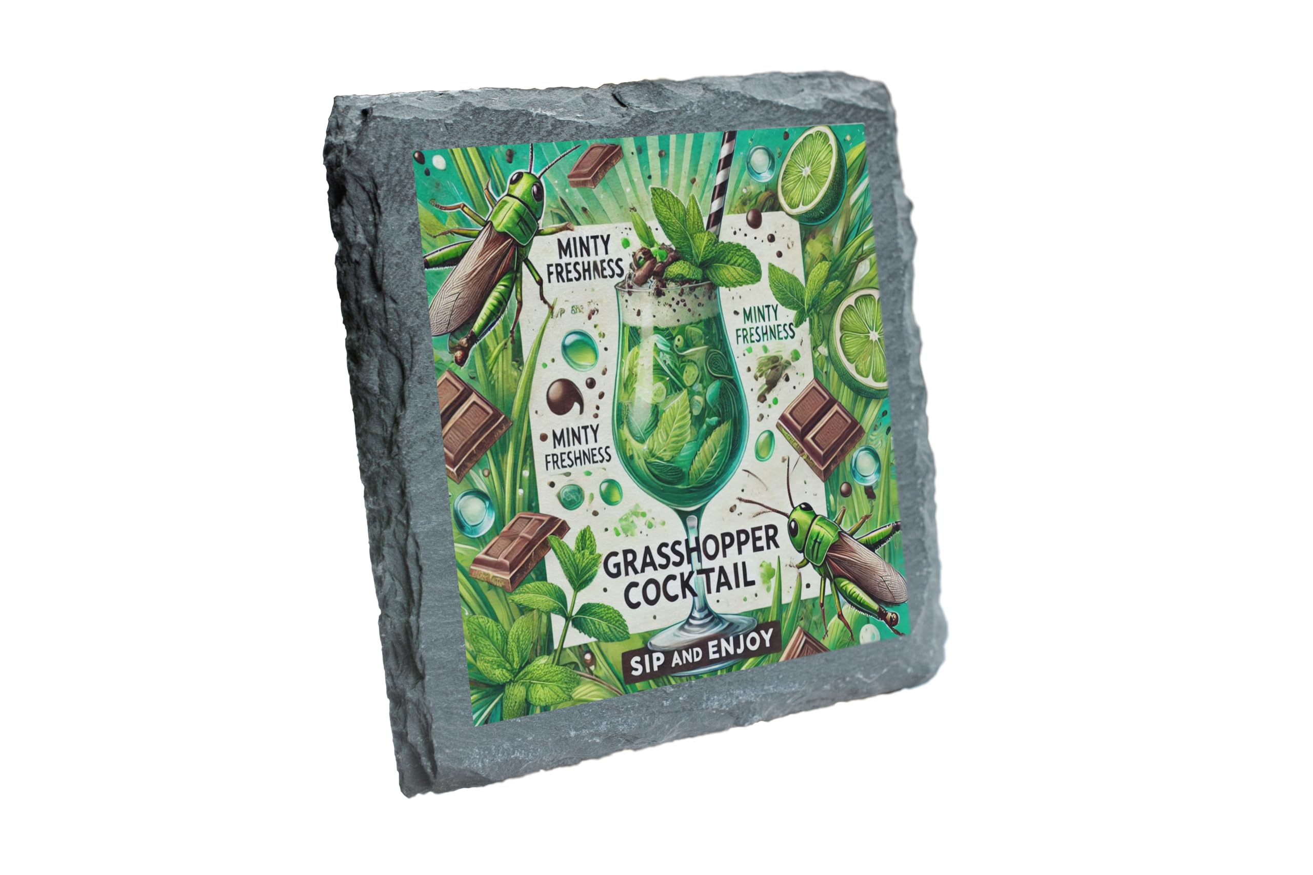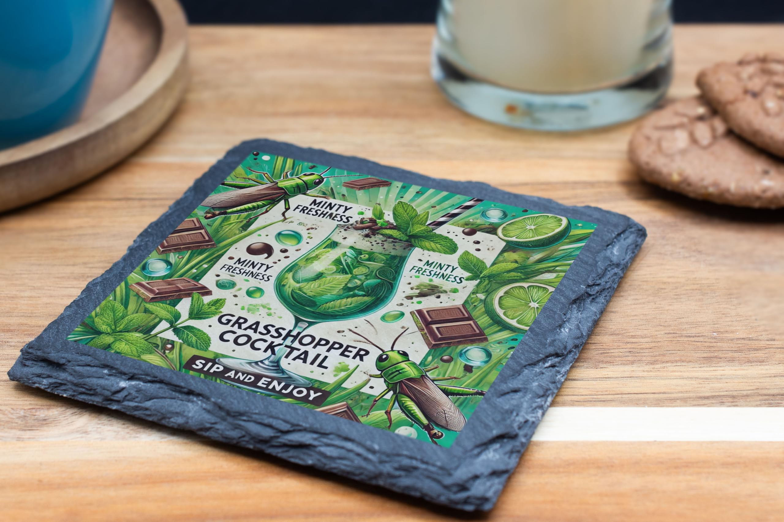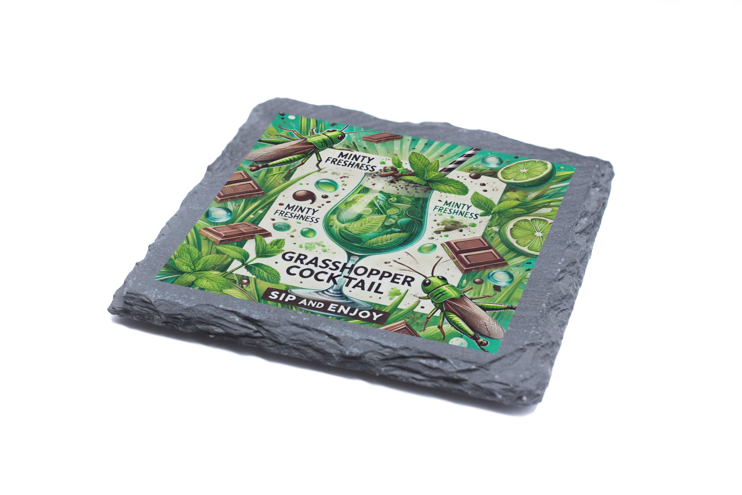 Bring the refreshing vibes of a Grasshopper cocktail into your home with this exquisitely designed slate coaster. The vibrant artwork captures the essence of minty freshness, complete with detailed illustrations of mint leaves, lime, and chocolate. Crafted from high-quality natural slate, this coaster is both functional and stylish, offering reliable protection for your tabletops. Its unique design makes it an ideal gift for cocktail aficionados or anyone who appreciates a pop of artistic flair. Whether you?re hosting a party or enjoying a quiet evening drink, this coaster adds an extra touch of elegance to your setting. Sip and enjoy in style!