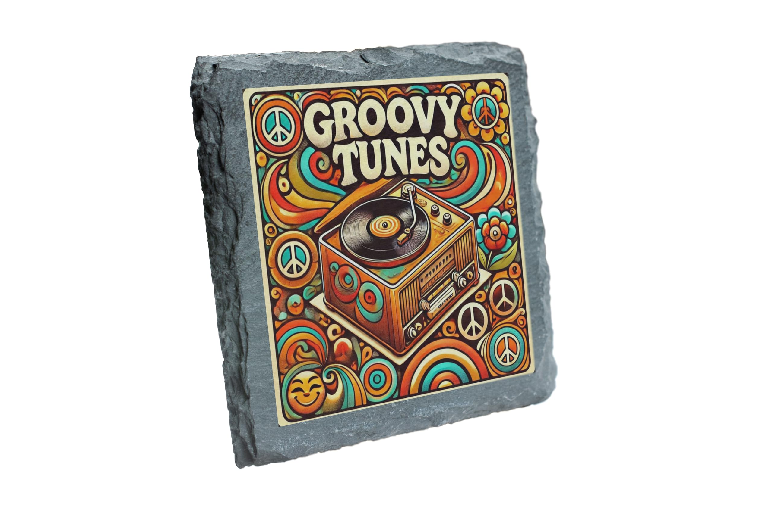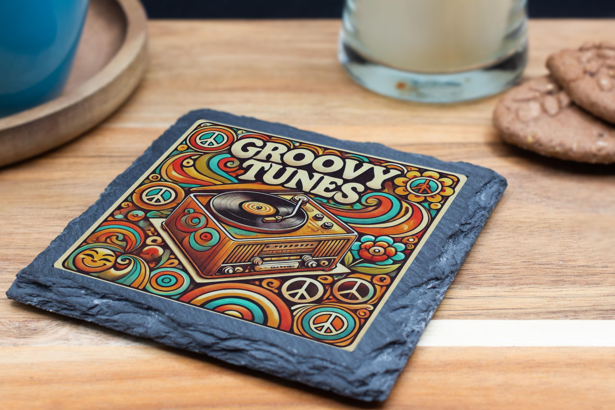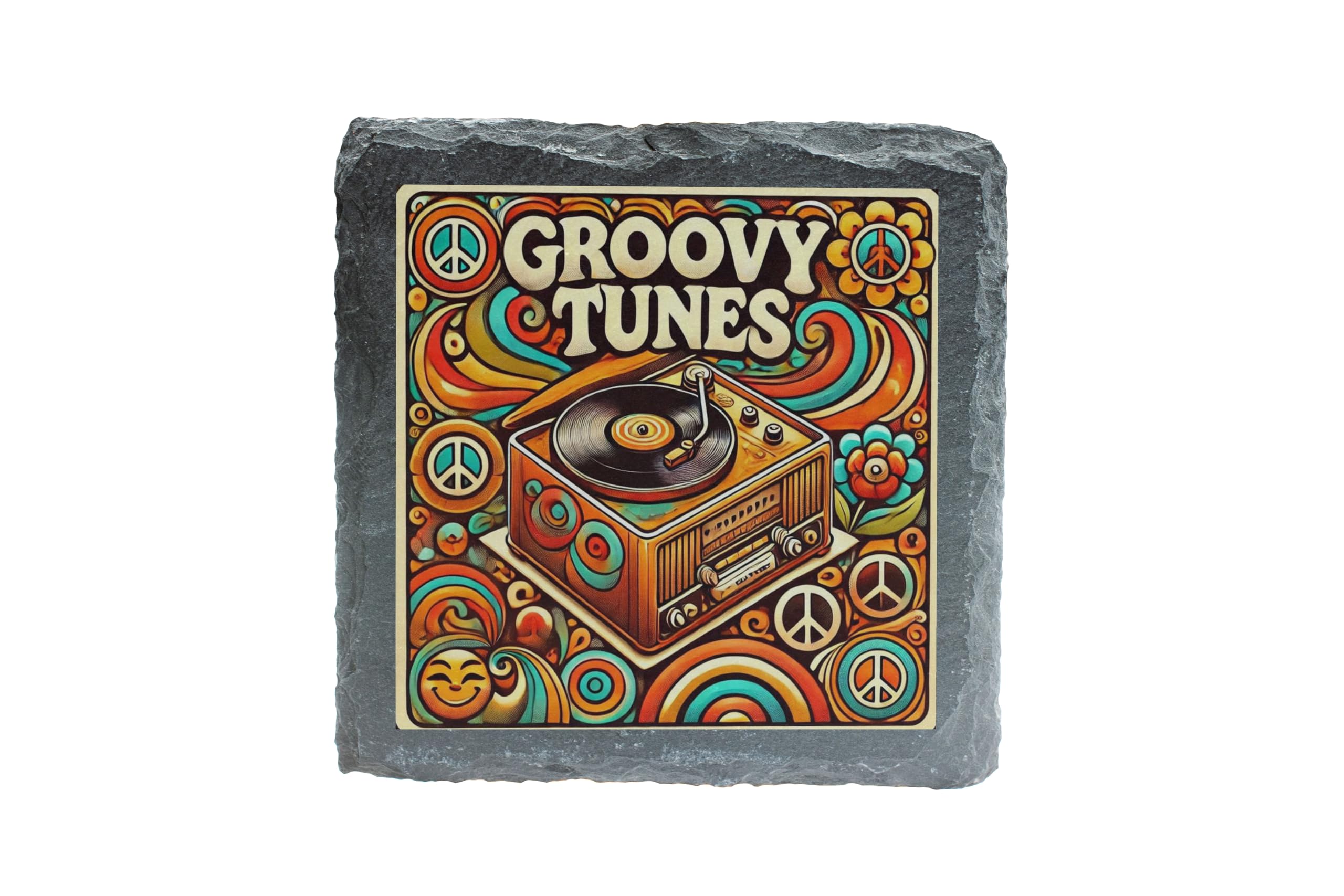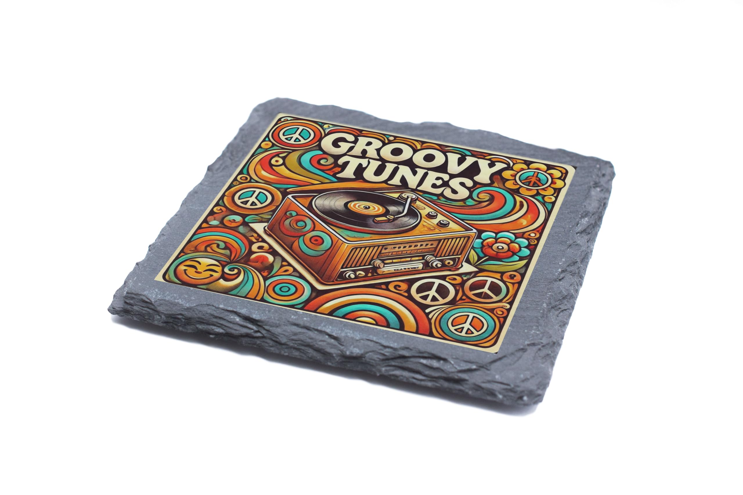 Celebrate your love for music and retro aesthetics with this "Groovy Tunes" slate coaster. Its eye-catching design features a classic record player surrounded by colorful swirls and peace symbols, making it a perfect statement piece for your coffee table or bar. Made from high-quality natural slate, this coaster combines style with functionality, protecting your surfaces from scratches and moisture. It?s an ideal gift for music lovers, vinyl enthusiasts, or anyone looking to add a pop of nostalgia and color to their living space.