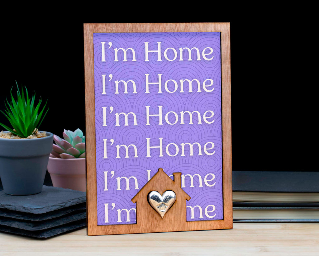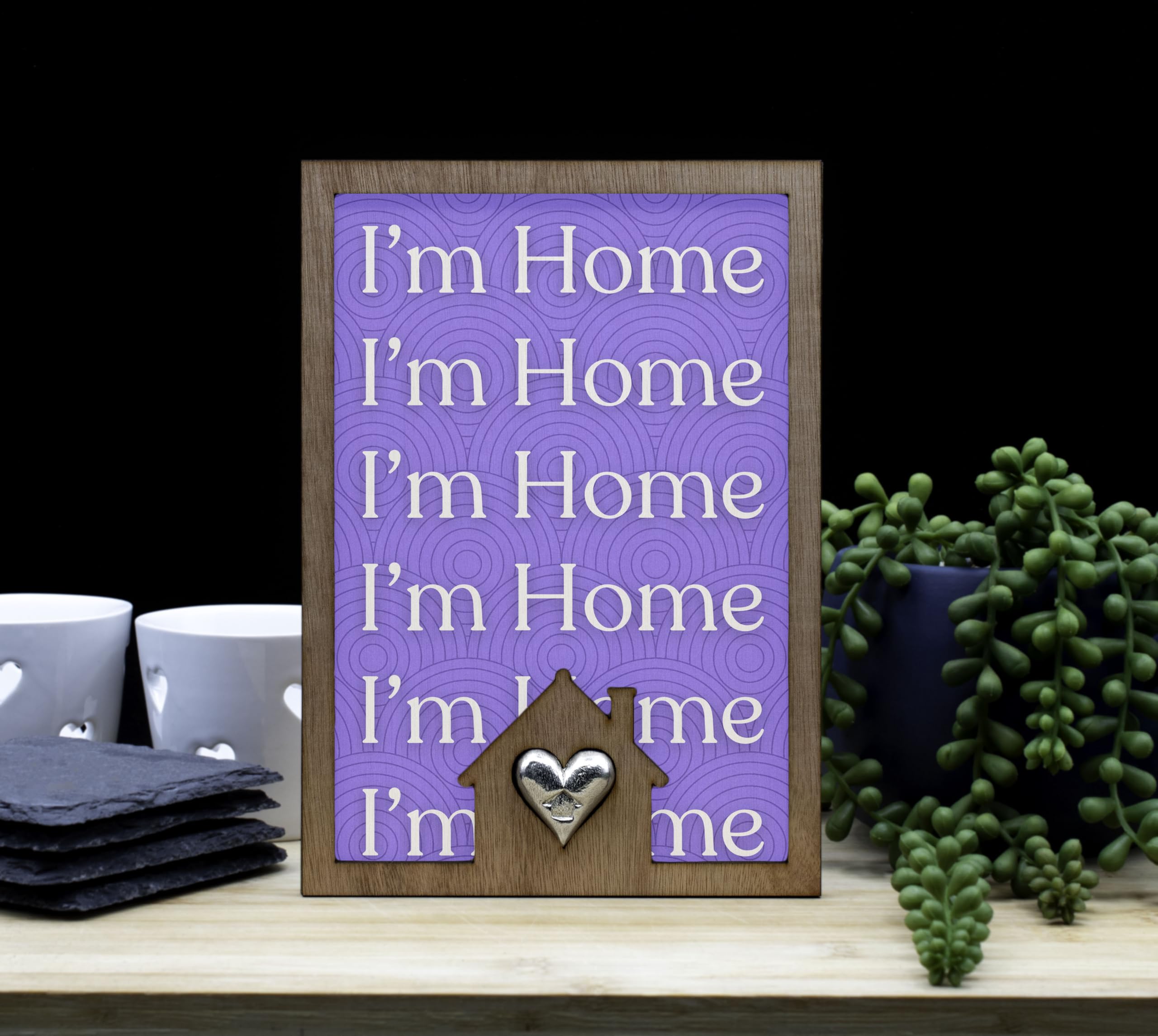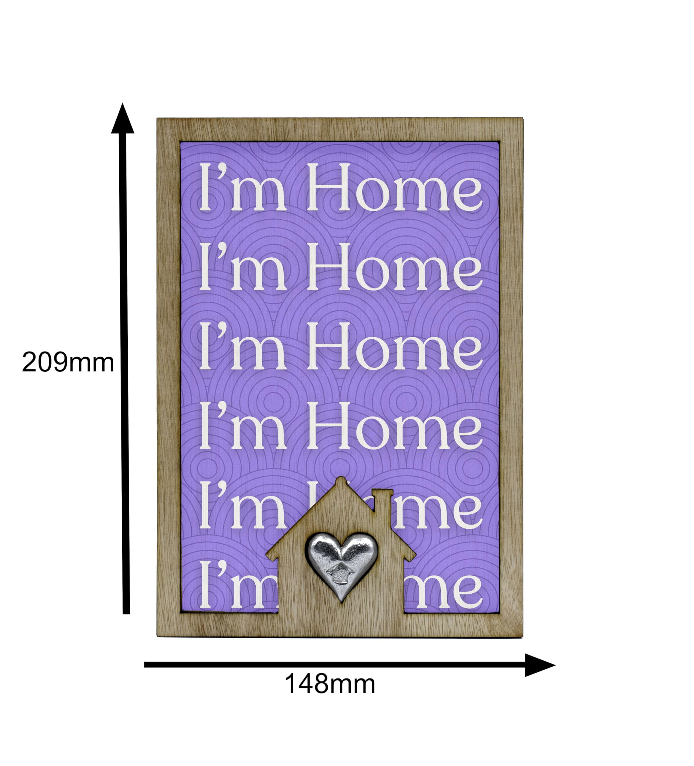 Add a touch of warmth and charm to your living space with our handcrafted decorative plaque featuring a modern purple 'Home Sweet Home' design. This beautiful piece is the perfect addition to any home, whether you hang it in the living room for a cozy vibe or place it by the entrance as a welcoming touch. The heart and house design will remind you of the sentiment of home every time you see it, making it a delightful housewarming gift for friends and family. With its modern design and rustic charm, this plaque is sure to complement any decor, adding an inspirational and whimsical touch to your space. The laser cut plywood product is enhanced with tin and pewter, giving it a unique and stylish look. The piece reads 'I'm Home', a simple yet sentimental message that will resonate with anyone who sees it. The full colour ornament showcases a beautiful purple background with repetitive text, creating a soothing and inviting atmosphere in any room.