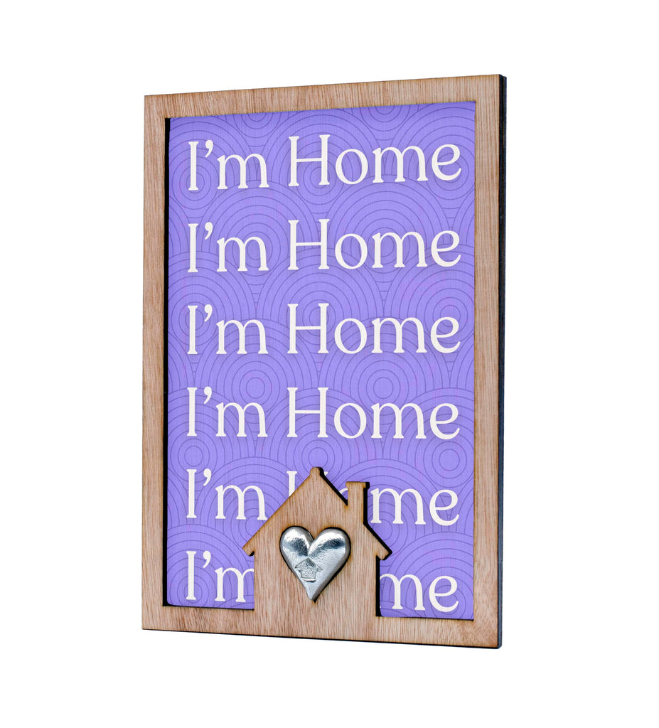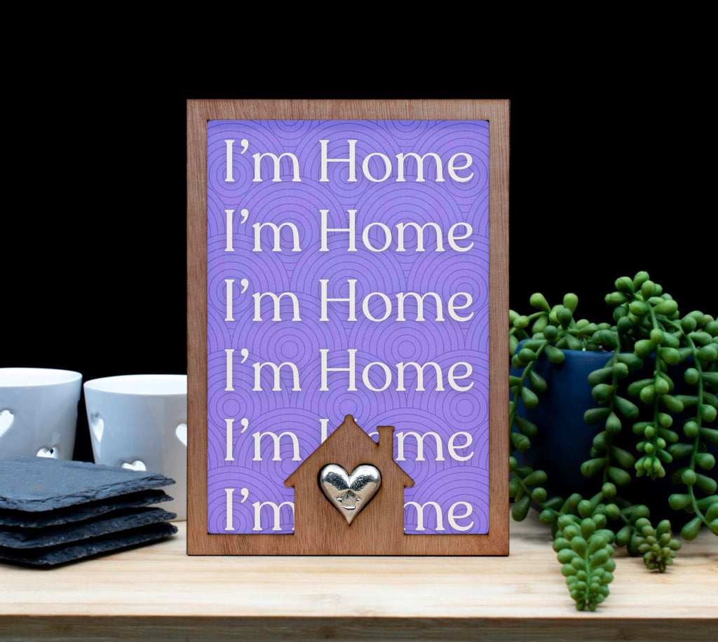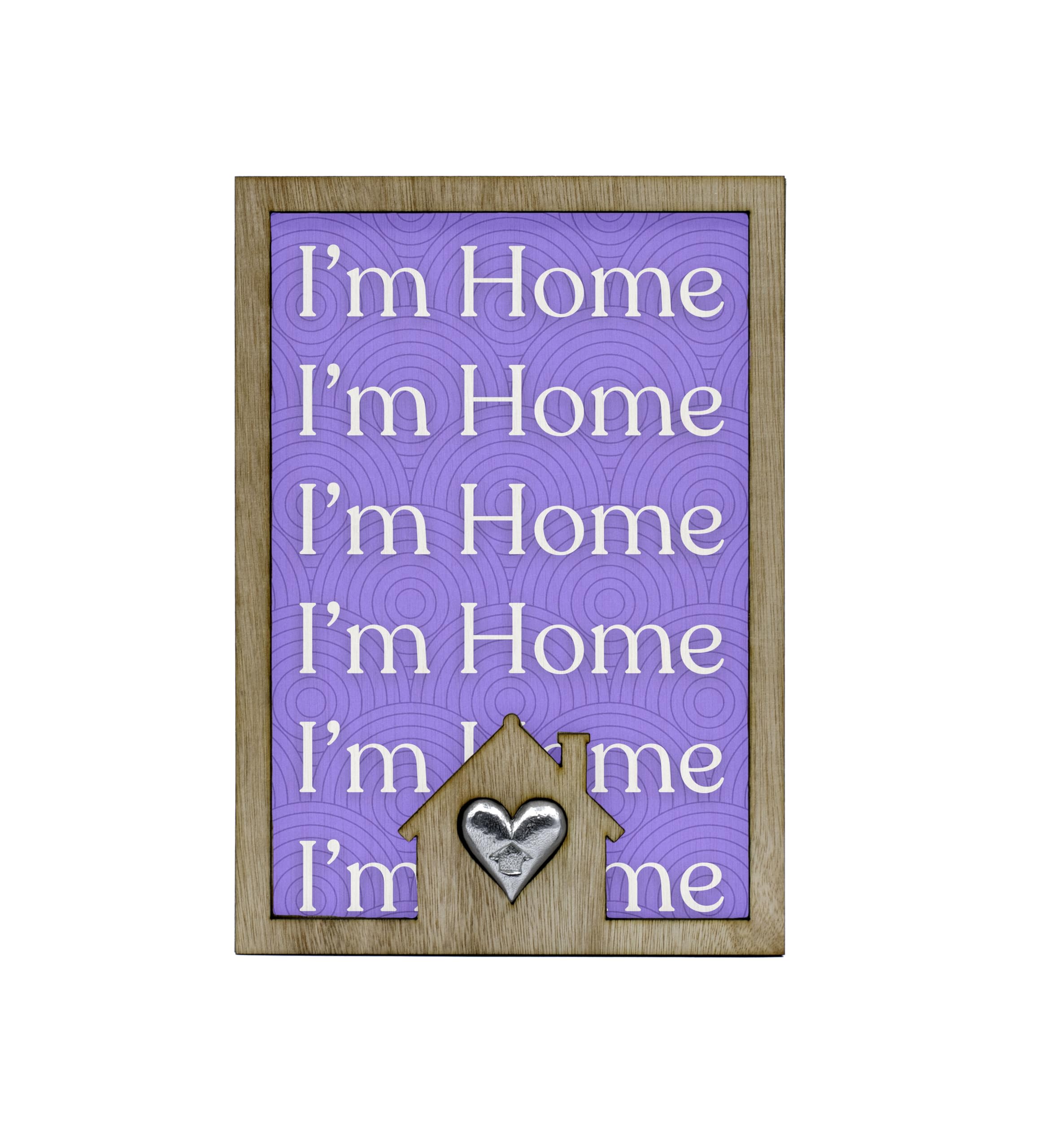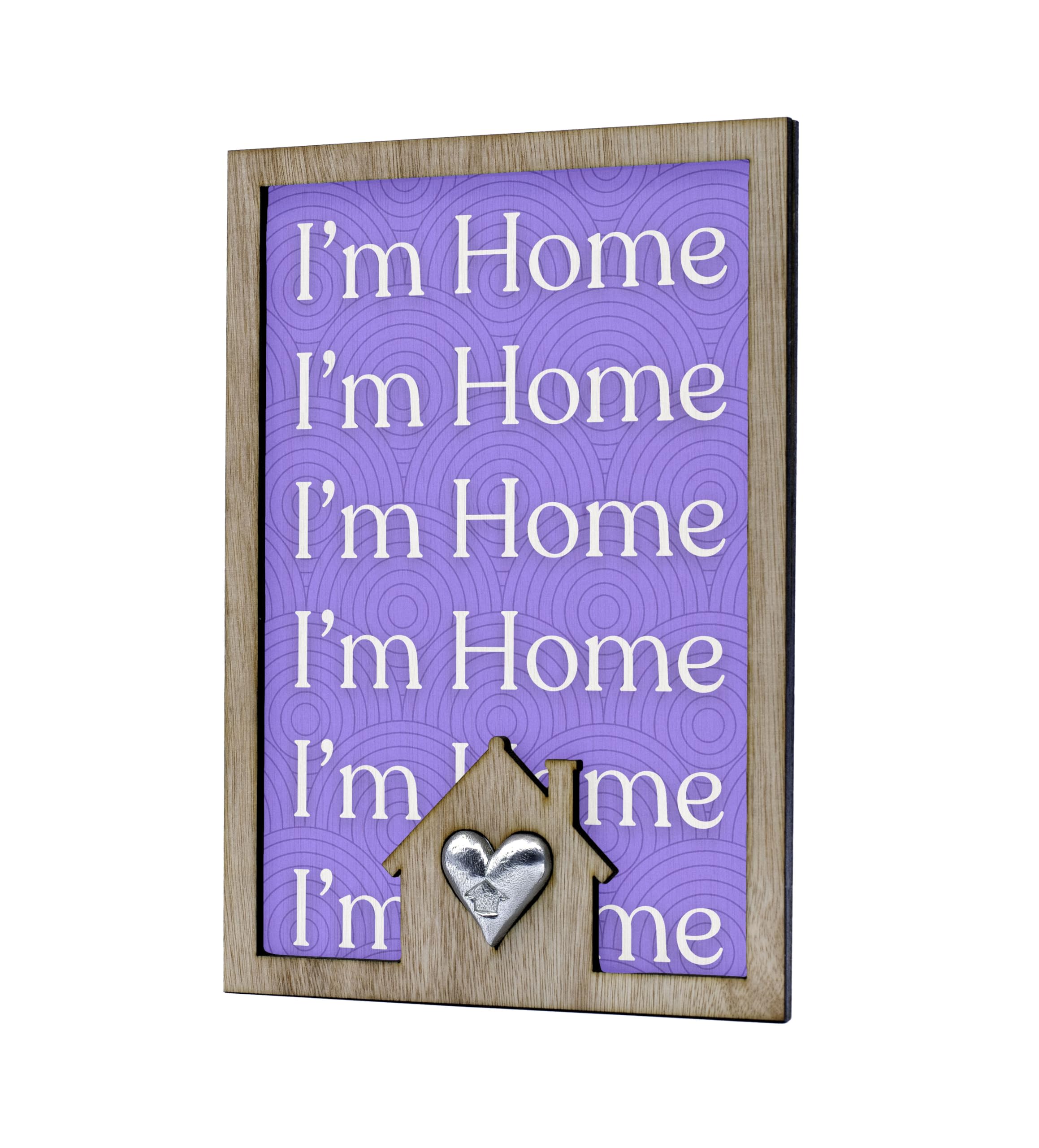 Add a touch of warmth and charm to your living space with our handcrafted decorative plaque featuring a modern purple 'Home Sweet Home' design. This beautiful piece is the perfect addition to any home, whether you hang it in the living room for a cozy vibe or place it by the entrance as a welcoming touch. The heart and house design will remind you of the sentiment of home every time you see it, making it a delightful housewarming gift for friends and family. With its modern design and rustic charm, this plaque is sure to complement any decor, adding an inspirational and whimsical touch to your space. The laser cut plywood product is enhanced with tin and pewter, giving it a unique and stylish look. The piece reads 'I'm Home', a simple yet sentimental message that will resonate with anyone who sees it. The full colour ornament showcases a beautiful purple background with repetitive text, creating a soothing and inviting atmosphere in any room.