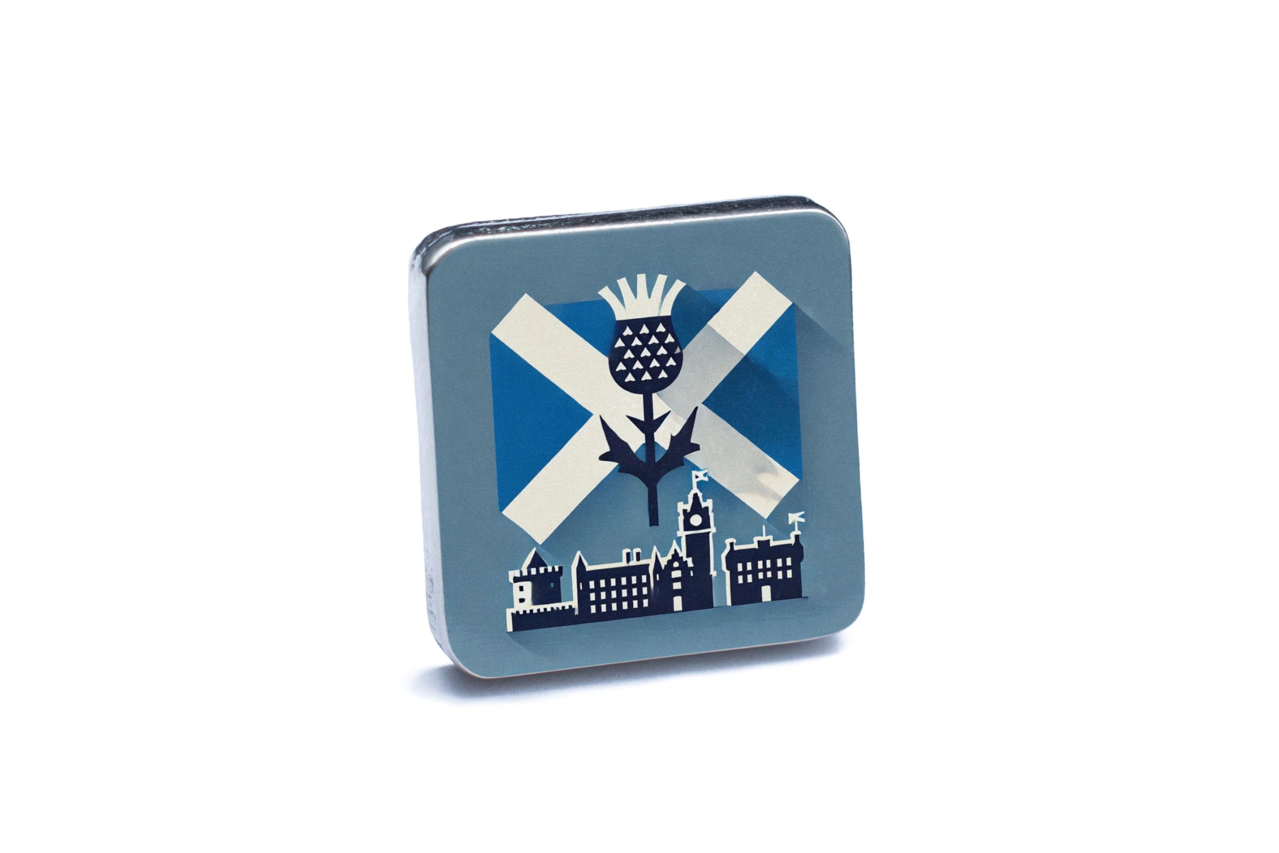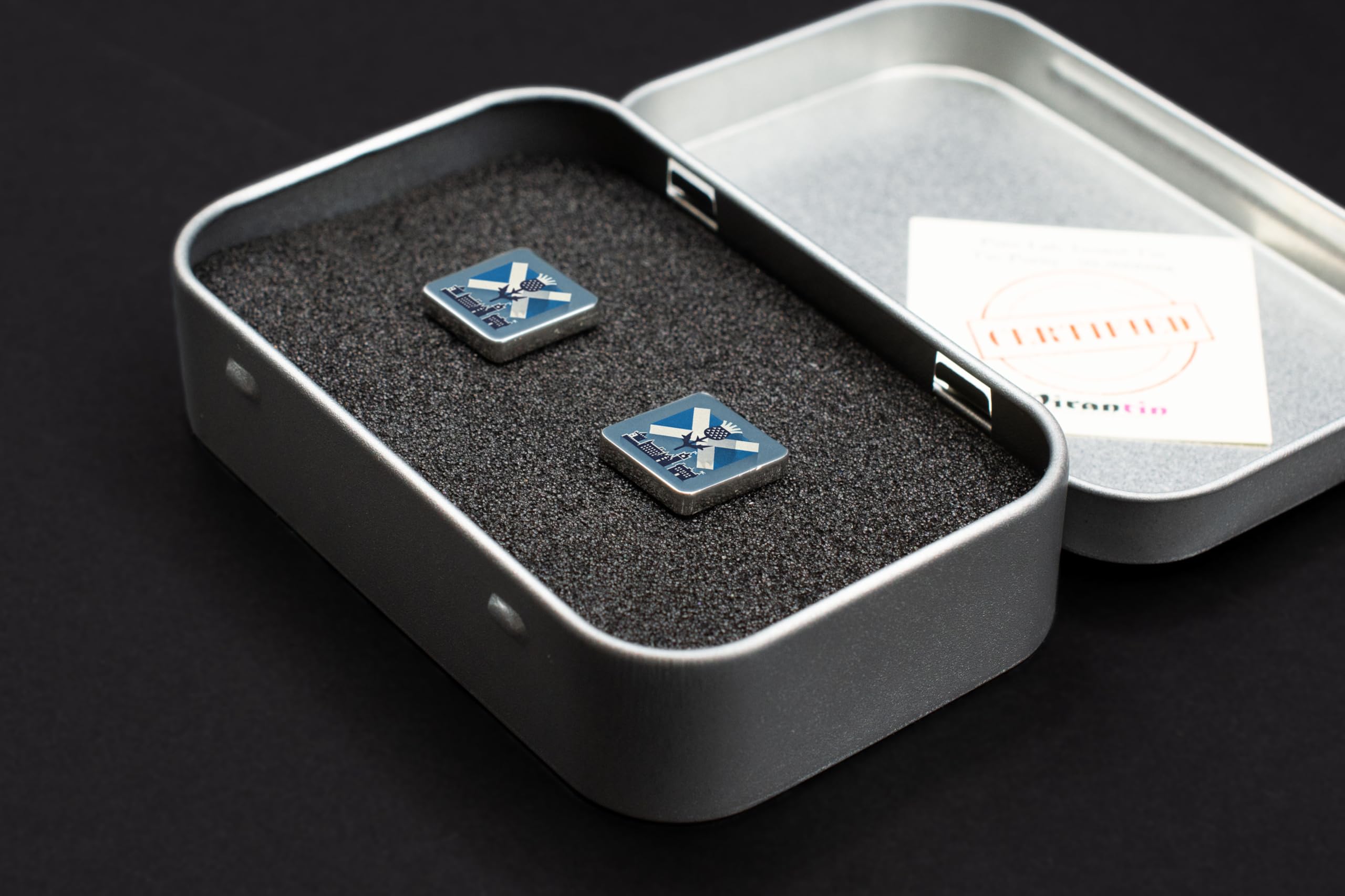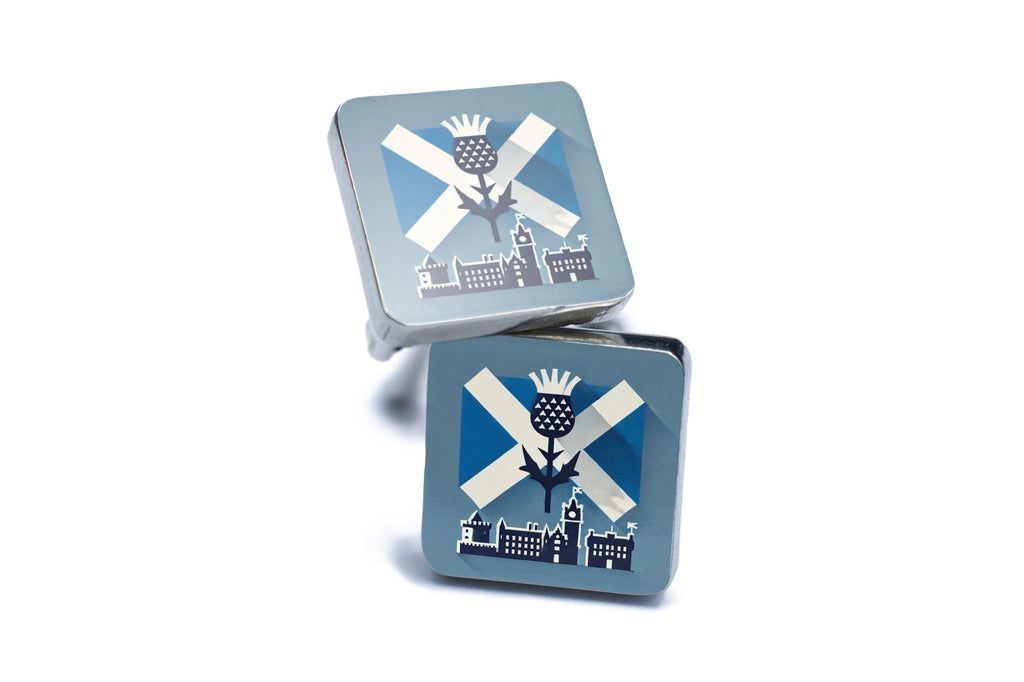 Introducing our handcrafted Scotland-Themed UV Printed Novelty Cufflinks, the perfect patriotic accessory for those who take pride in their Scottish heritage. These unique cufflinks showcase a stunning Scotland-themed design, featuring iconic symbols such as the thistle and Scottish flag. Each pair of cufflinks is meticulously crafted from tin and pewter, with intricate details that highlight the beauty of Scottish culture. The UV printed design adds a touch of modern flair, making these cufflinks a stylish gift for any occasion. Whether you're looking to showcase your Scottish pride or simply add a bit of personal culture to your formal attire, these handcrafted cufflinks are sure to impress. Elevate your look with our heritage cufflinks, showcasing the Scottish city skyline and other ai generated art in full colour print.