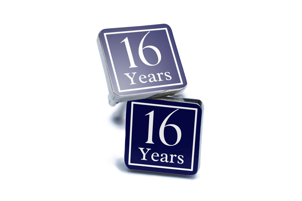 These handcrafted tin cufflinks are the perfect accessory to celebrate a 16 years milestone anniversary. Made with care by artisans, these cufflinks feature simple typography that reads '16 years' in an elegant and minimalist design. Each cufflink is meticulously UV printed to ensure the design lasts for years to come. These cufflinks are a stylish addition to any man's wardrobe, adding a touch of sophistication to any outfit. Whether you're looking for a special anniversary gift or simply want to elevate your accessories collection, these handcrafted tin cufflinks are sure to impress.
