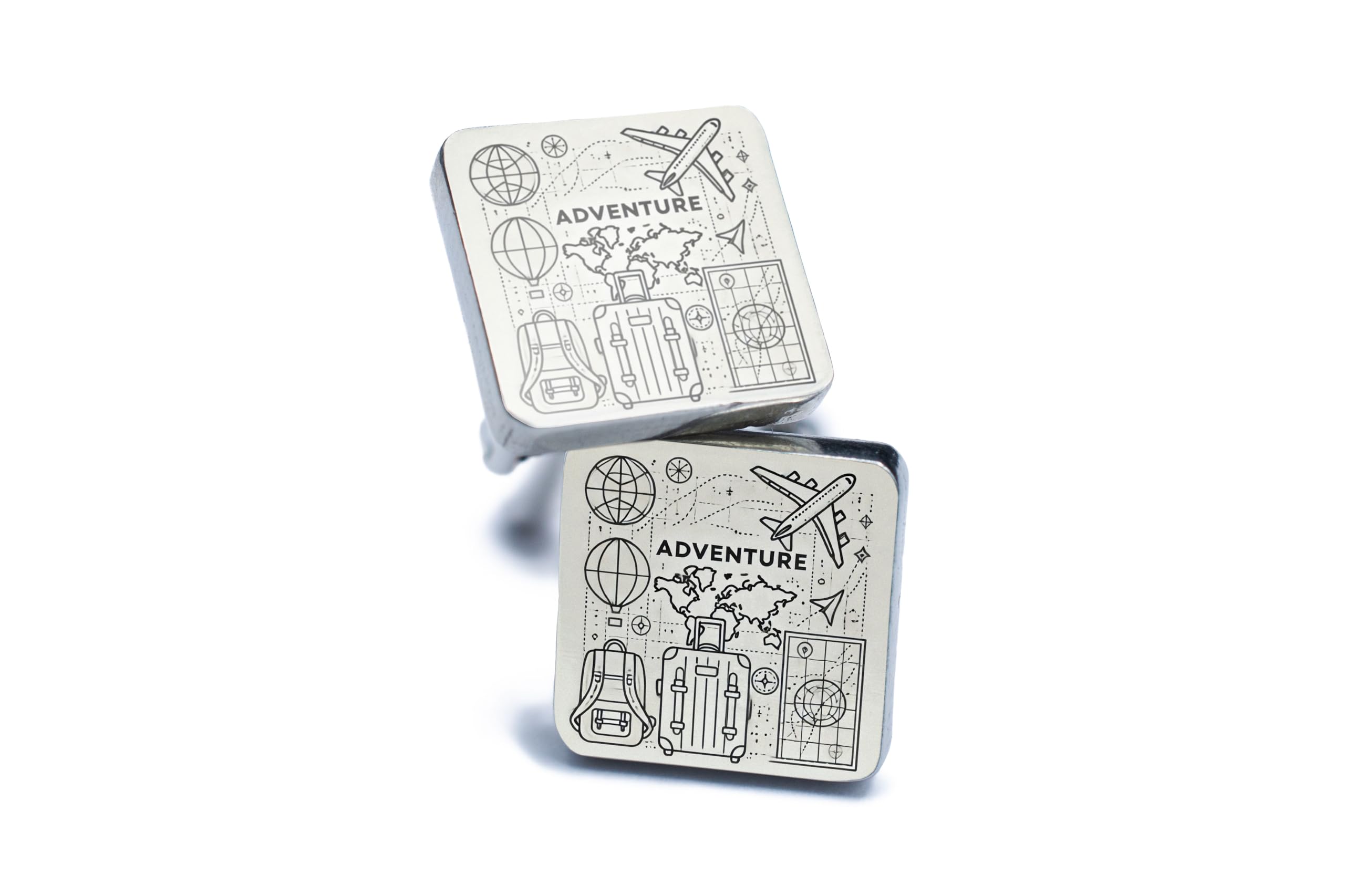 - Handcrafted cufflinks featuring an adventure-themed design with a globe and airplane motif