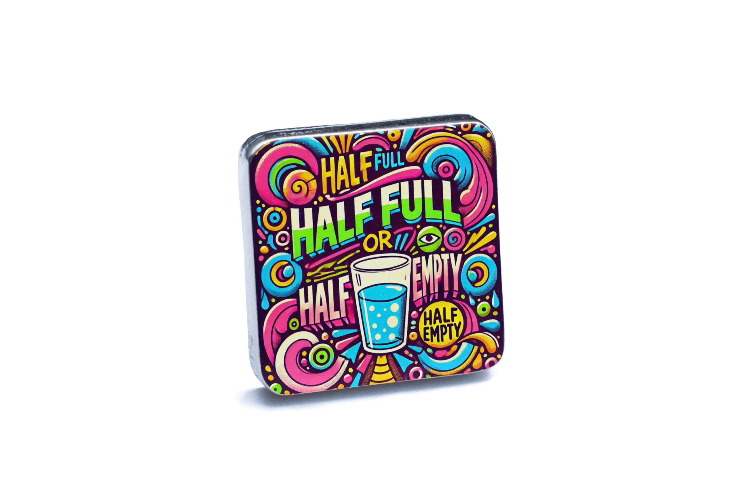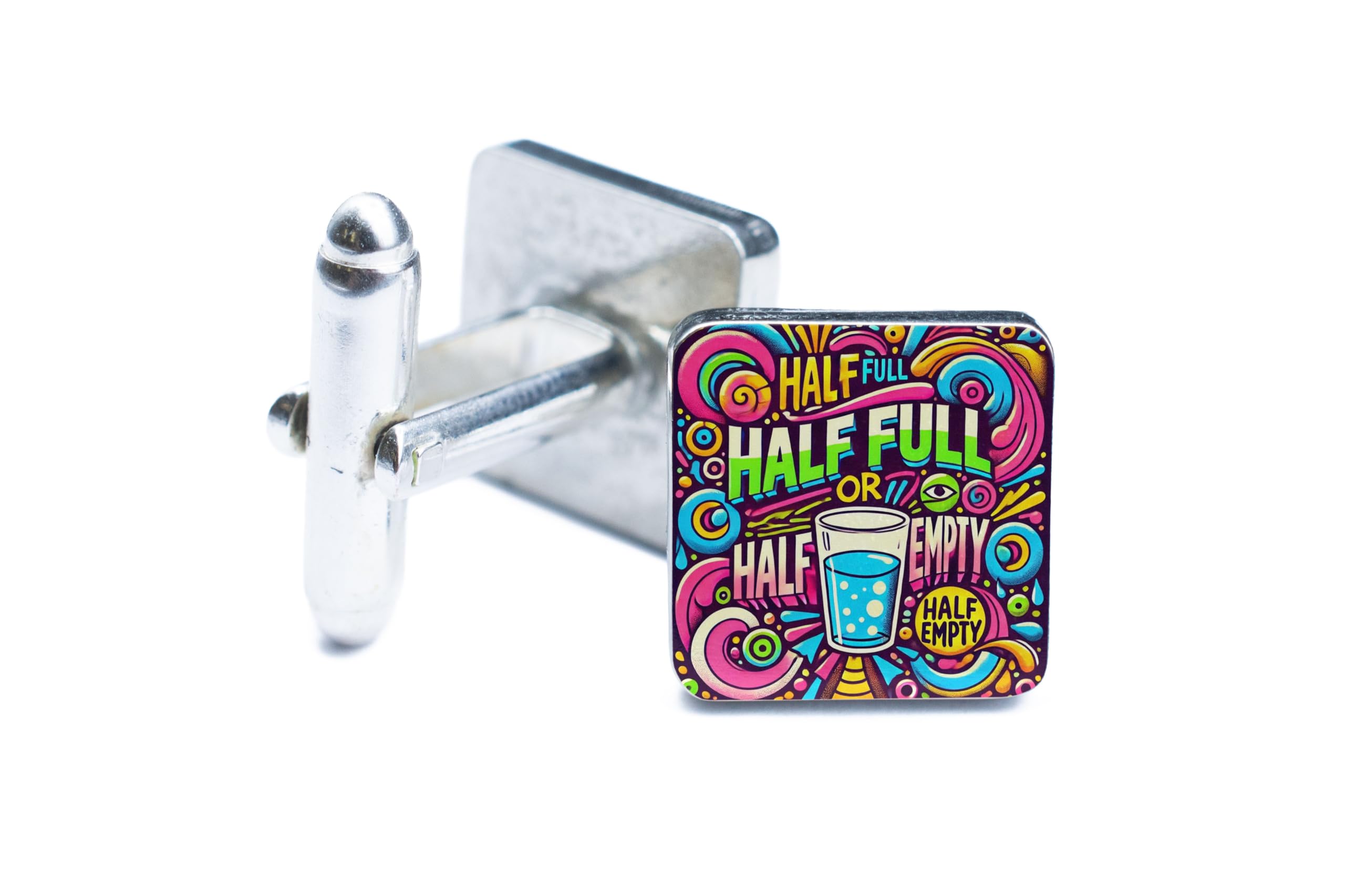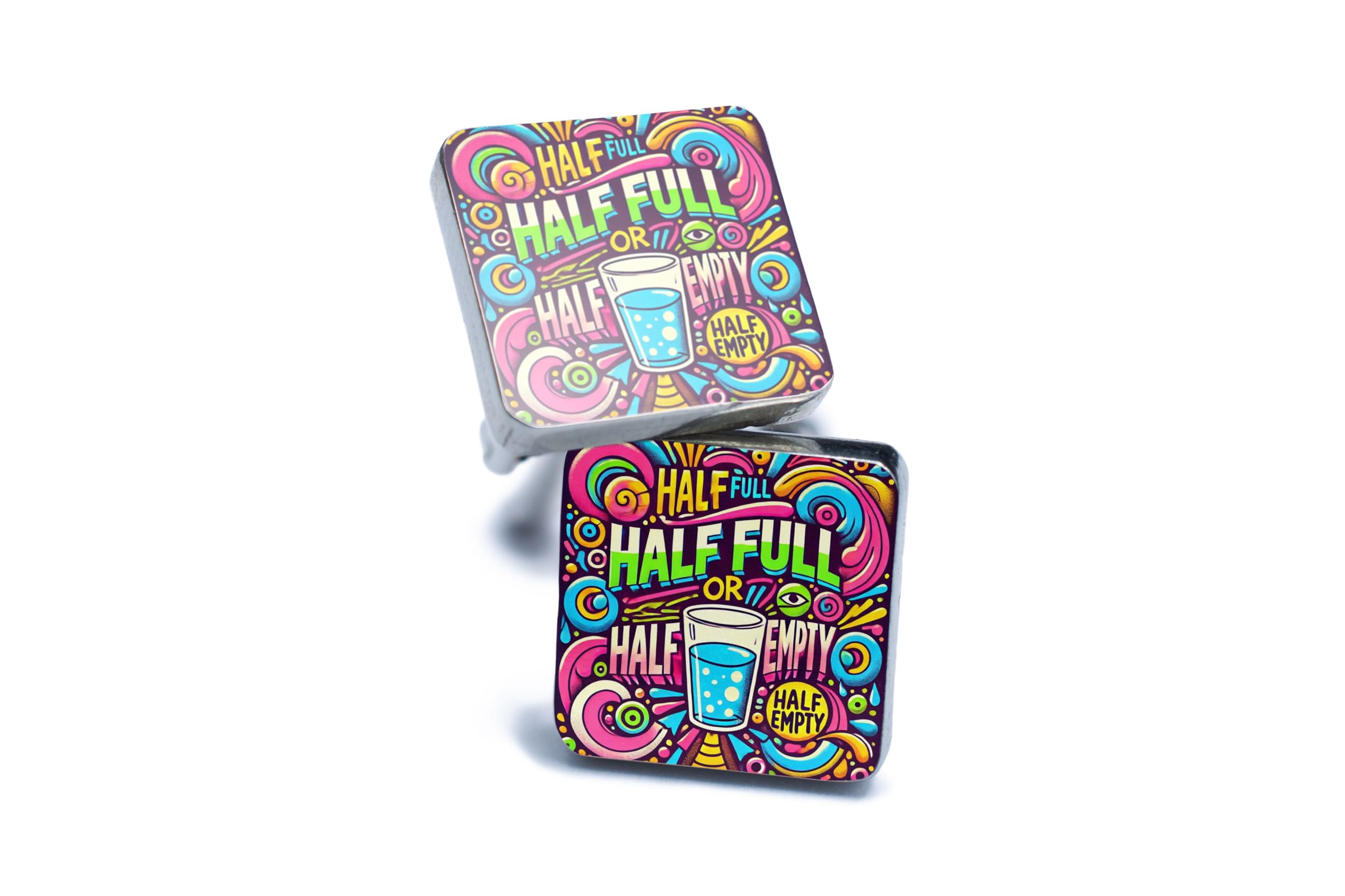 Introducing our handcrafted UV printed cufflinks, featuring a colourful pop art style and positive message design. Made from tin and pewter, these cufflinks are a unique men's accessory that will add a fun and vibrant touch to any outfit. The bold typography design reads 'half full or half empty', perfect for those who appreciate a motivational message. The full colour printed cufflinks showcase a graffiti style design, making them a statement piece for any occasion. Stand out from the crowd with these artistic fashion cufflinks that are sure to be a conversation starter. Whether you're attending a wedding or a special event, these novelty optimistic cufflinks are the perfect accessory to spread positivity and optimism.