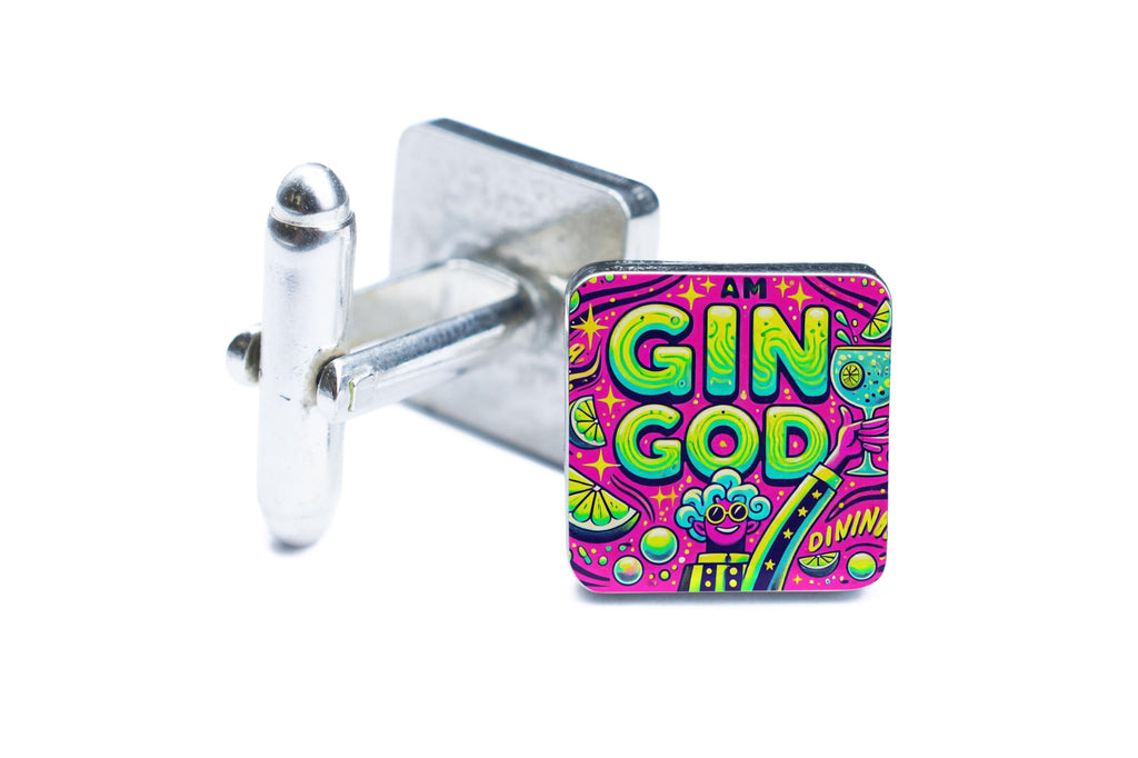 - Handcrafted from tin and pewter, these unique cufflinks read 'Gin God' in bold typography