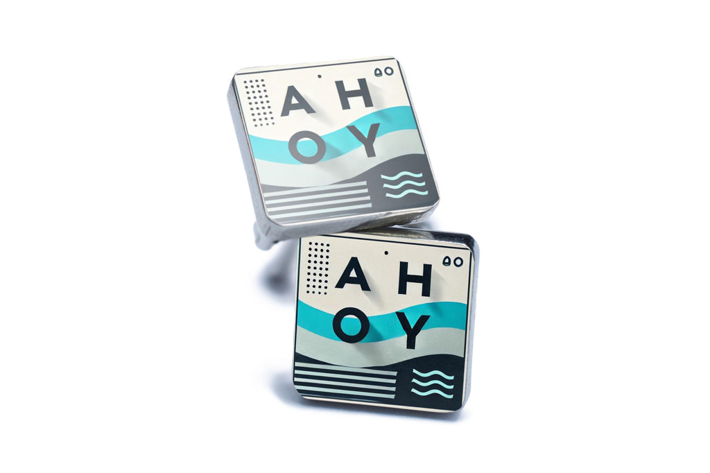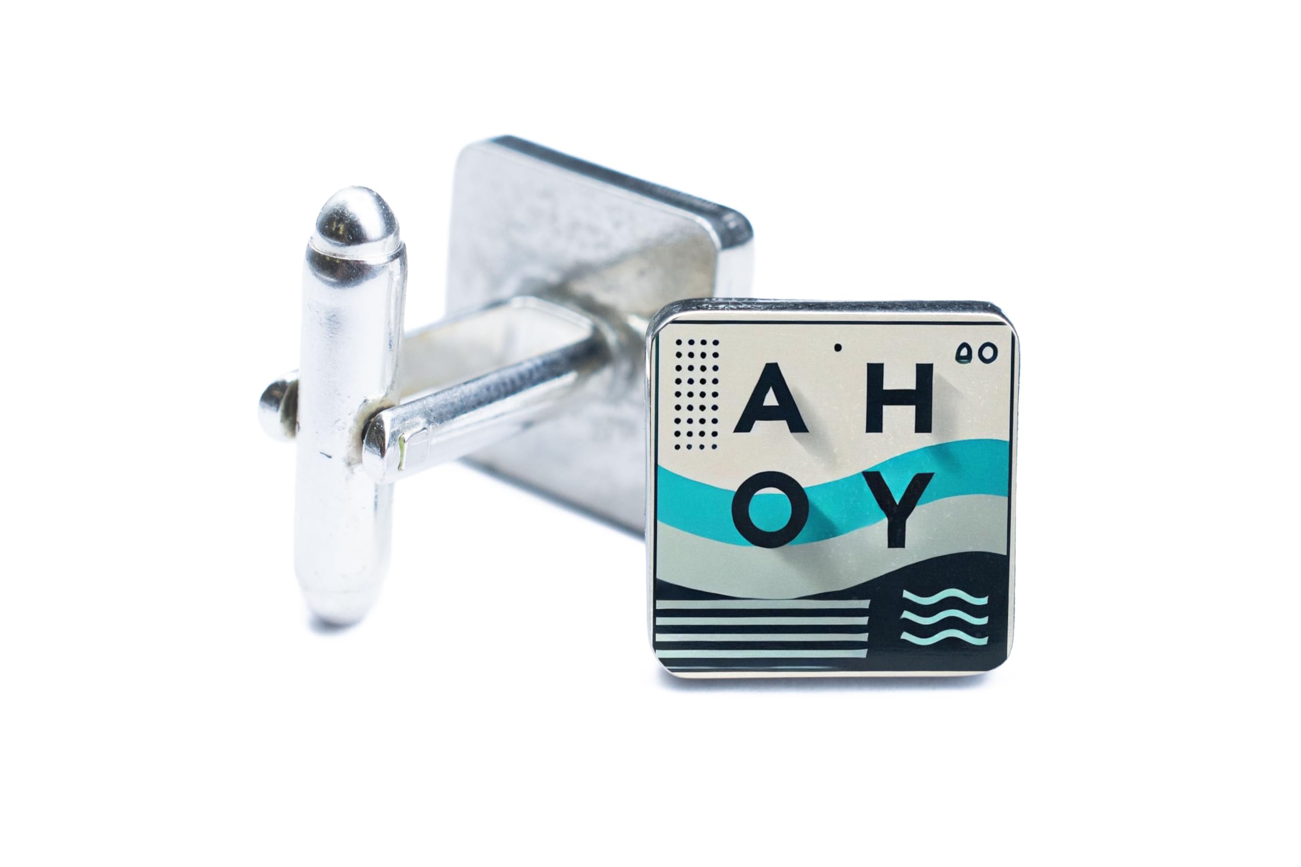 - Handcrafted UV printed cufflinks with a nautical theme and 'Ahoy' design