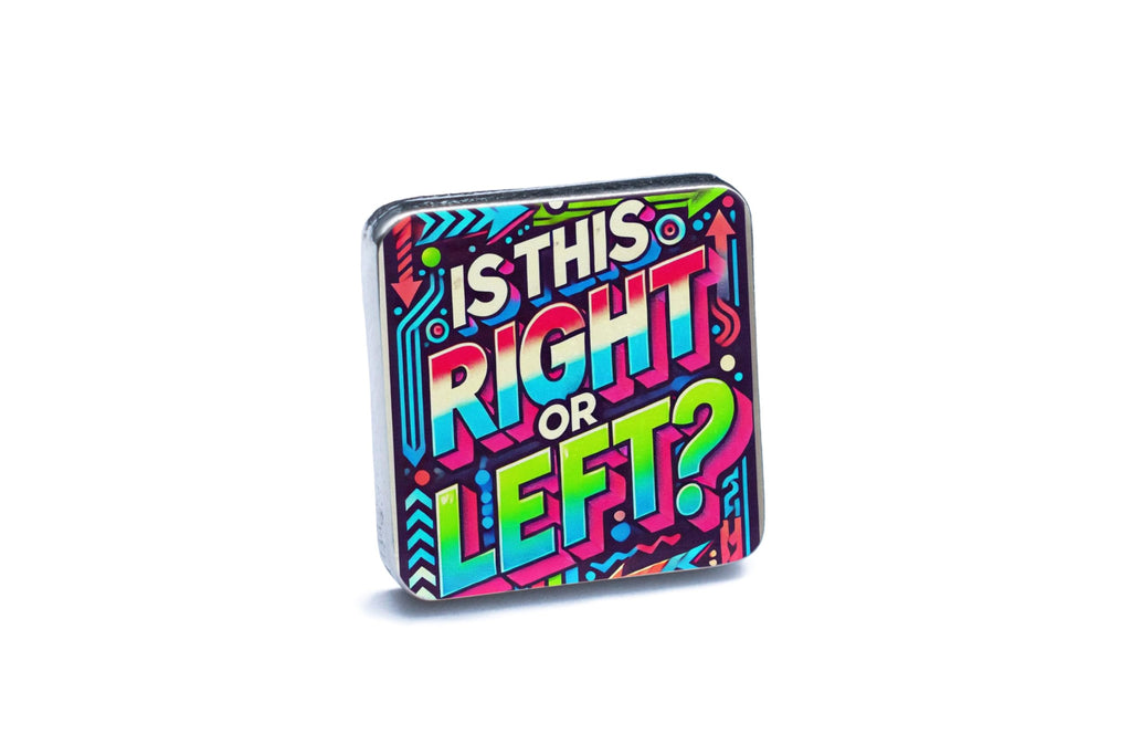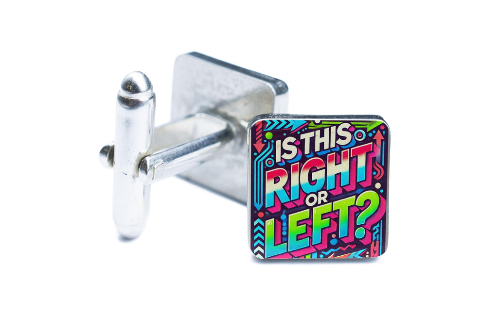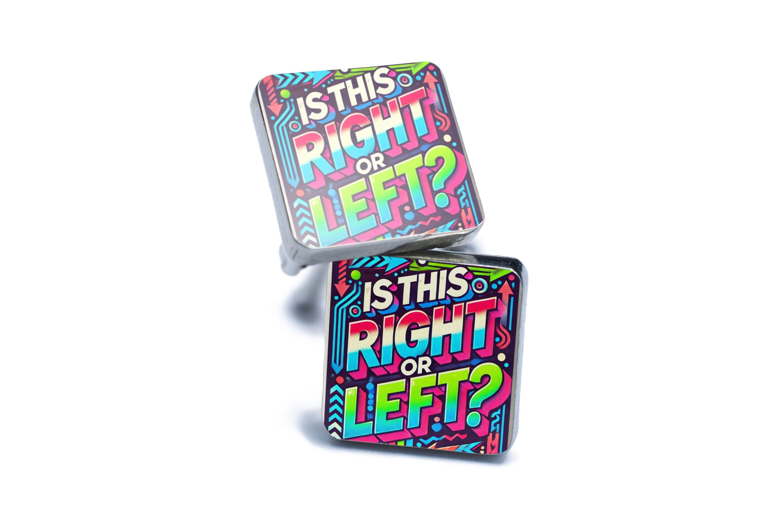 Add a touch of fun and style to your outfit with these handcrafted UV printed neon novelty cufflinks! These cufflinks are perfect for the man who likes to stand out and make a statement with his accessories. Each cufflink is meticulously handcrafted from tin and pewter, ensuring a quality product that will last for years to come. The UV printed design features an AI generated art that reads 'is this right or left?' These full color printed cufflinks showcase a colourful neon design that is sure to catch the eye. These playful cufflinks are ideal for casual wear and make a great gift for any man who enjoys lighthearted fashion. Stand out from the crowd with these unique and stylish cufflinks that are sure to become a favourite in your accessory collection.