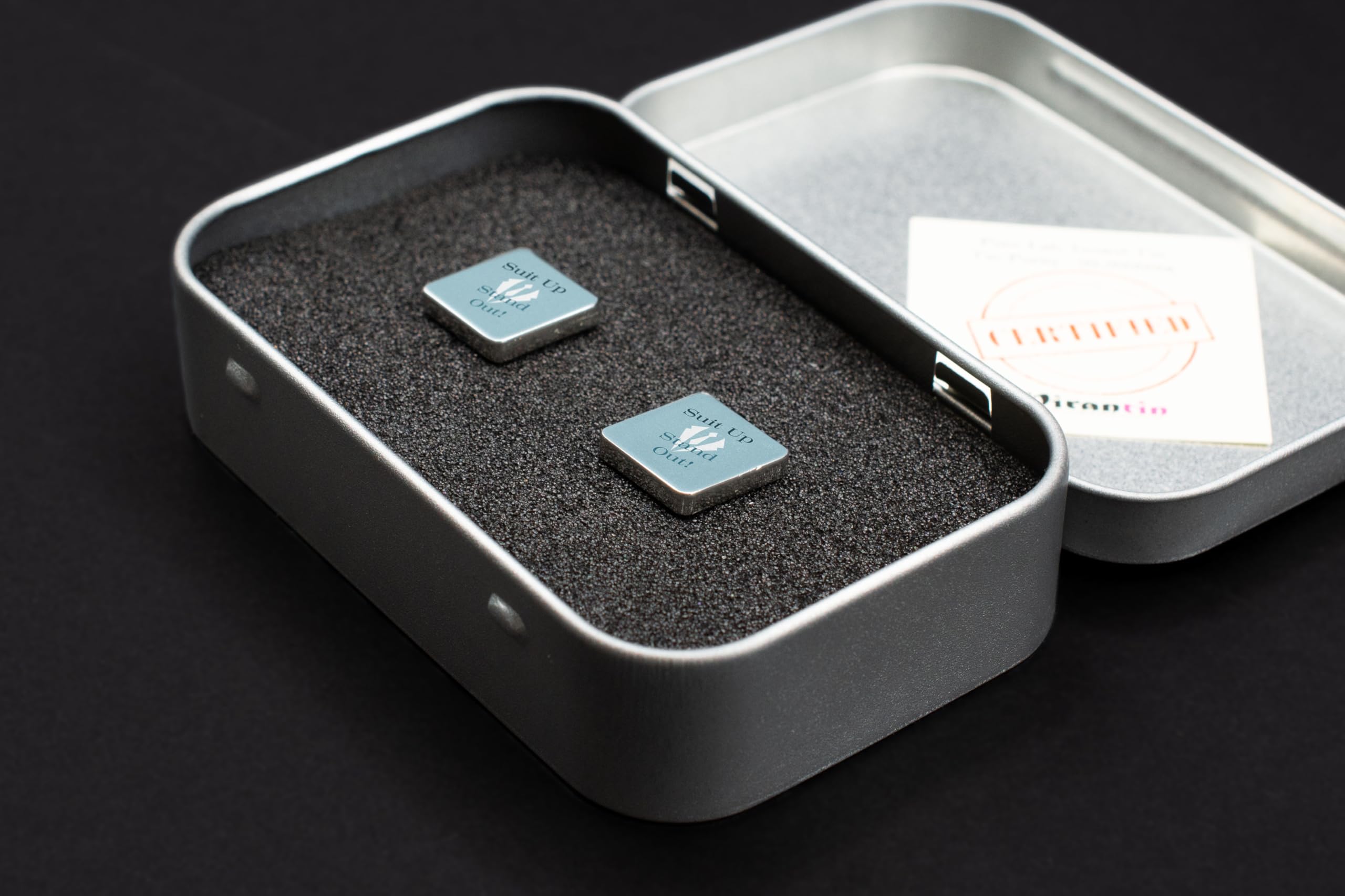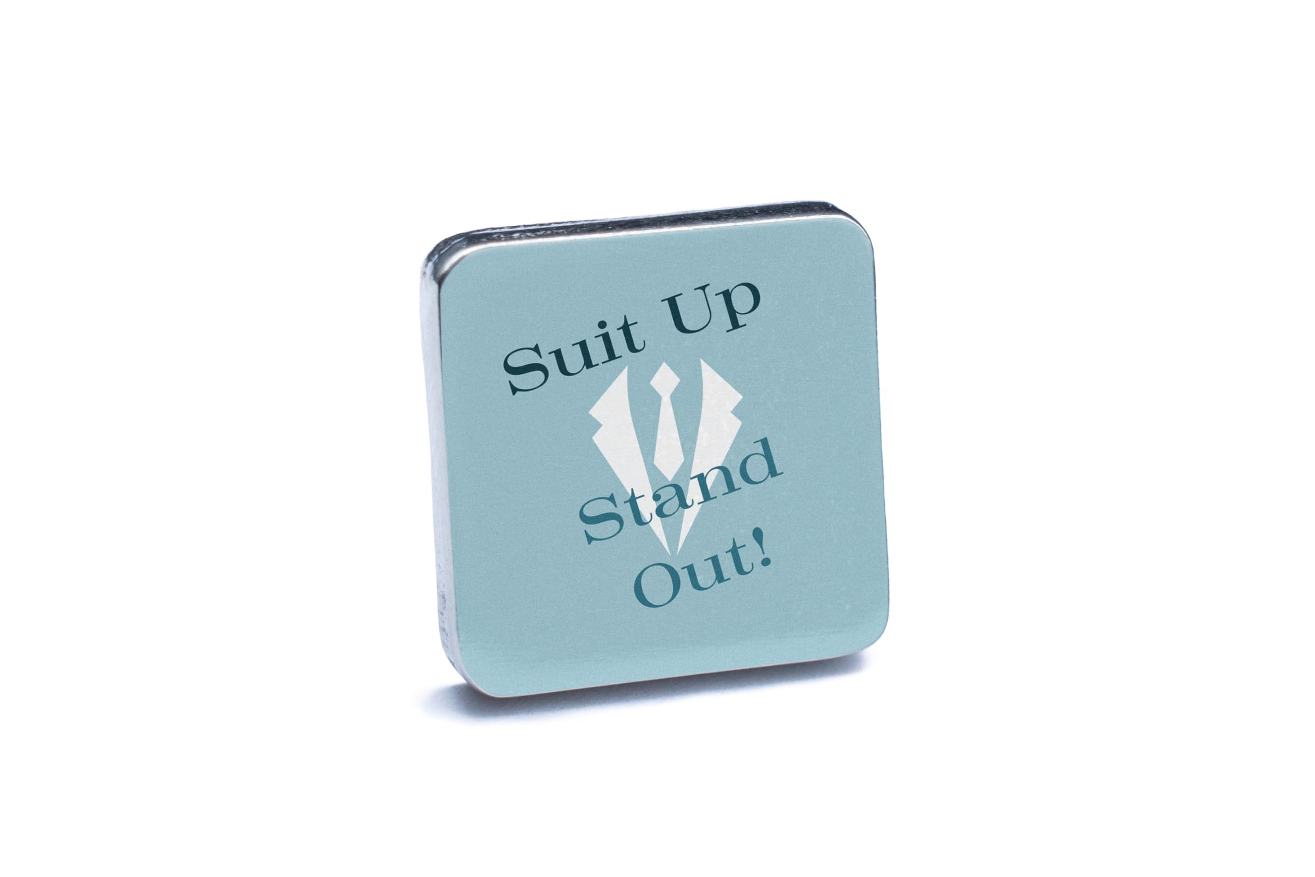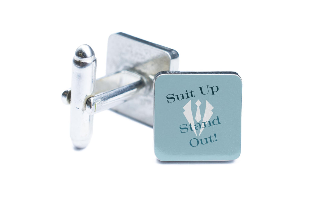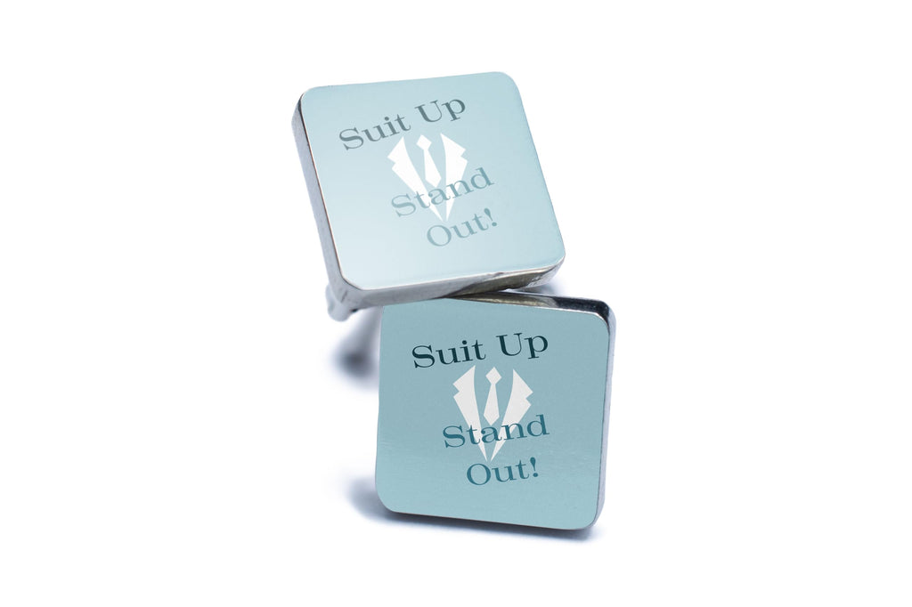 Add a touch of modern minimalist style to your formal attire with these handcrafted UV printed novelty cufflinks. Stand out from the crowd and make a fashion statement with these unique cufflinks that are sure to catch everyone's eye. Made from handcrafted tin and pewter, these cufflinks feature a bold design that reads 'suit up stand out' in a fun and stylish way. The full-colour printed cufflinks showcase a simple blue design that is perfect for accessorising on the big day. Whether you're heading to the office or dressing up for a special occasion, these cufflinks are the perfect addition to any outfit. Give the gift of fashionable and unique style with these handcrafted UV printed novelty cufflinks.