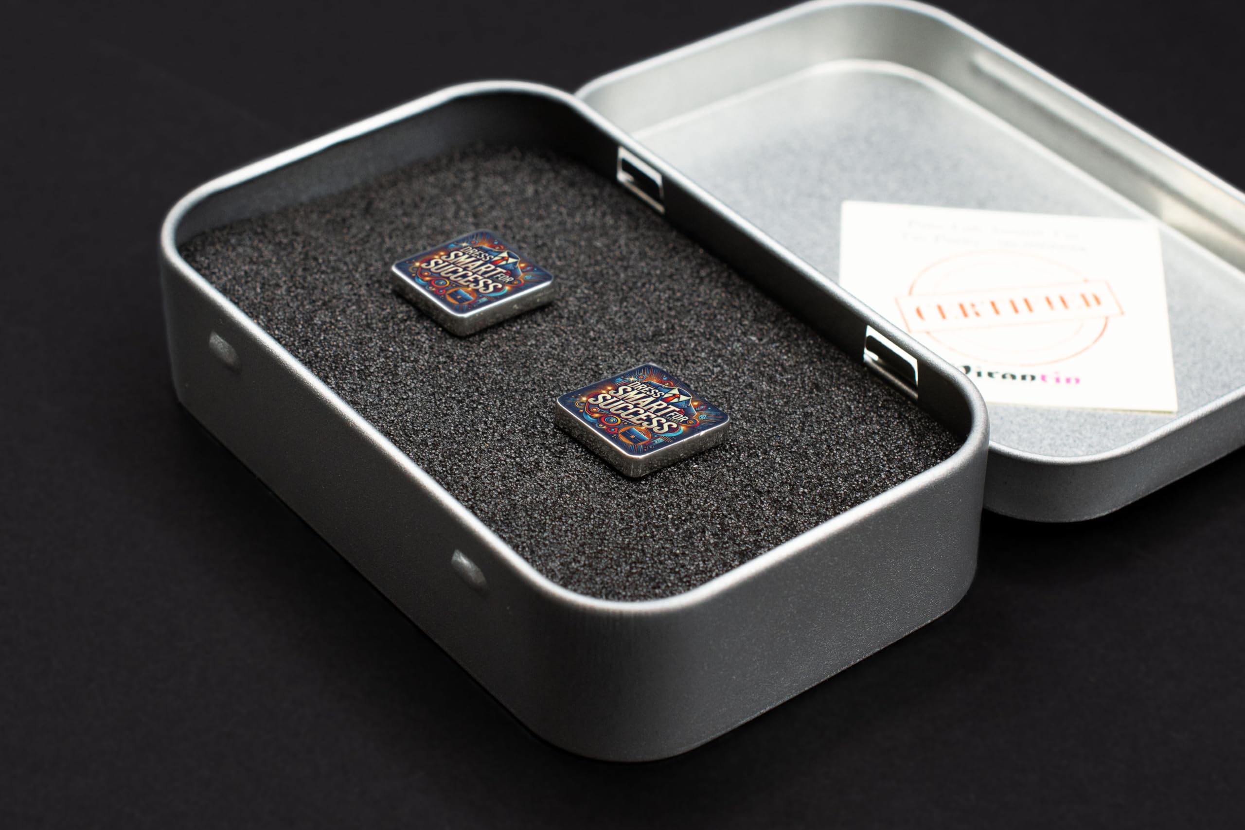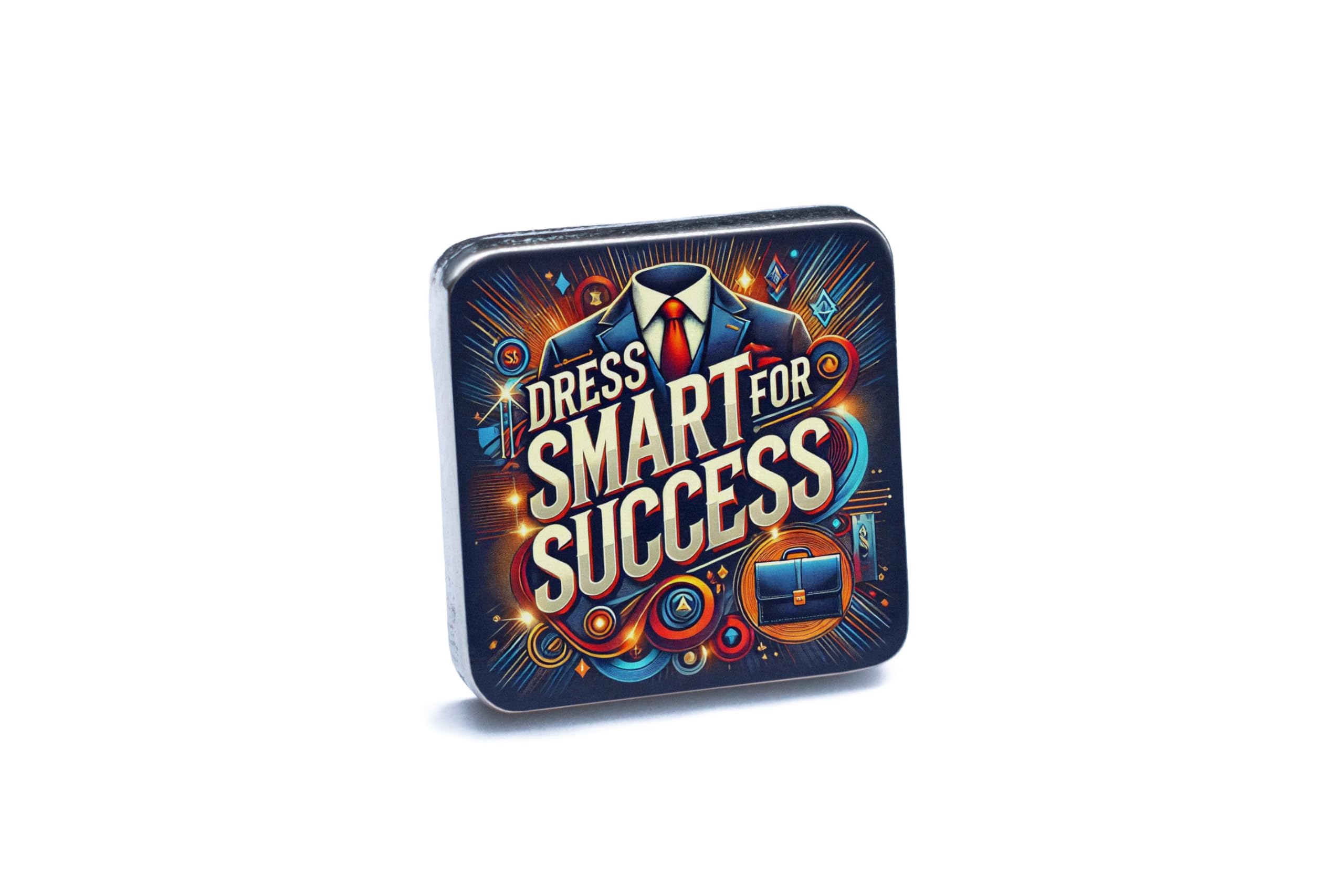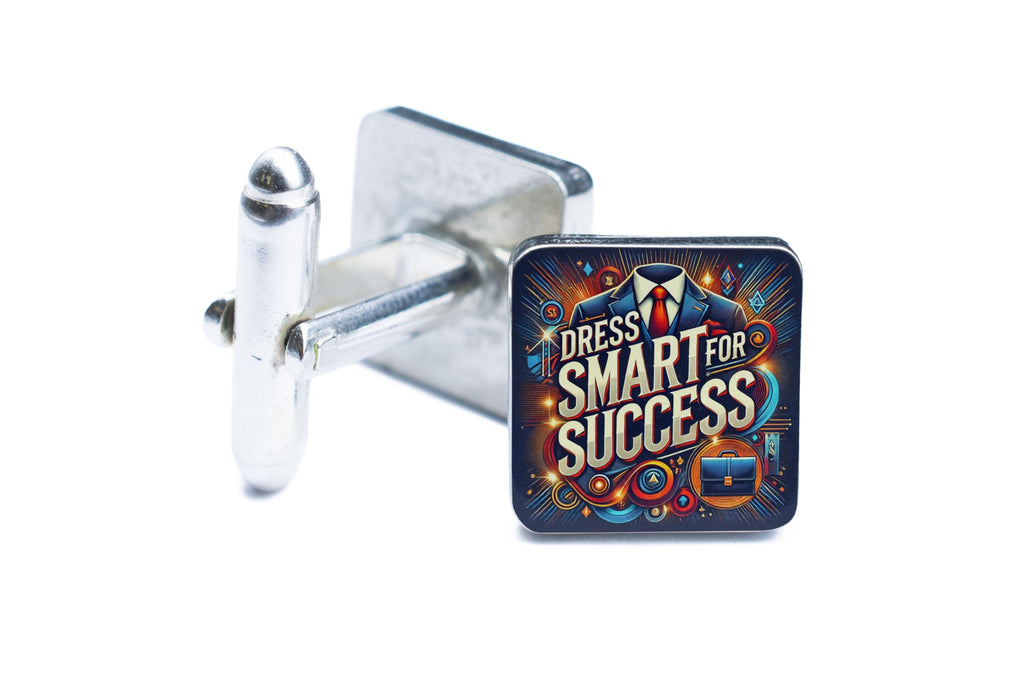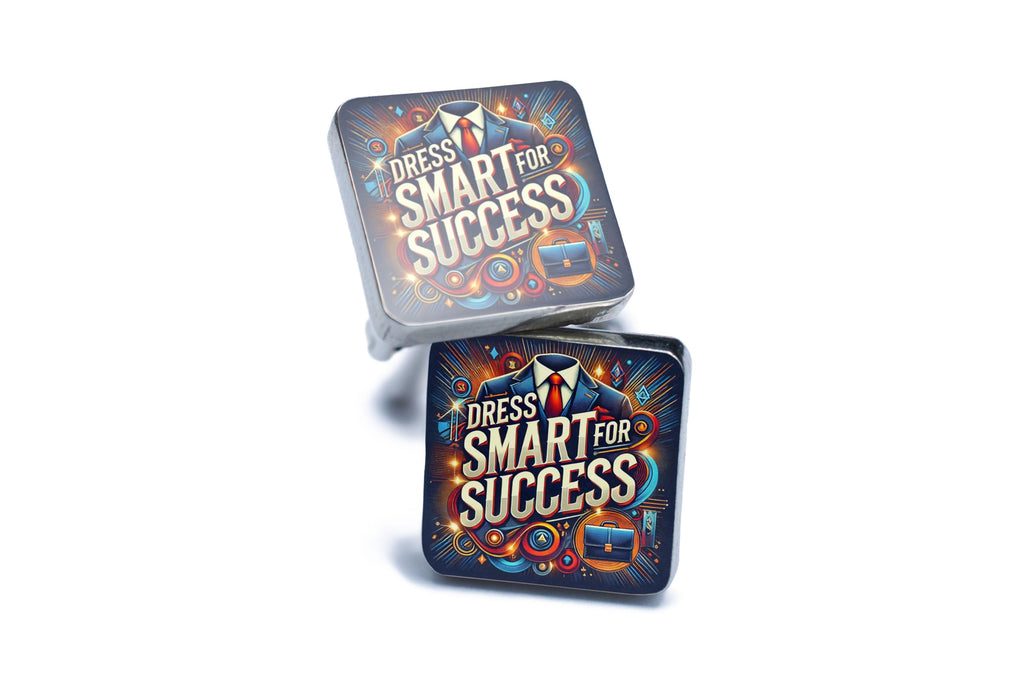 Elevate your professional dressing with our handcrafted UV printed success-themed cufflinks. These novelty cufflinks are the perfect accessory for anyone looking to dress smart and exude confidence in the office. Each pair is meticulously handcrafted from tin and pewter, then printed with a unique AI generated design that reads 'dress smart for success'. The full colour UV printing creates a bold and stylish look that is sure to make a statement in any business setting. These motivational cufflinks are a fun gift for anyone prioritising their professional appearance and looking to add a fun and unique accessory to their formal wear collection. Show off your success-themed cufflinks and stand out in the office with these one-of-a-kind pieces of office fashion.