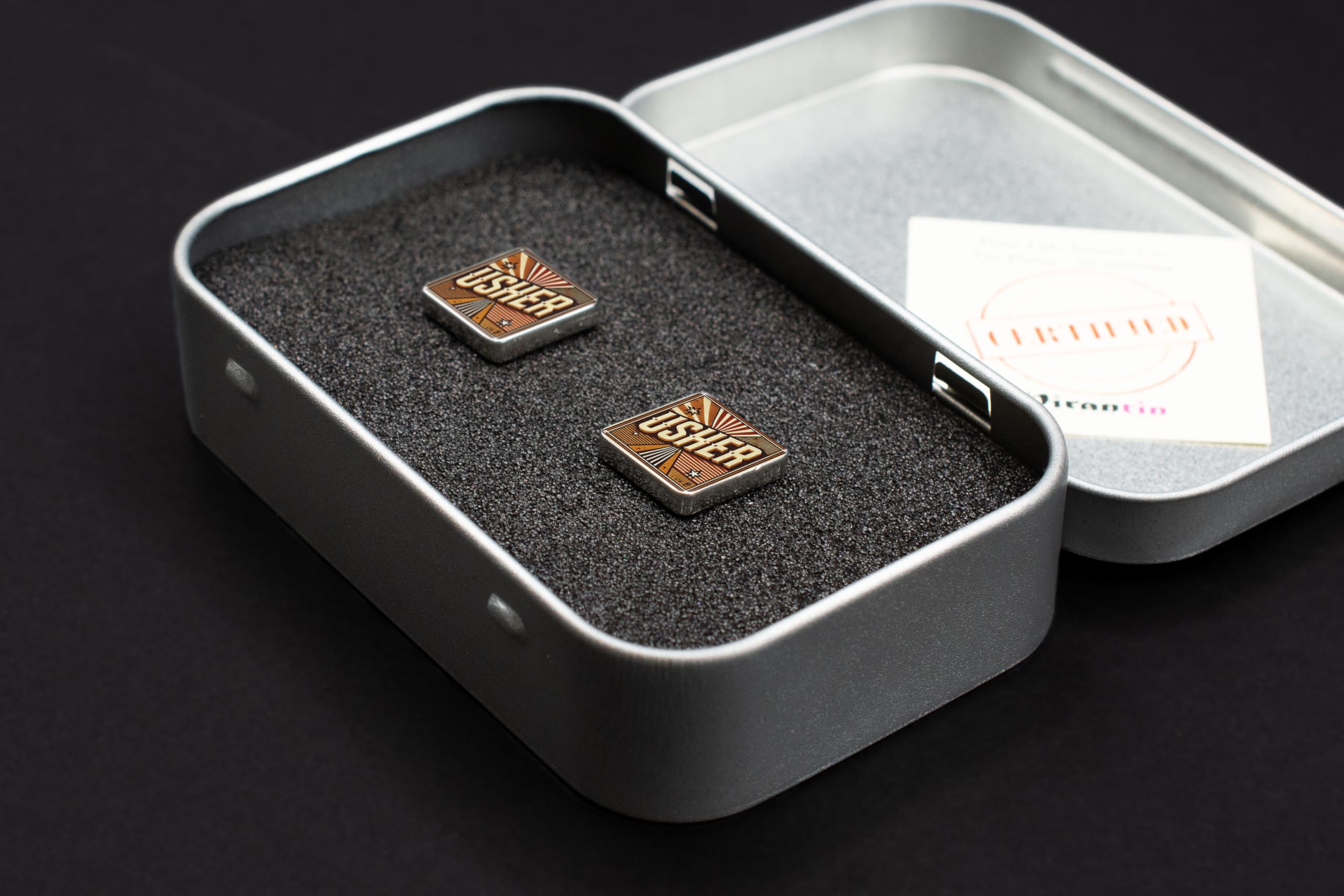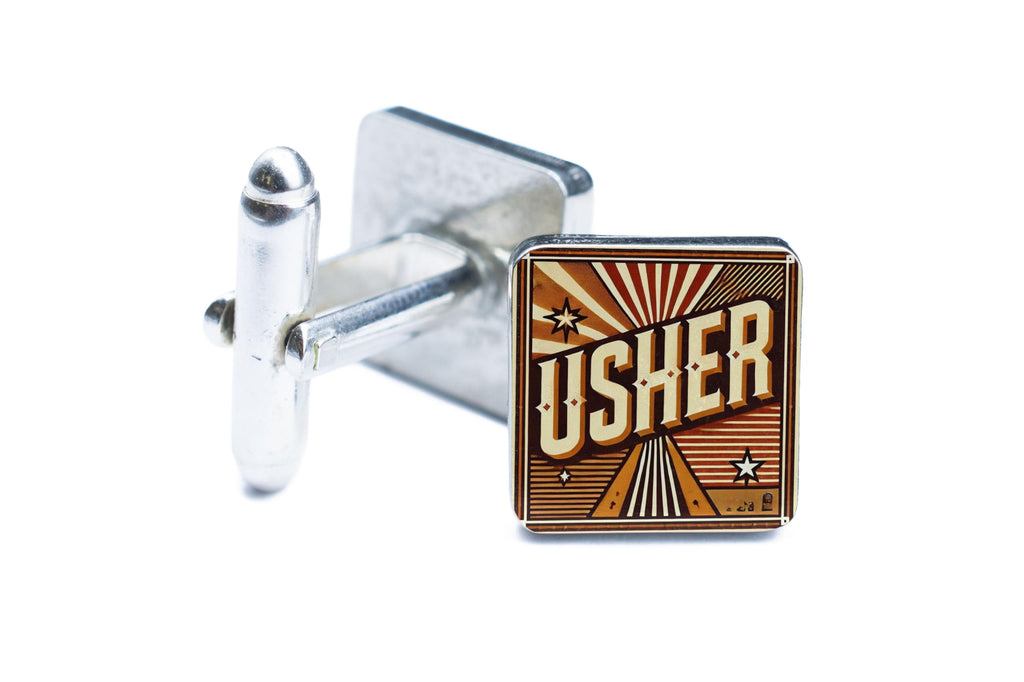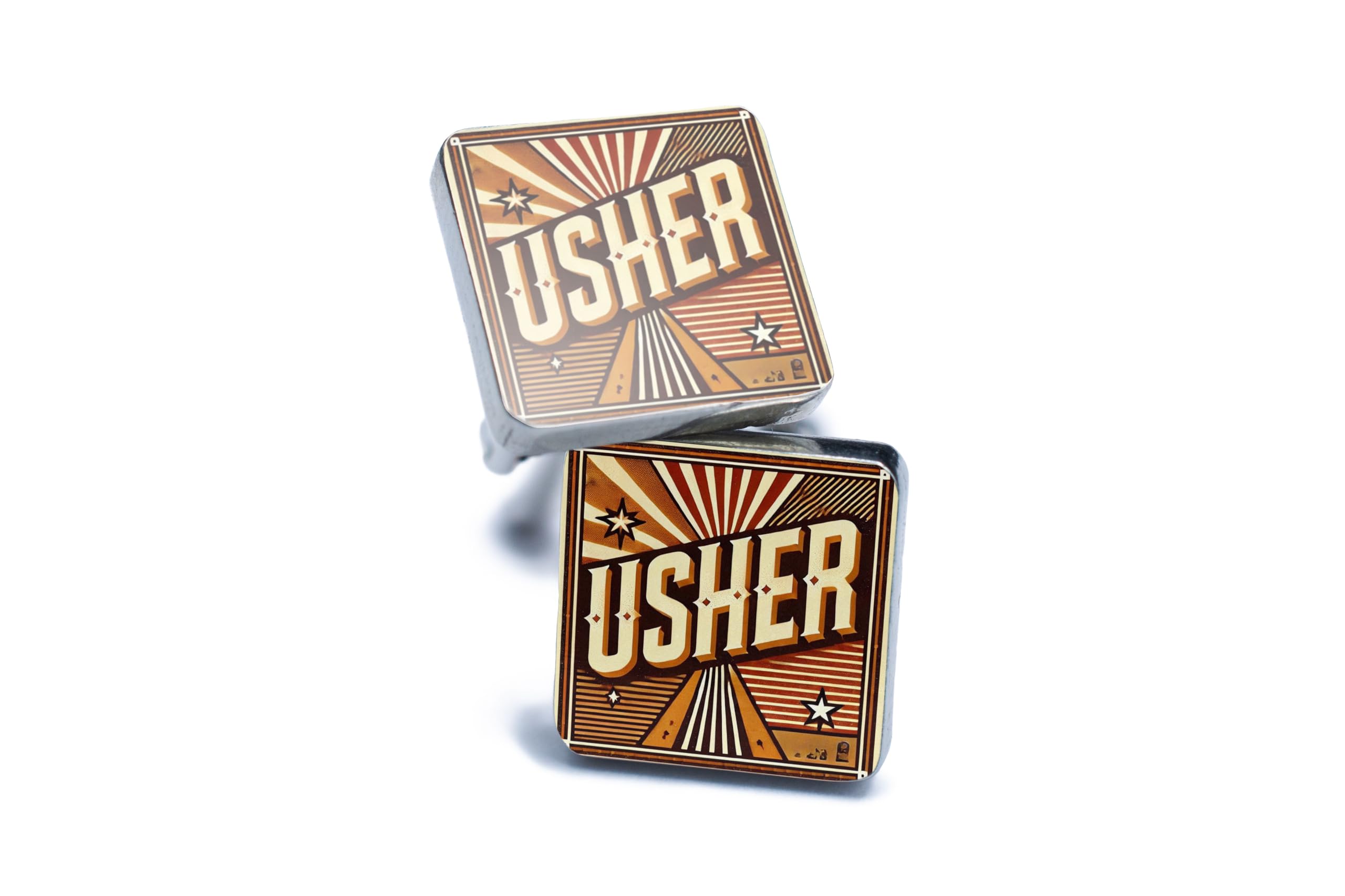 These Handcrafted Vintage Style UV Printed Usher Cufflinks are a must-have accessory for any stylish man. Made from quality handcrafted tin and pewter, these novelty cufflinks feature a UV printed design that reads 'usher' in a bold seventies style font. The full-colour printed design adds a touch of elegance to any formal outfit, making them the perfect accessory for weddings, events, or just to add a retro flair to your everyday attire. These cufflinks are a unique gift for groomsmen, ushers, or any man who appreciates vintage style and elegant fashion. Stand out from the crowd with these one-of-a-kind cufflinks that prioritise both style and craftsmanship.