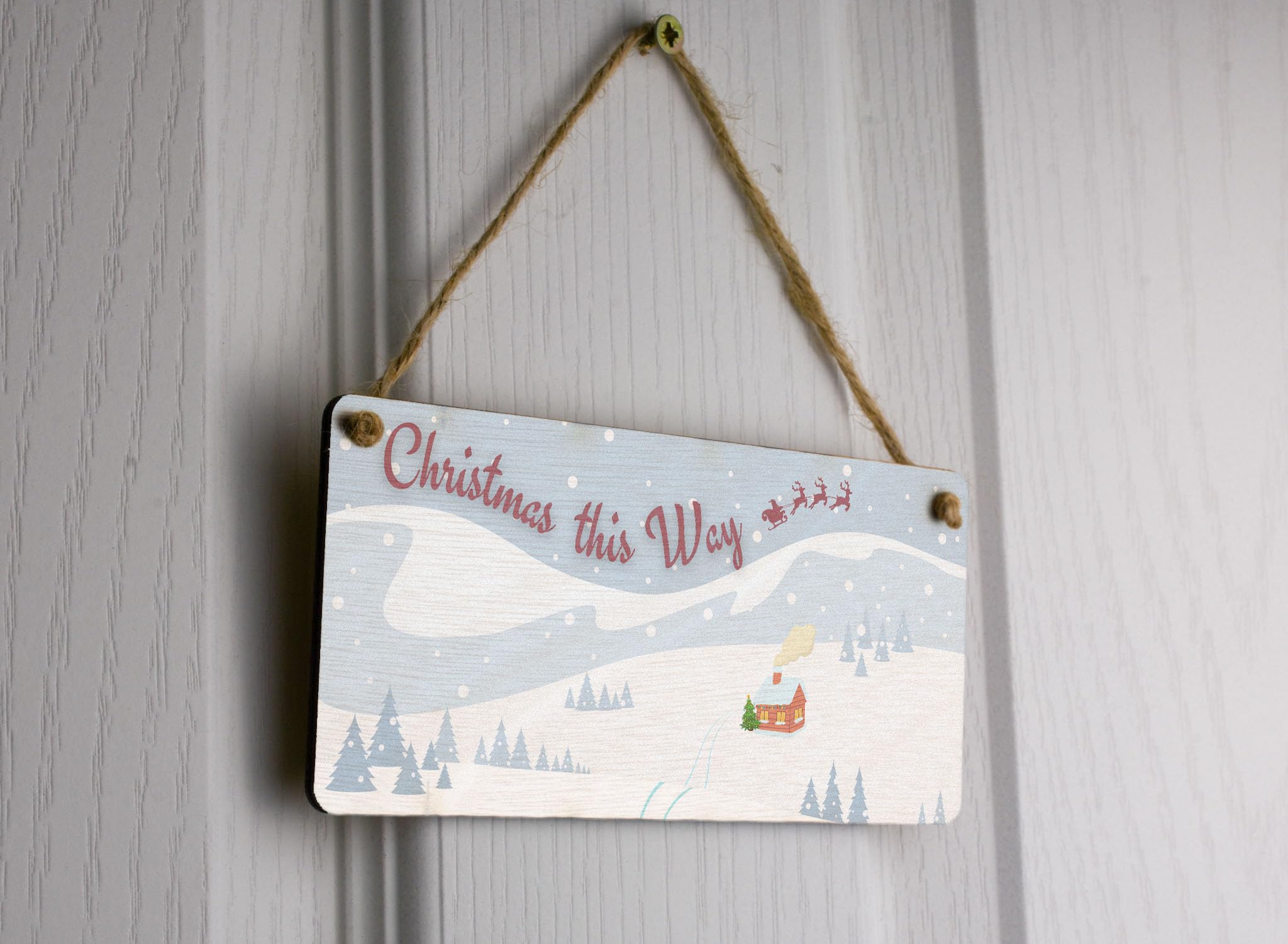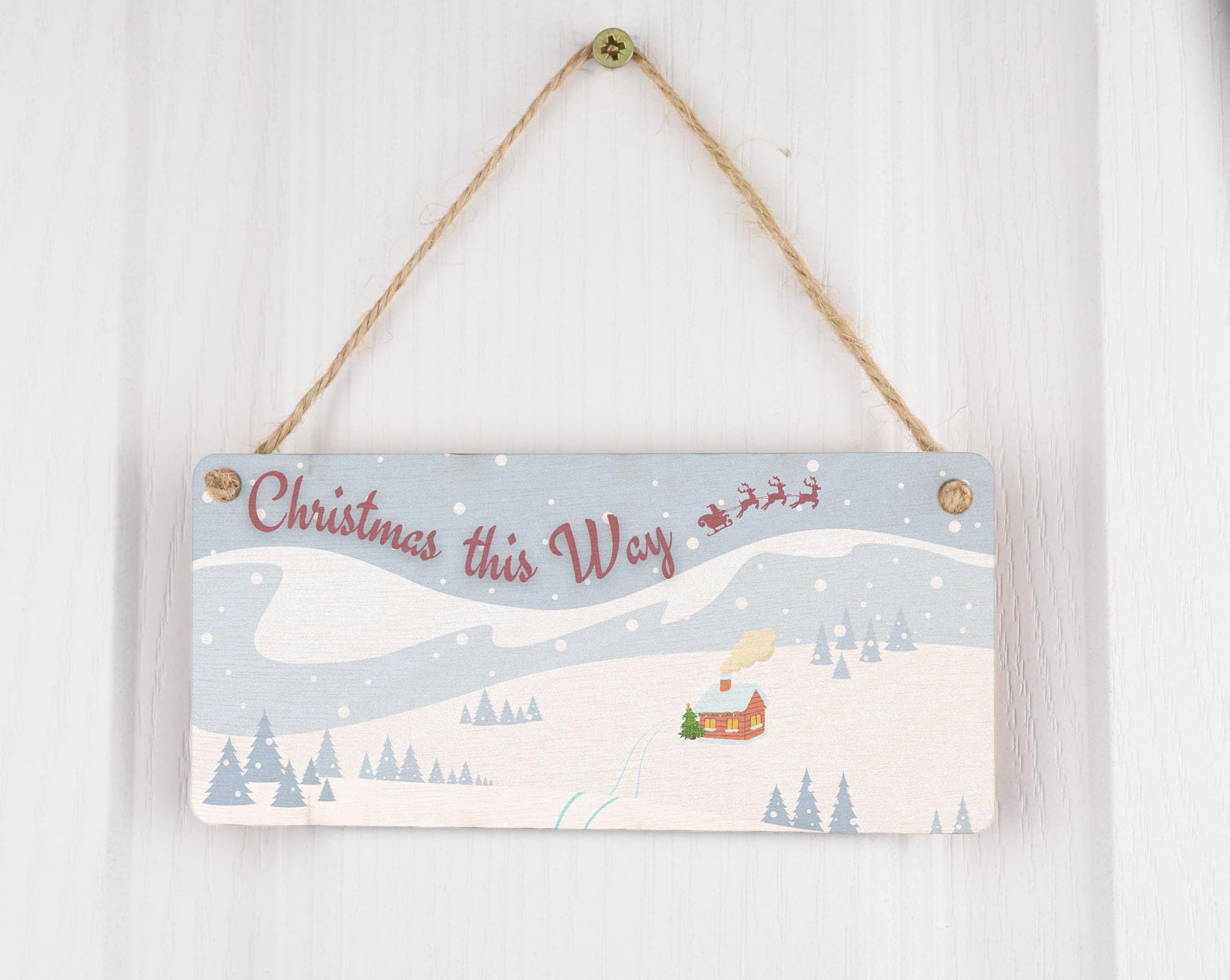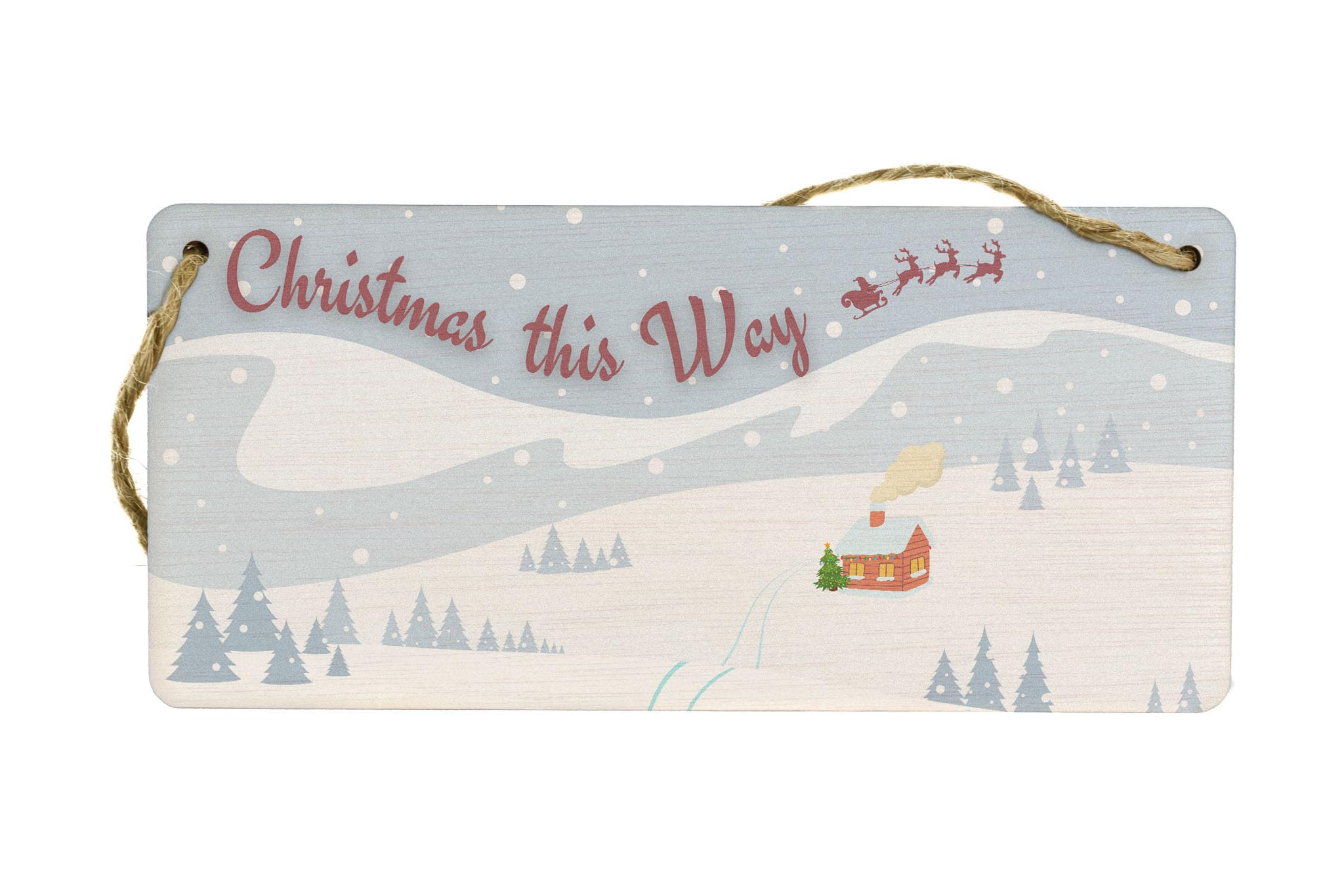 - UV printed sign with the message 'Christmas this way' and twine included for easy hanging