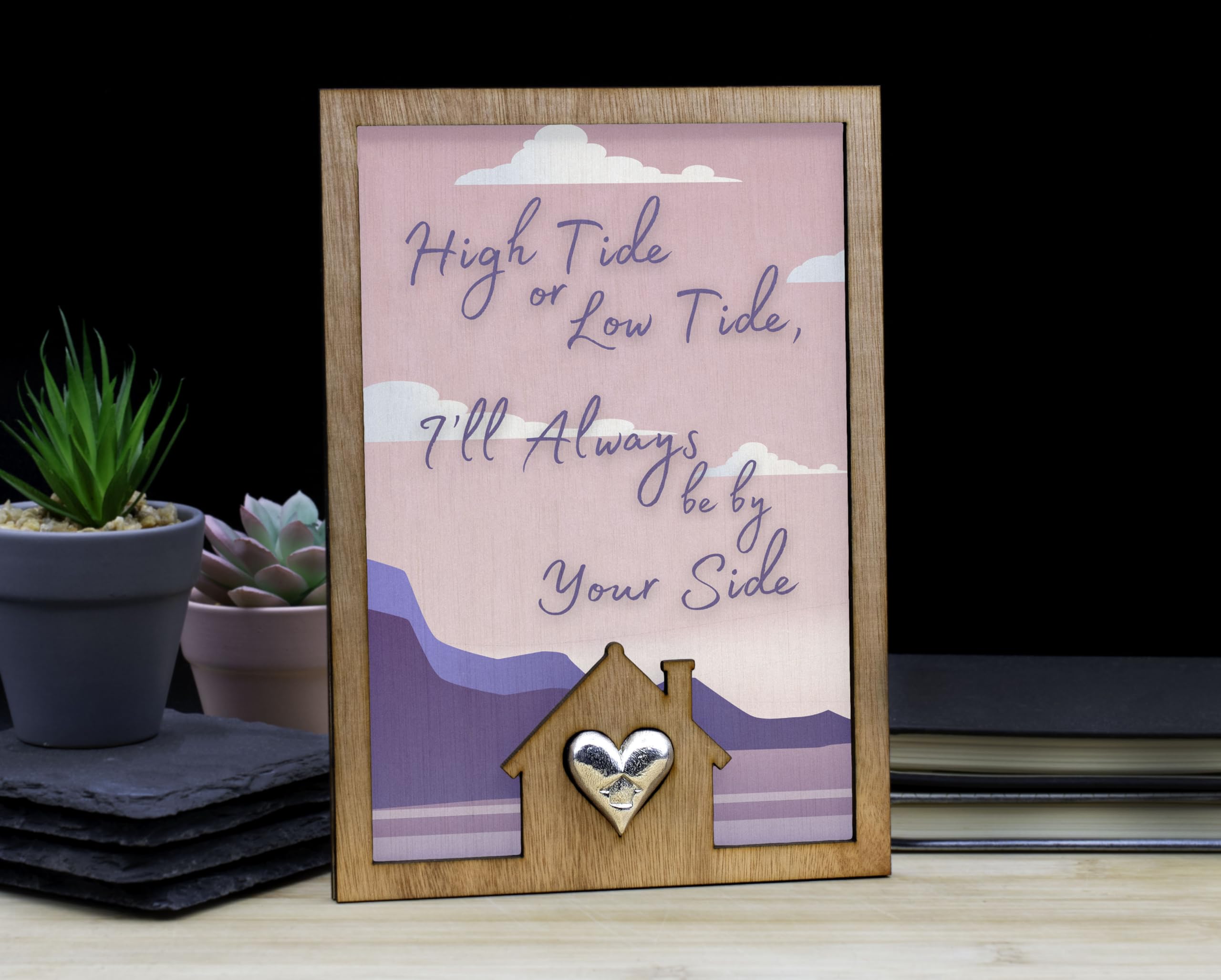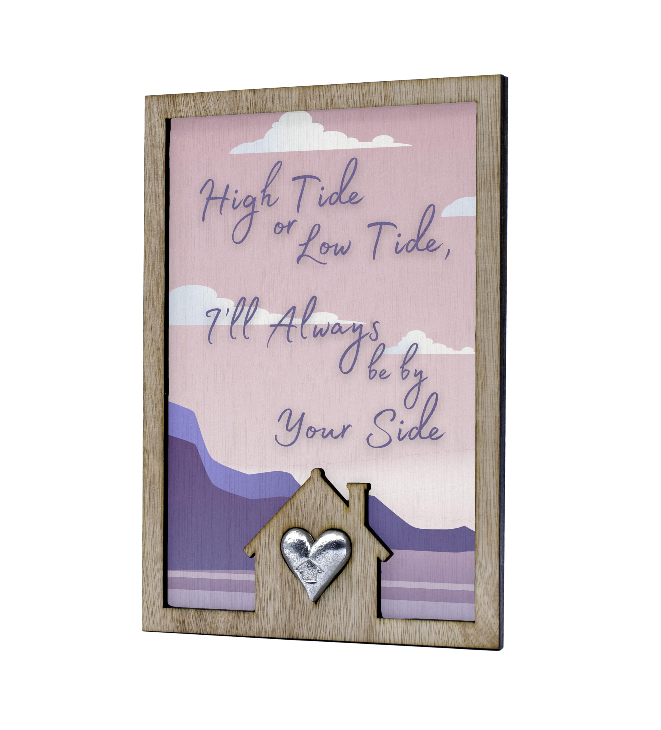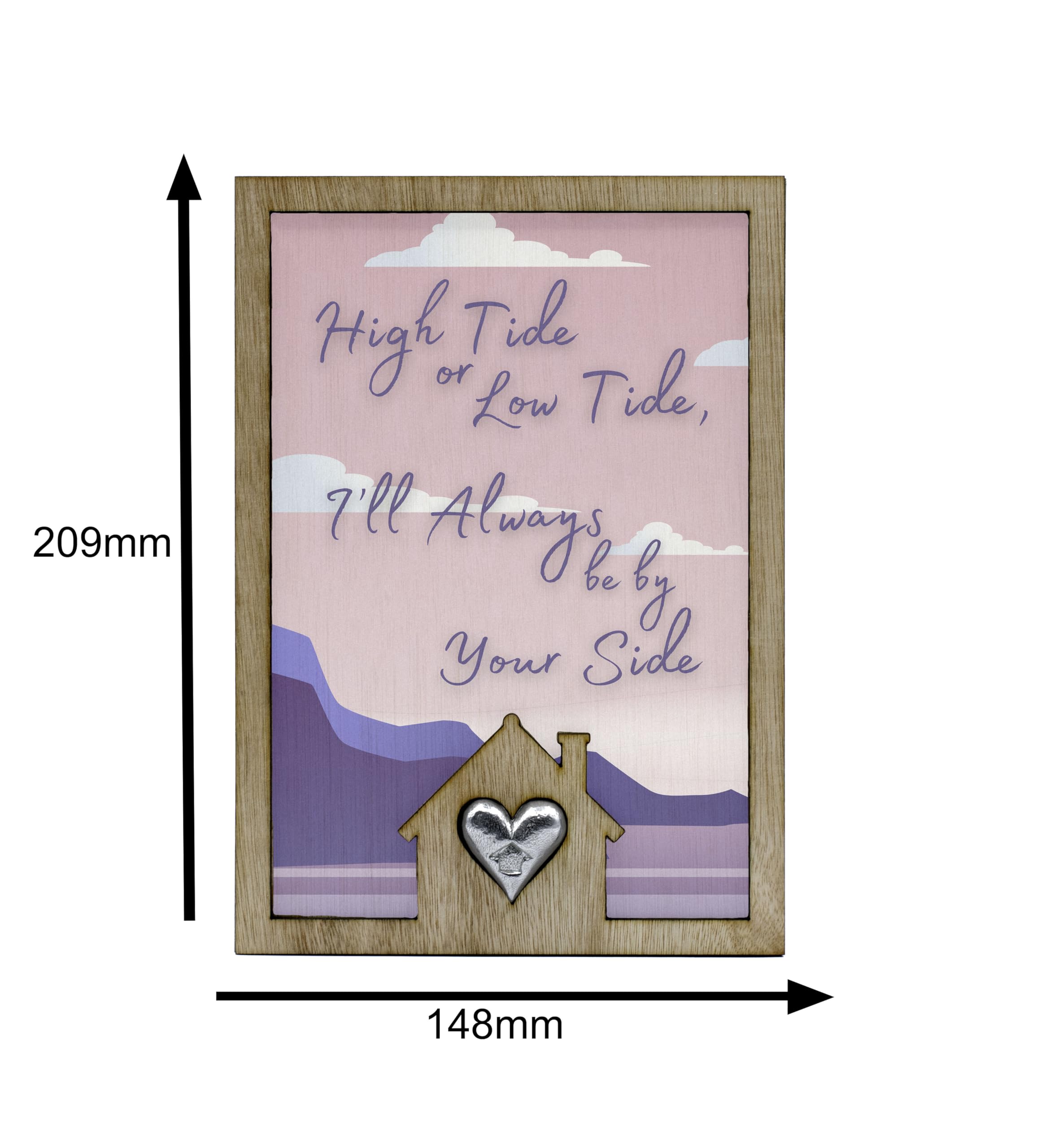 Add a touch of rustic charm and coastal elegance to your home with our handcrafted wooden plaque featuring a heart accent and a sentimental message. This beautiful piece of home decor is perfect for those who love the beach theme and nautical designs. The wooden frame adds to its decorative appeal while the inspirational quote 'high tide or low tide I'll always be by your side' adds a touch of love and support to any room. The full-colour ornament showcases a charming pink and purple cartoon-style ocean scene, making it a perfect addition to your mantlepiece. This motivational sign is a great romantic gift for your loved one, with subtle colours that will complement any decor.