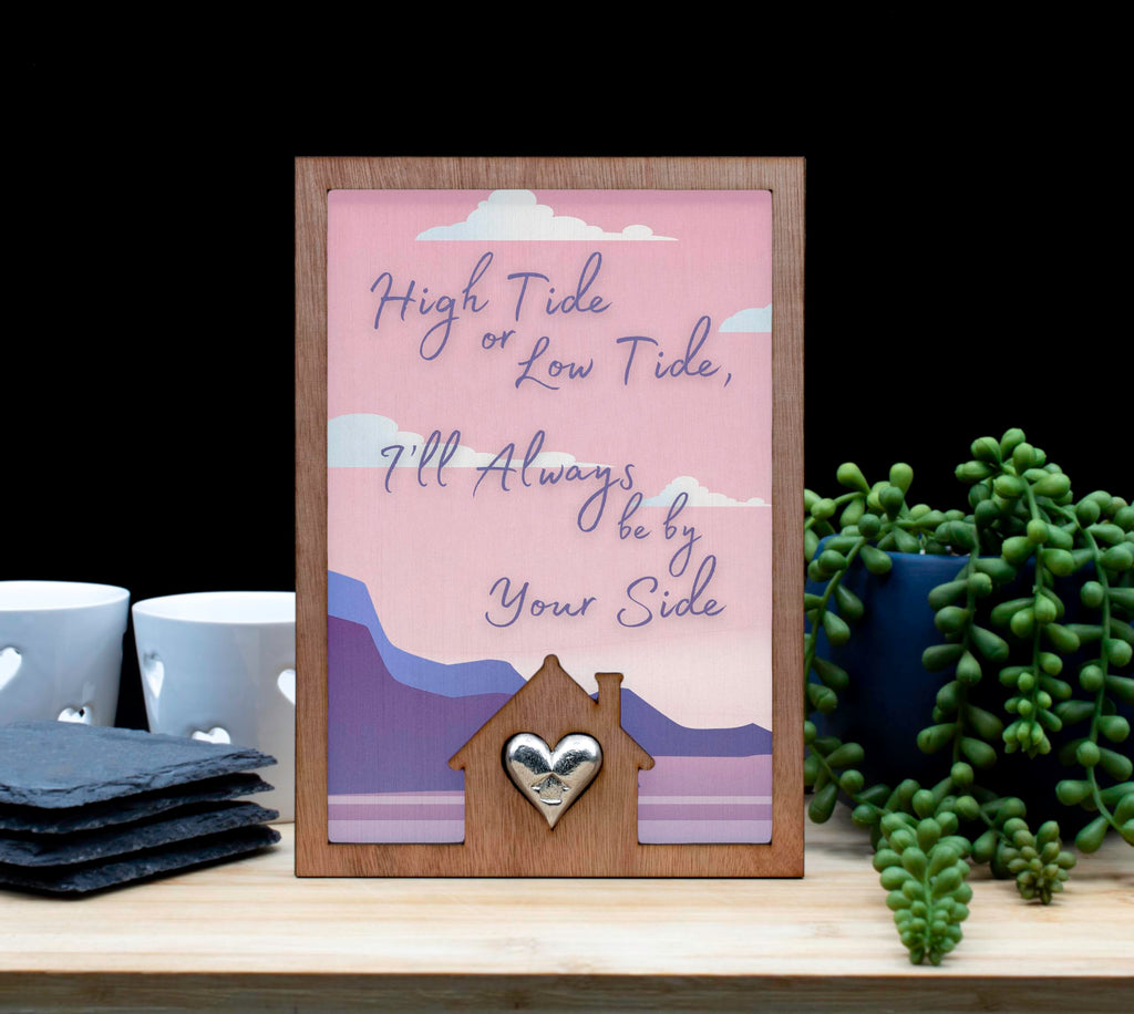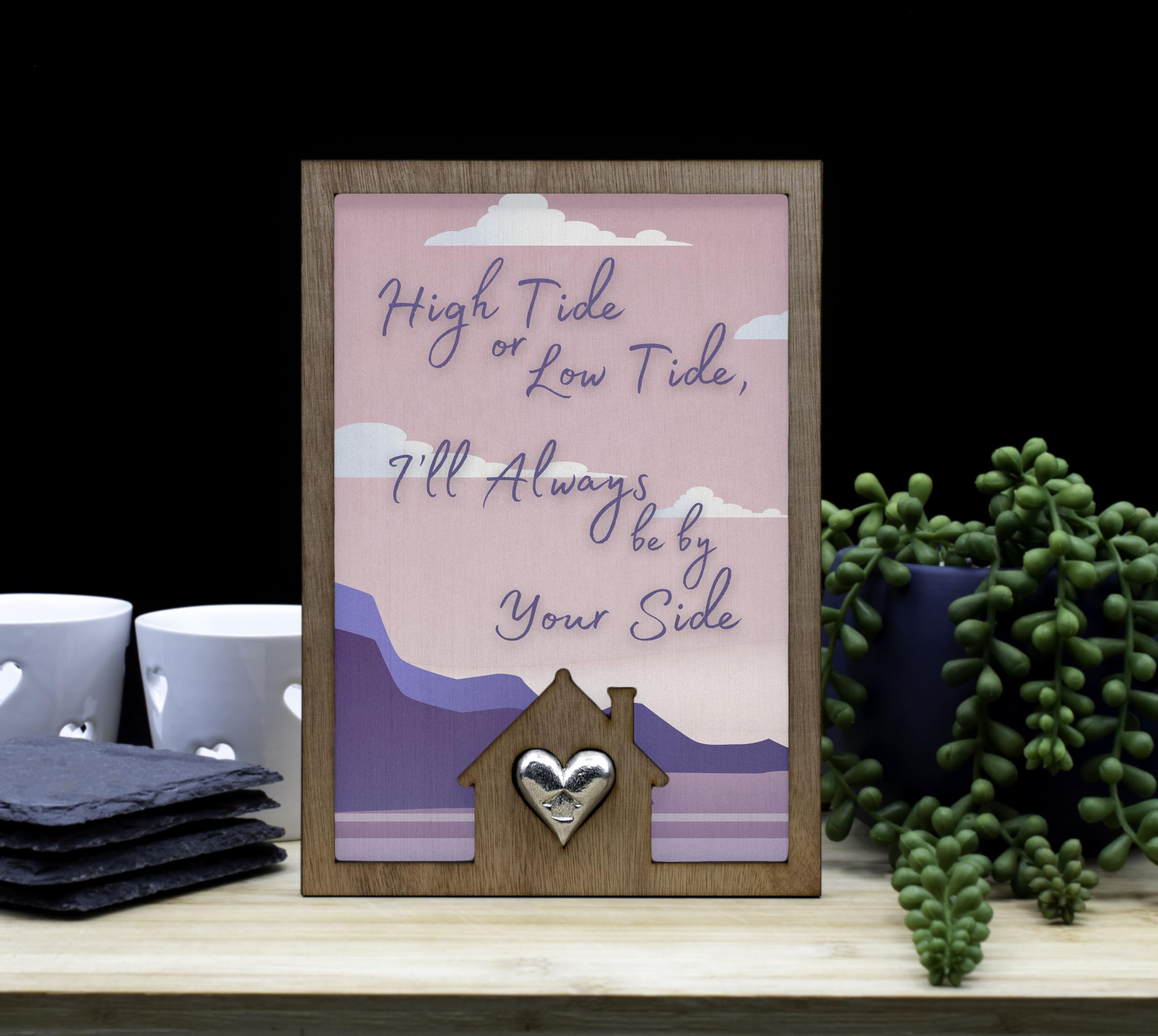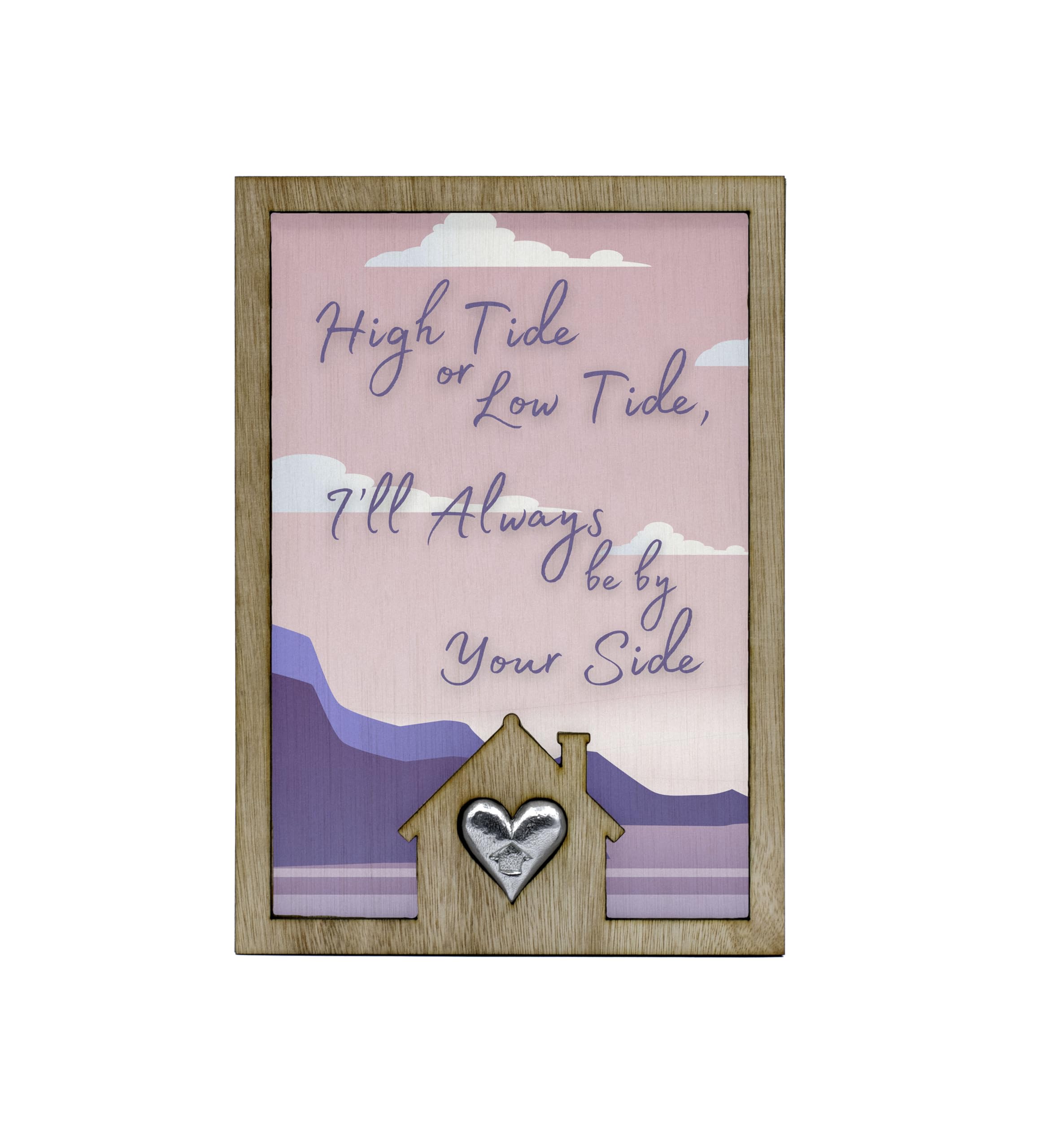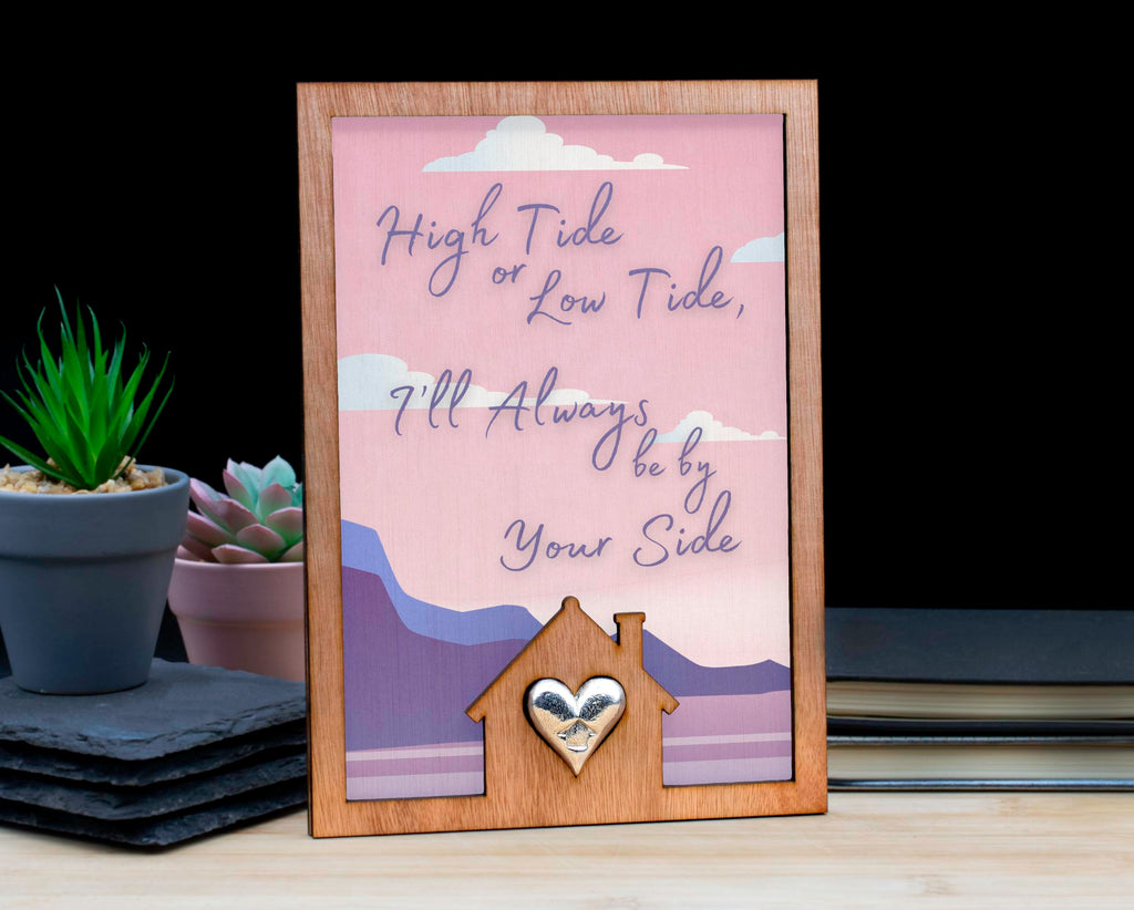 Add a touch of rustic charm and coastal elegance to your home with our handcrafted wooden plaque featuring a heart accent and a sentimental message. This beautiful piece of home decor is perfect for those who love the beach theme and nautical designs. The wooden frame adds to its decorative appeal while the inspirational quote 'high tide or low tide I'll always be by your side' adds a touch of love and support to any room. The full-colour ornament showcases a charming pink and purple cartoon-style ocean scene, making it a perfect addition to your mantlepiece. This motivational sign is a great romantic gift for your loved one, with subtle colours that will complement any decor.