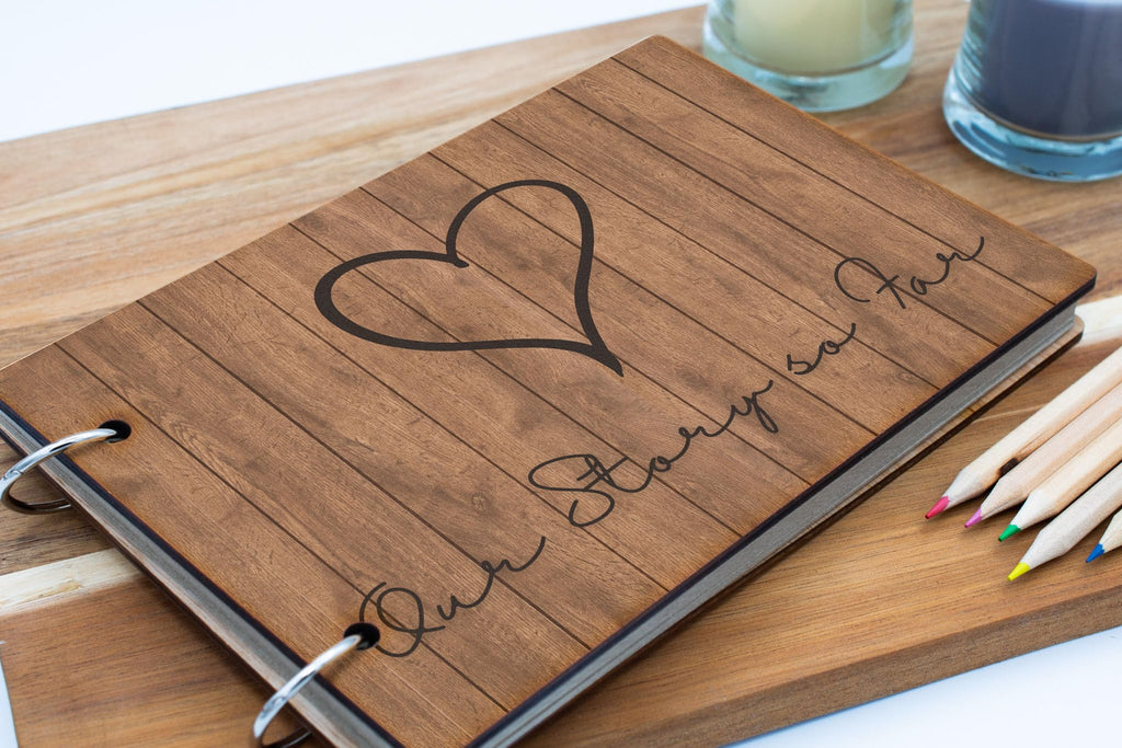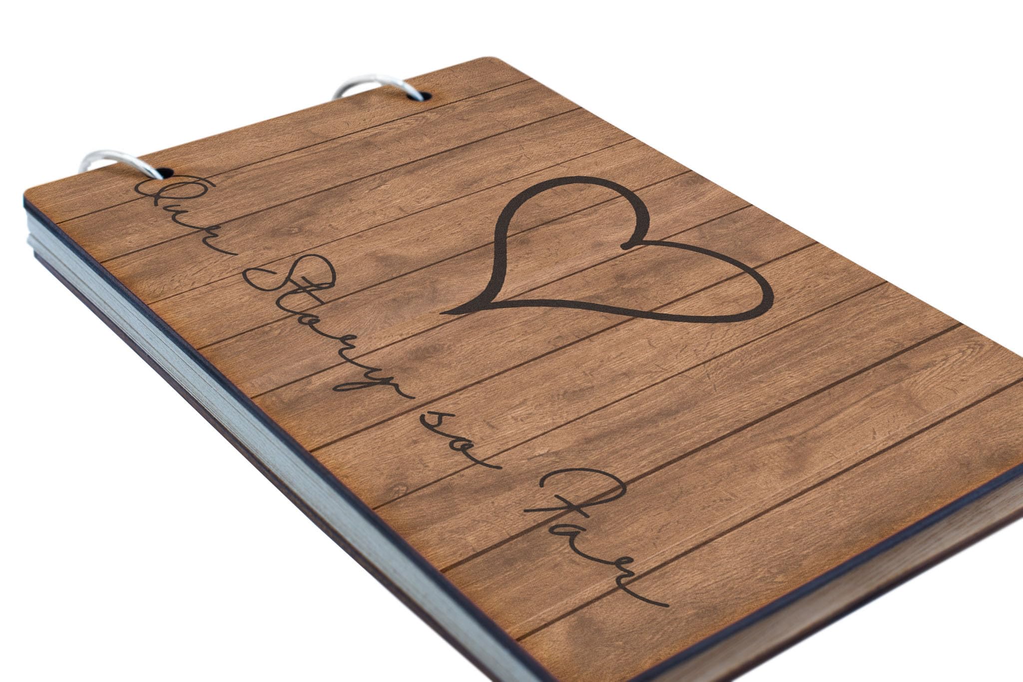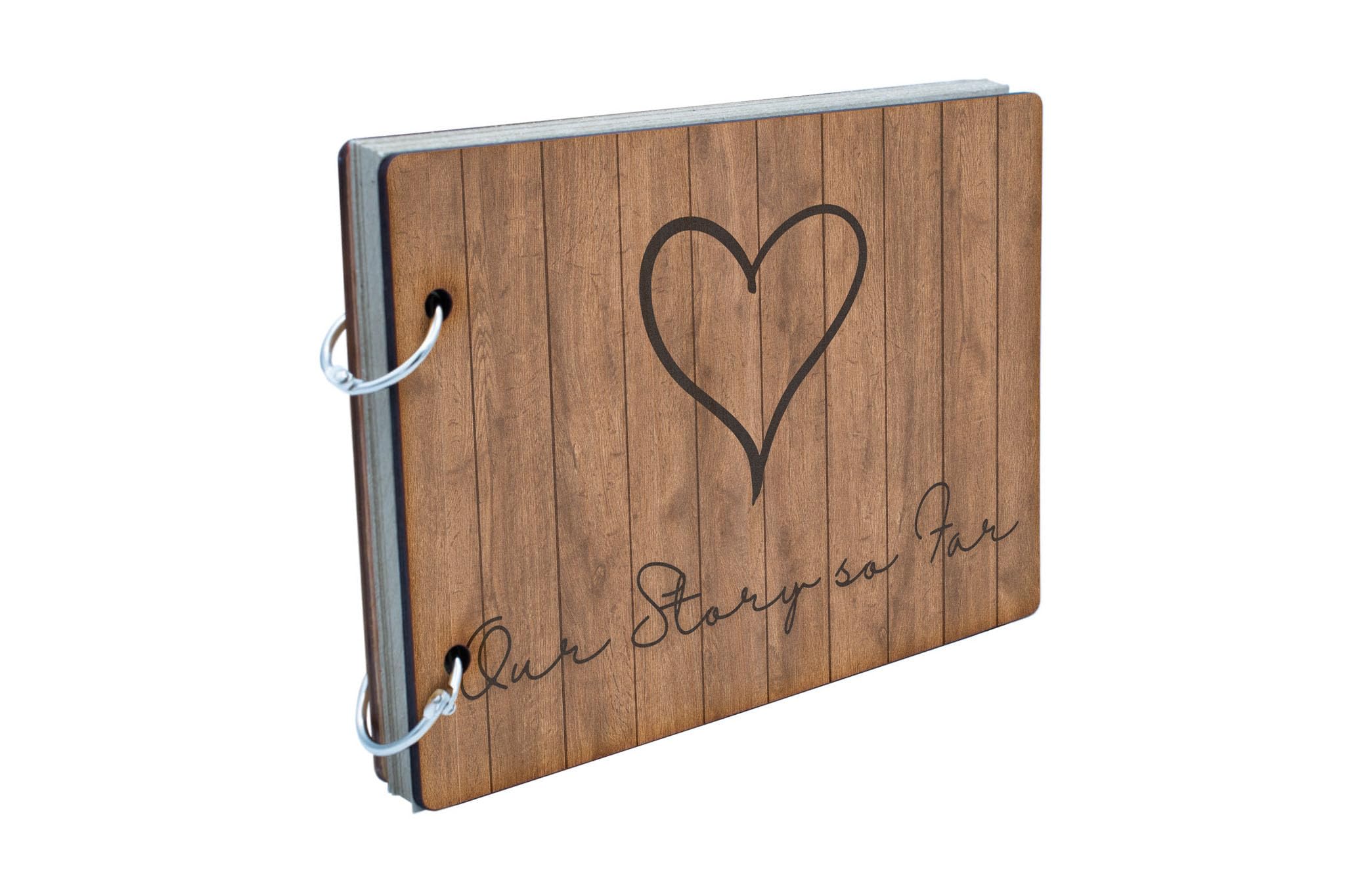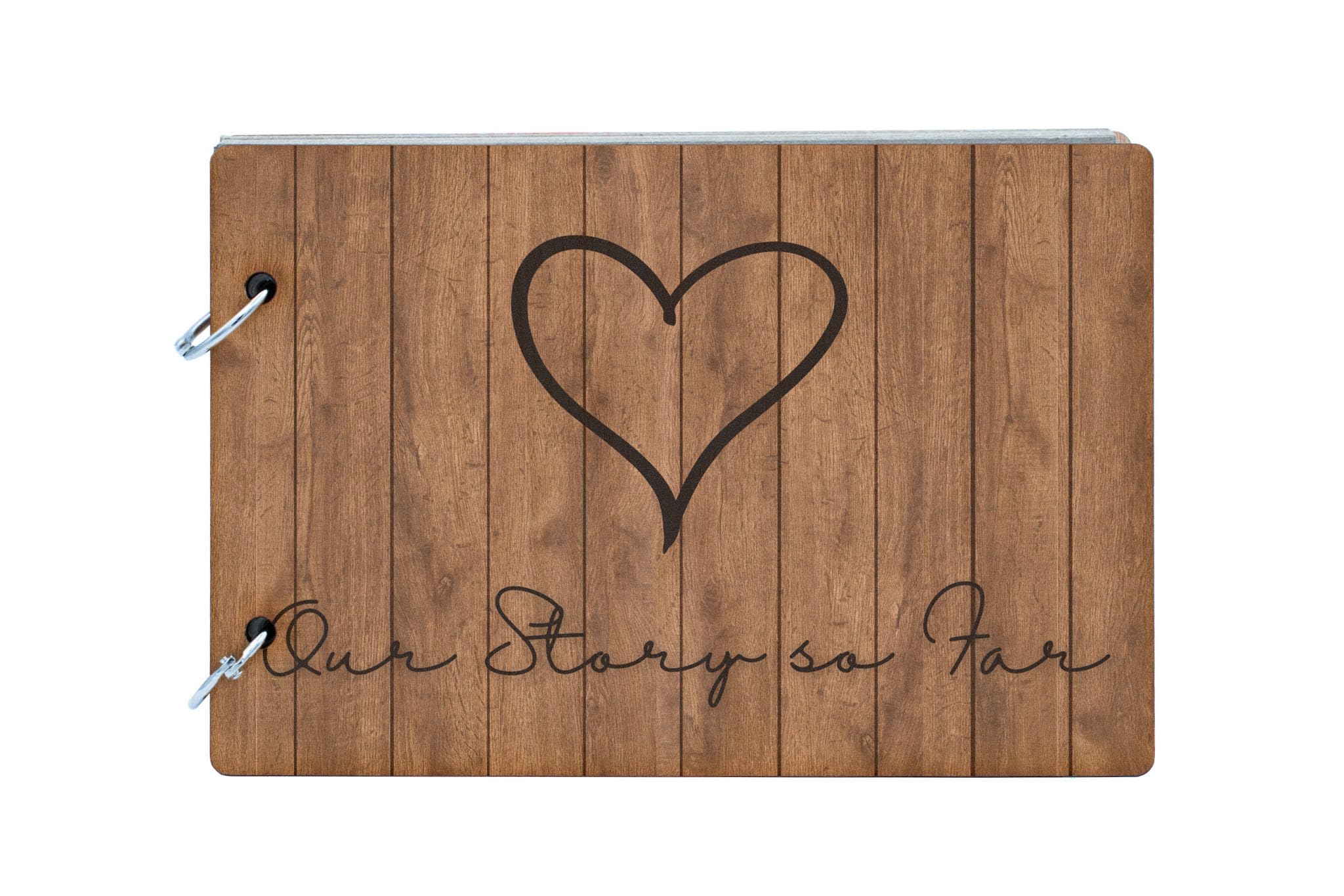 Introducing our Handcrafted Wooden Cover Love Story Memory Book, the perfect keepsake for couples to treasure their special moments together. This beautifully designed memory book features a rustic wooden cover with a heart design, creating a romantic and sentimental touch. Each page is made from 25 recycled pages, making it not only decorative but also environmentally friendly. This love story memory book is an ideal anniversary or engagement gift, allowing couples to cherish their journey, revisit memories, and prioritize their relationship. The full colour front cover showcases a rustic wooden pattern with a pyrographic title 'Our Story So Far', adding a personalised touch to this unique and timeless piece.