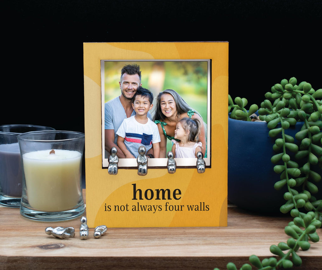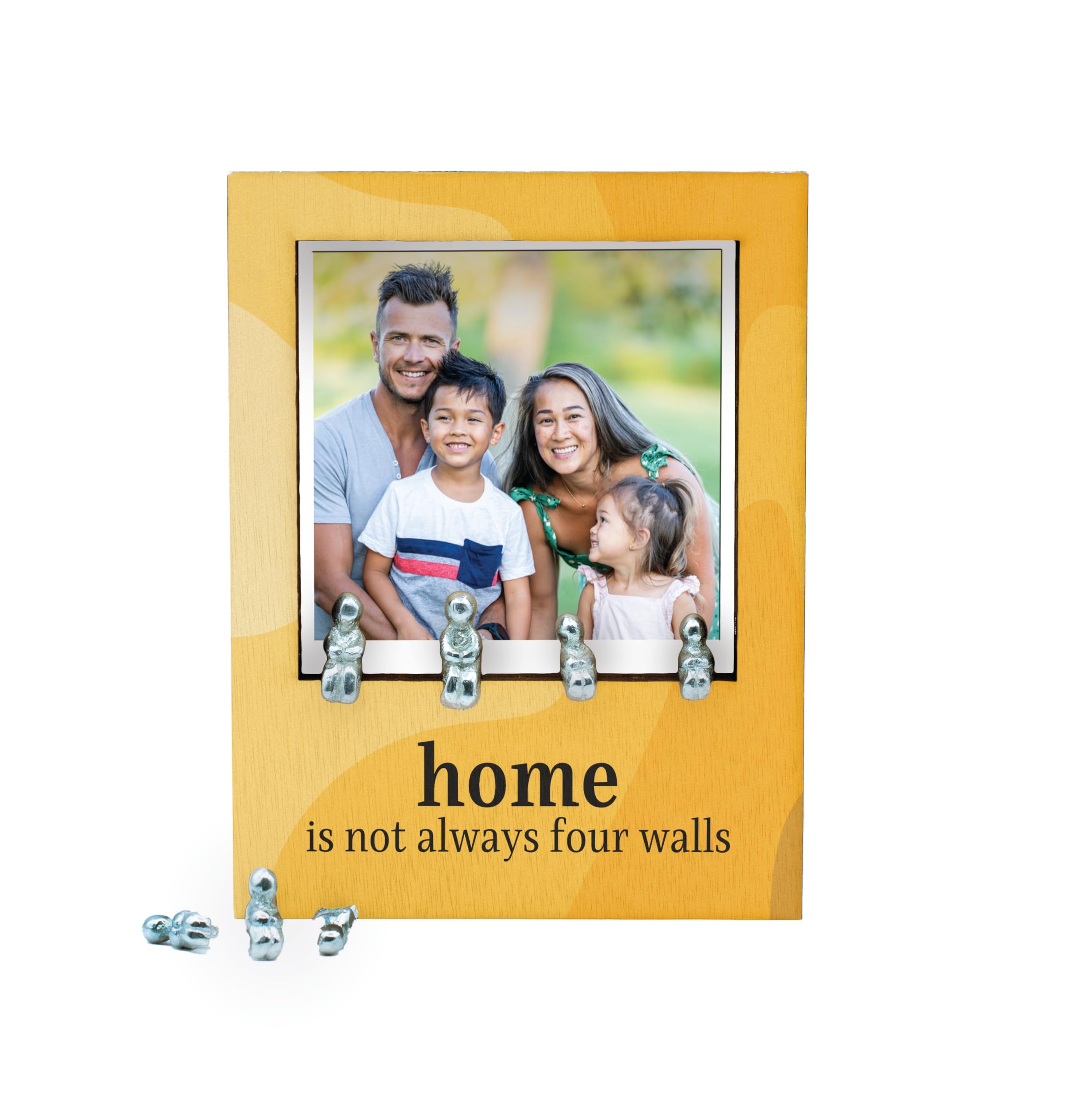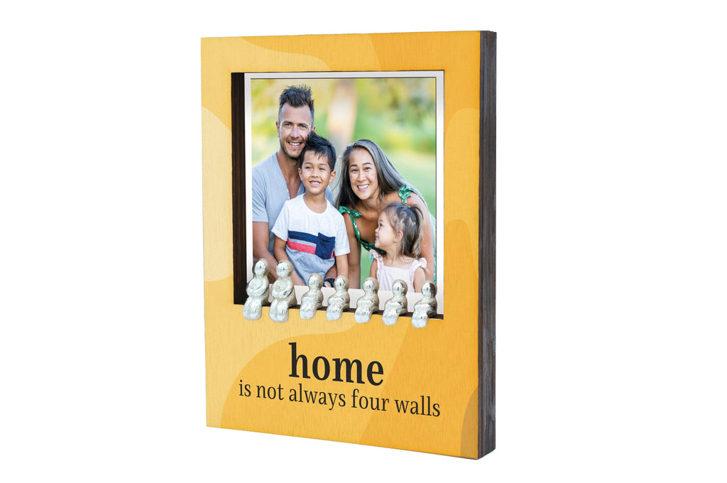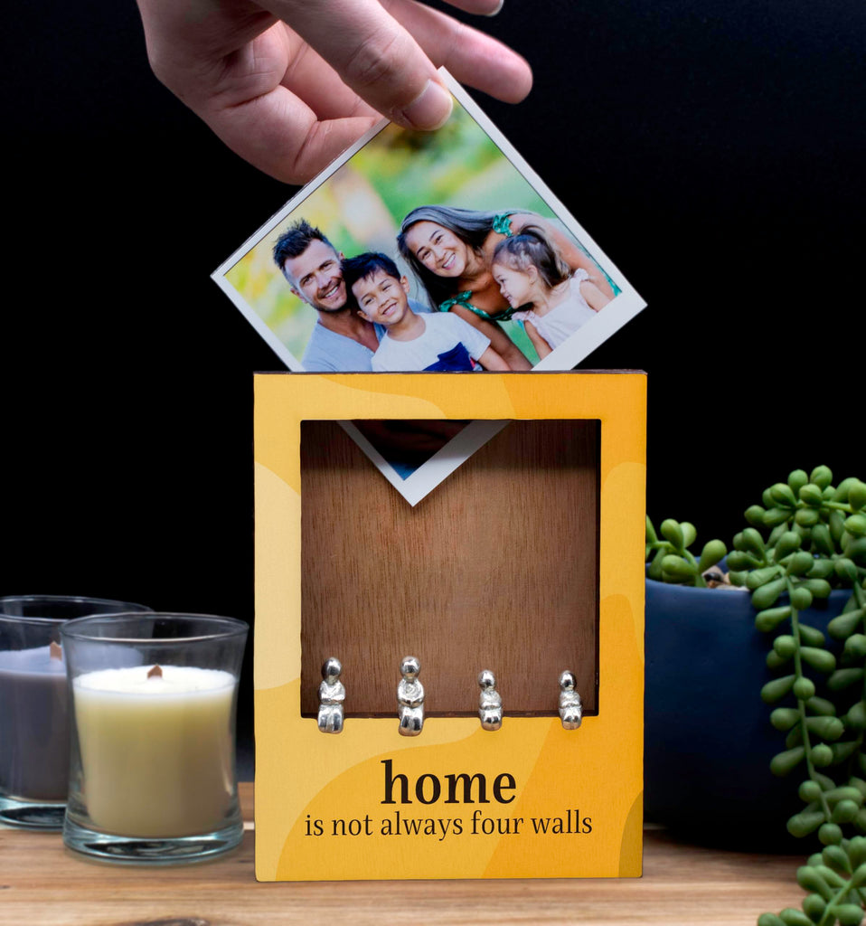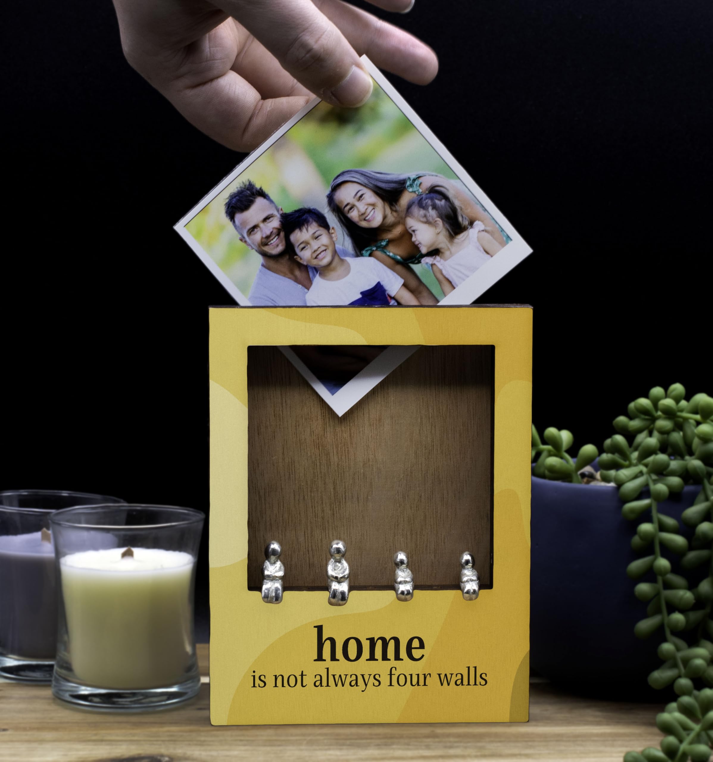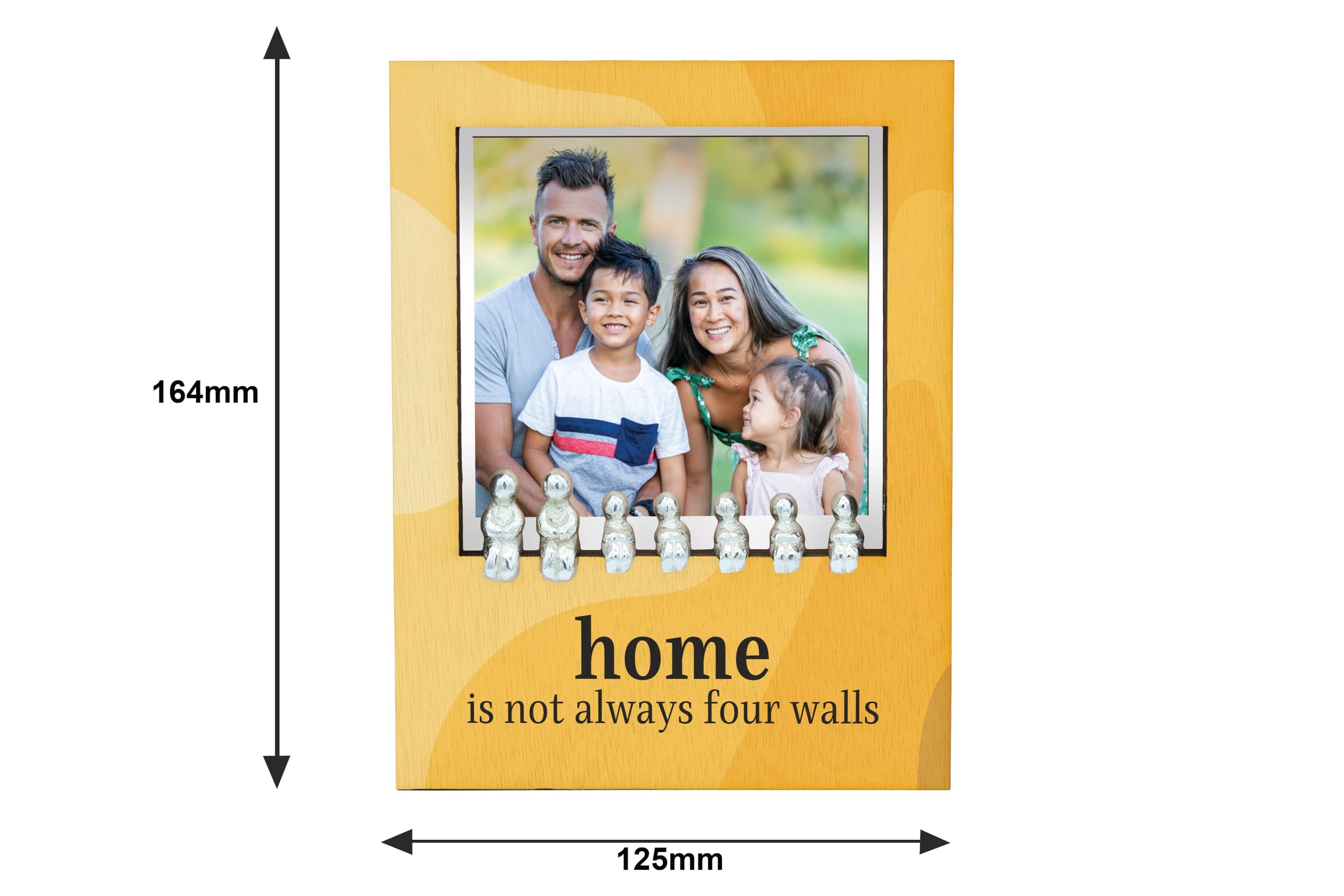 Introducing our handcrafted Wooden Family Frame with Tin Figurines and Heartfelt Quote, the perfect sentimental home decor piece for displaying your family memories. This unique family frame features a rustic wood frame made from quality plywood, with charming tin figurines included for an extra special touch. The frame is UV printed with the heartfelt quote 'home is not always four walls', adding a personal and meaningful touch to your display. This decorative family frame is a handmade-style frame that is sure to stand out in any room, making it a perfect novelty photo display and a heartfelt gift idea for your loved ones. The full-colour printed design on the frame is cute and simple, with bright colours that will complement any interior decor style, making it a truly unique addition to your home.