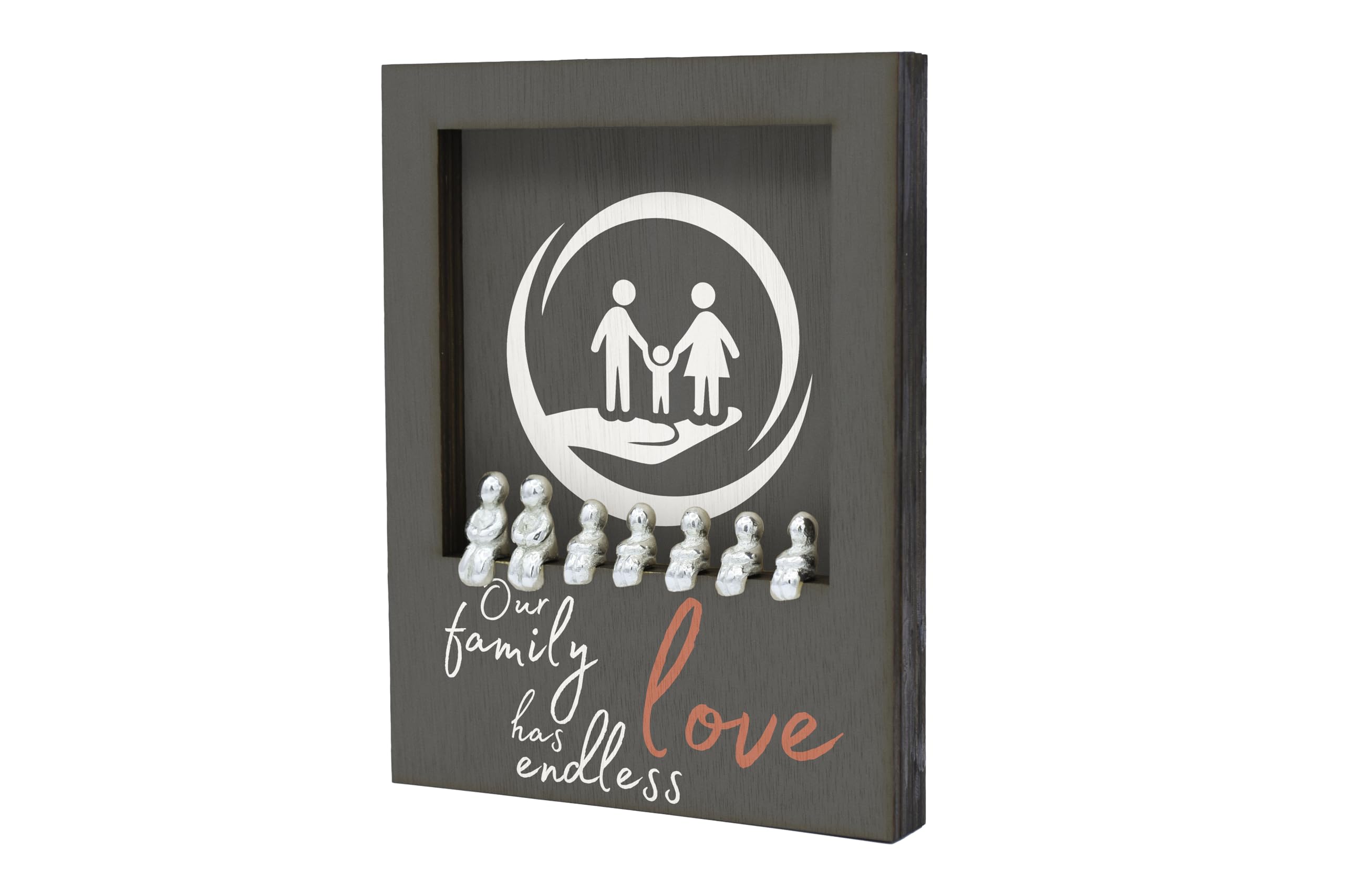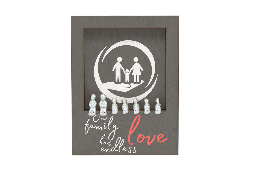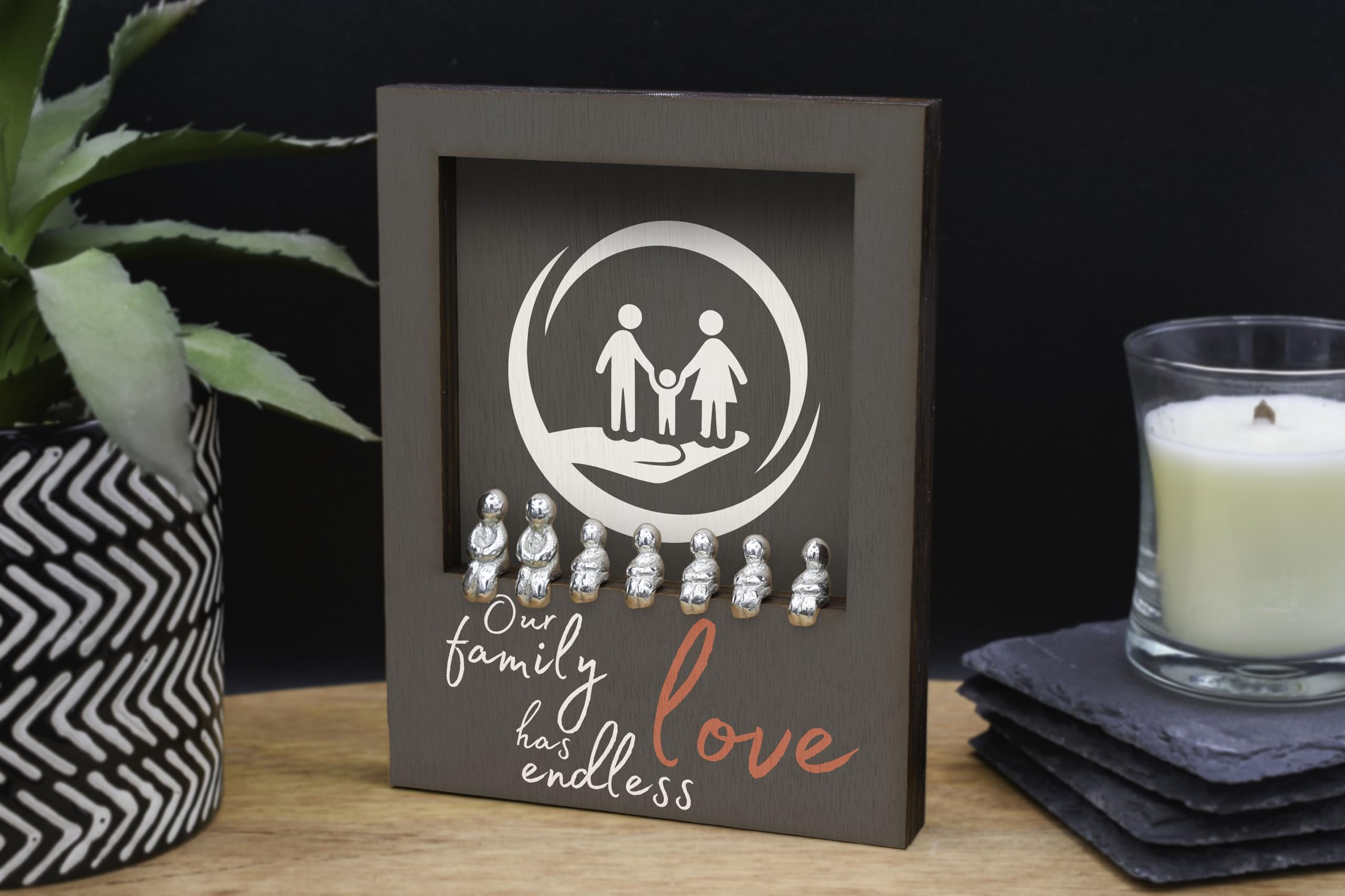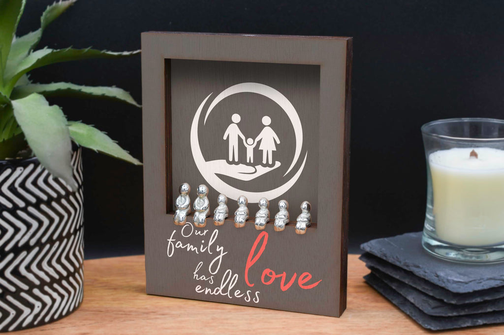Introducing our Handcrafted Wooden Frame with Loving Family Sentiment, a delightful addition to your home decor collection. This novelty, ornamental piece is perfect for anyone who appreciates sentimental and family-themed decorations. Crafted from quality wood, this elegant frame features sculpted figures and a loving message that will warm your heart. The artistic craftsmanship is evident in every detail of this timeless piece, making it a perfect keepsake for your family. Whether displayed on a tabletop or hung on a wall, this minimalist design will enhance any room with its heartfelt sentiment. Add a touch of love and warmth to your home with this beautiful handcrafted laser-cut plywood photo frame, complete with a tin figurine and UV printed design. The frame reads 'Our family has endless love', surrounded by a full-color printed design that showcases a simple and cute heartfelt message.