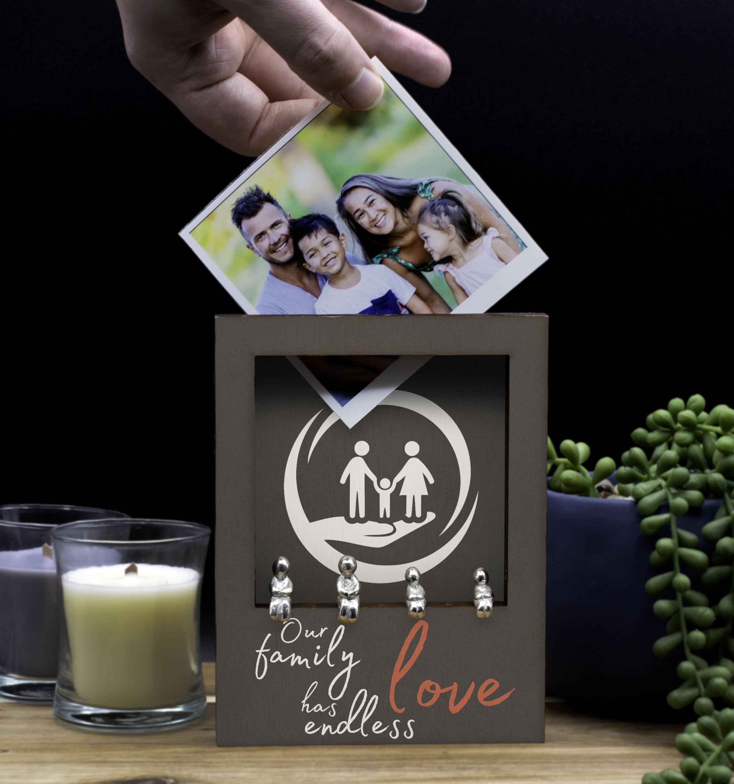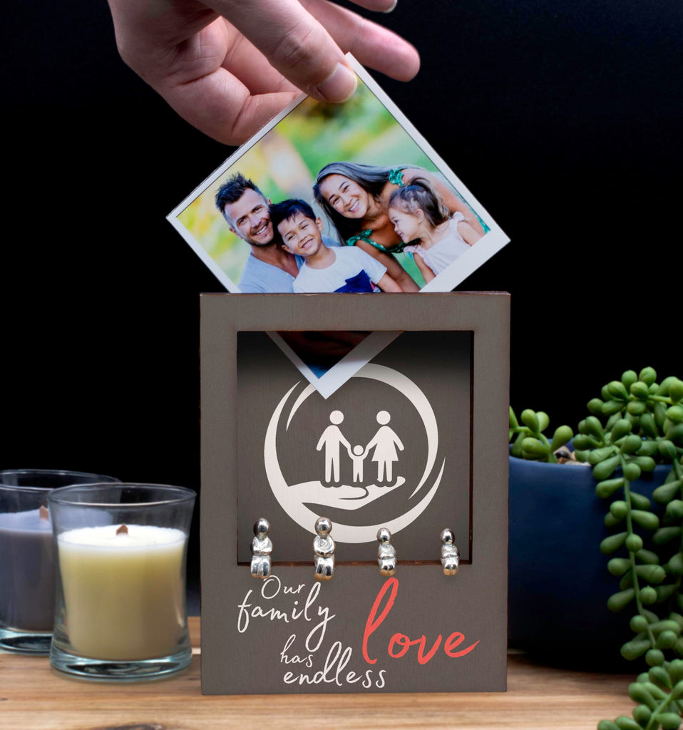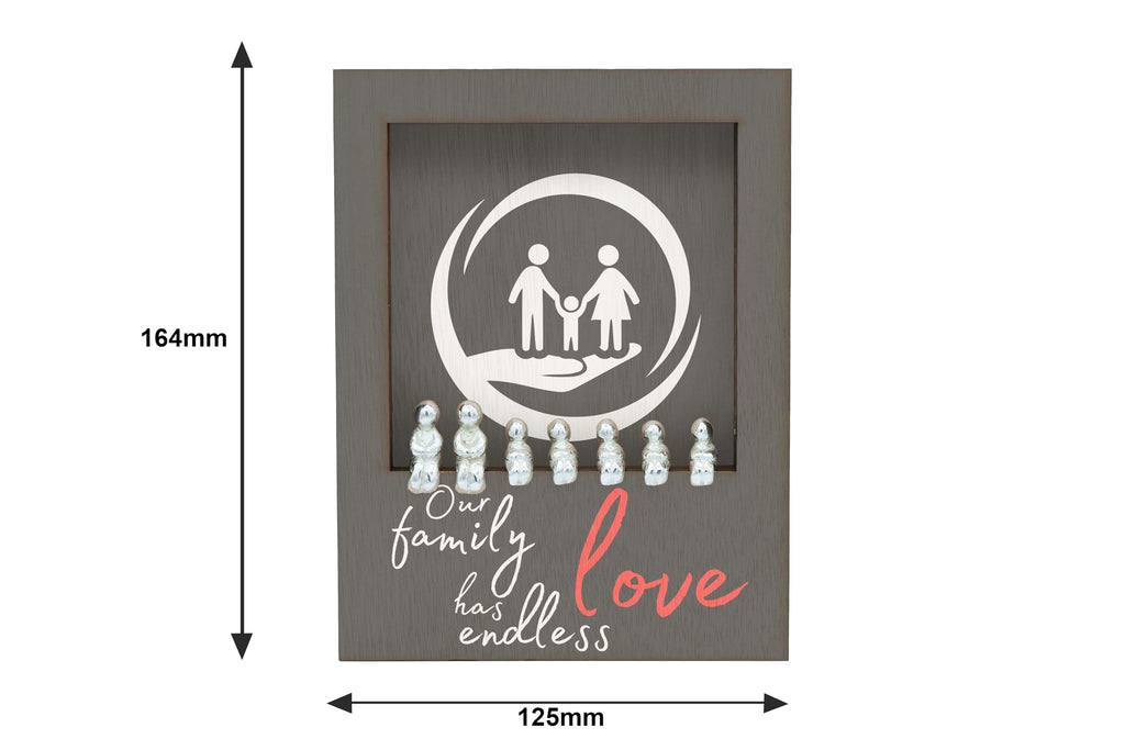 Introducing our Handcrafted Wooden Frame with Loving Family Sentiment, a delightful addition to your home decor collection. This novelty, ornamental piece is perfect for anyone who appreciates sentimental and family-themed decorations. Crafted from quality wood, this elegant frame features sculpted figures and a loving message that will warm your heart. The artistic craftsmanship is evident in every detail of this timeless piece, making it a perfect keepsake for your family. Whether displayed on a tabletop or hung on a wall, this minimalist design will enhance any room with its heartfelt sentiment. Add a touch of love and warmth to your home with this beautiful handcrafted laser-cut plywood photo frame, complete with a tin figurine and UV printed design. The frame reads 'Our family has endless love', surrounded by a full-color printed design that showcases a simple and cute heartfelt message.
