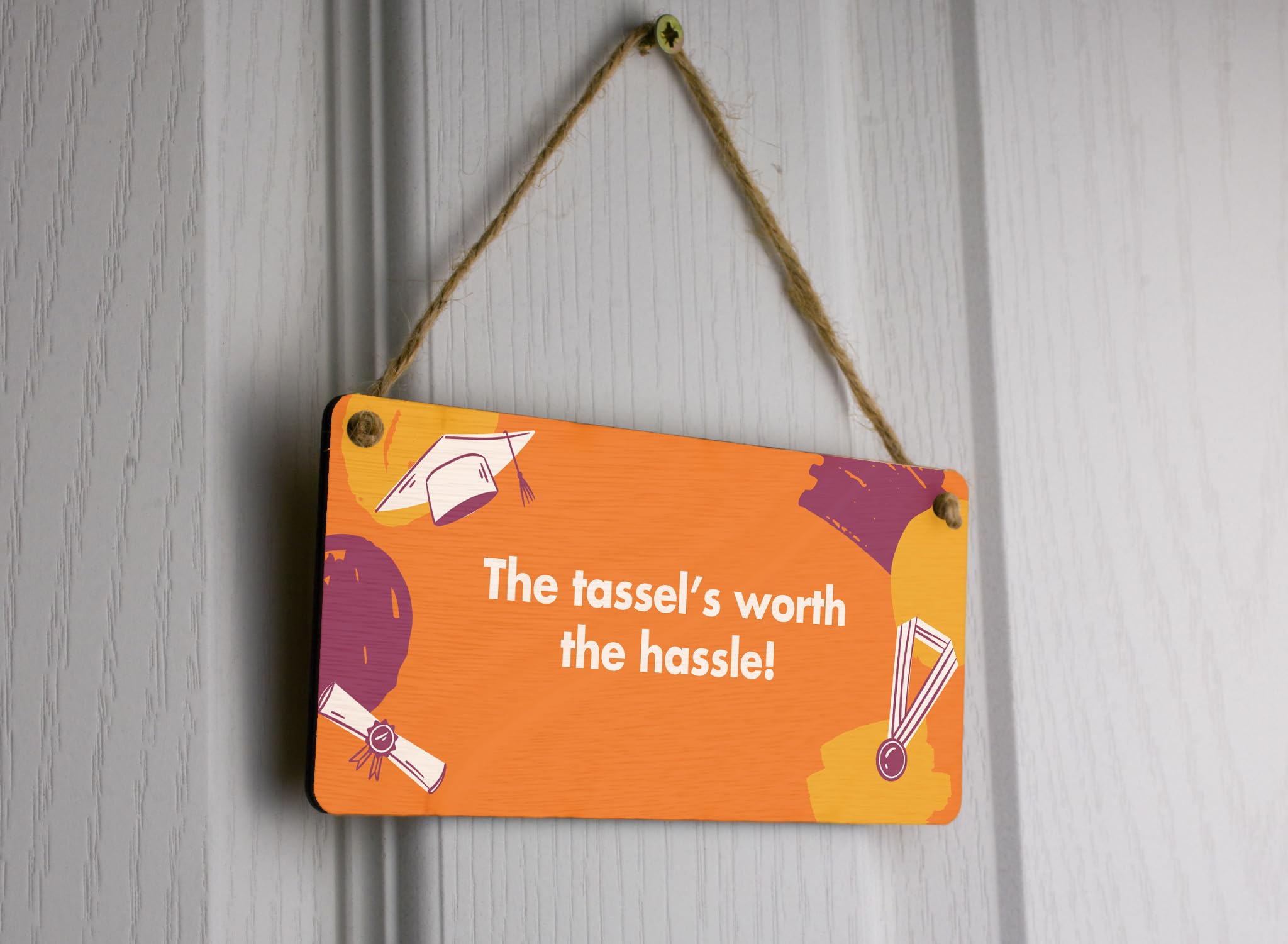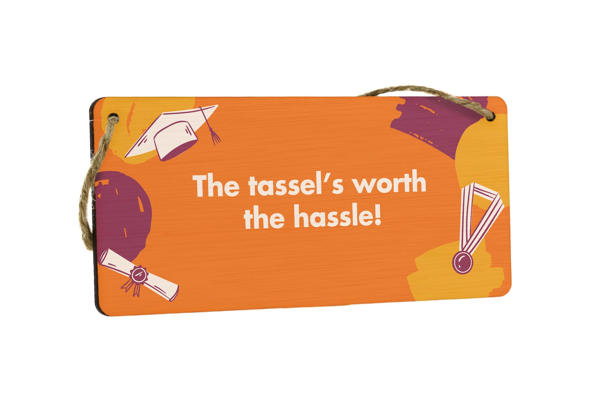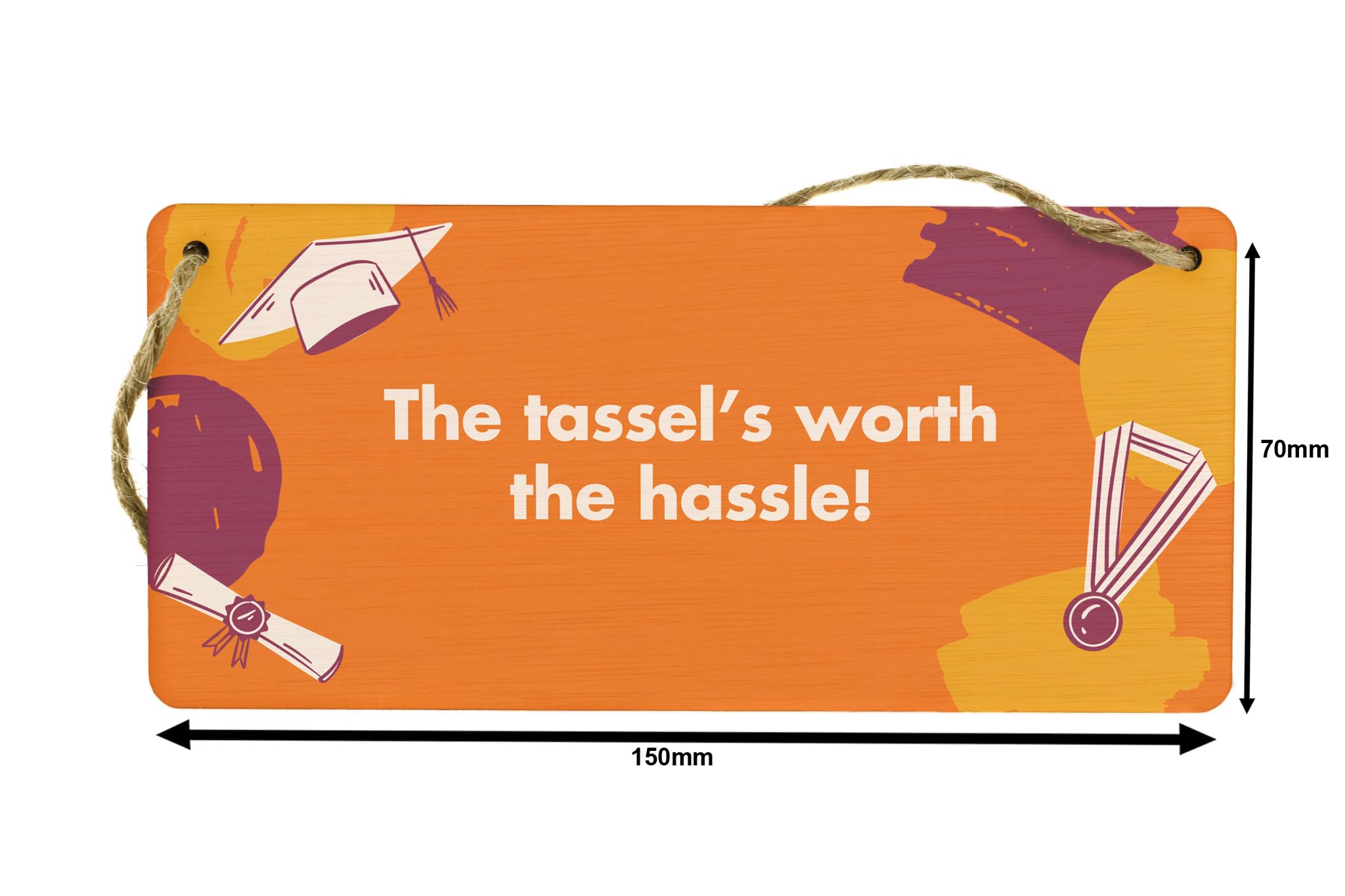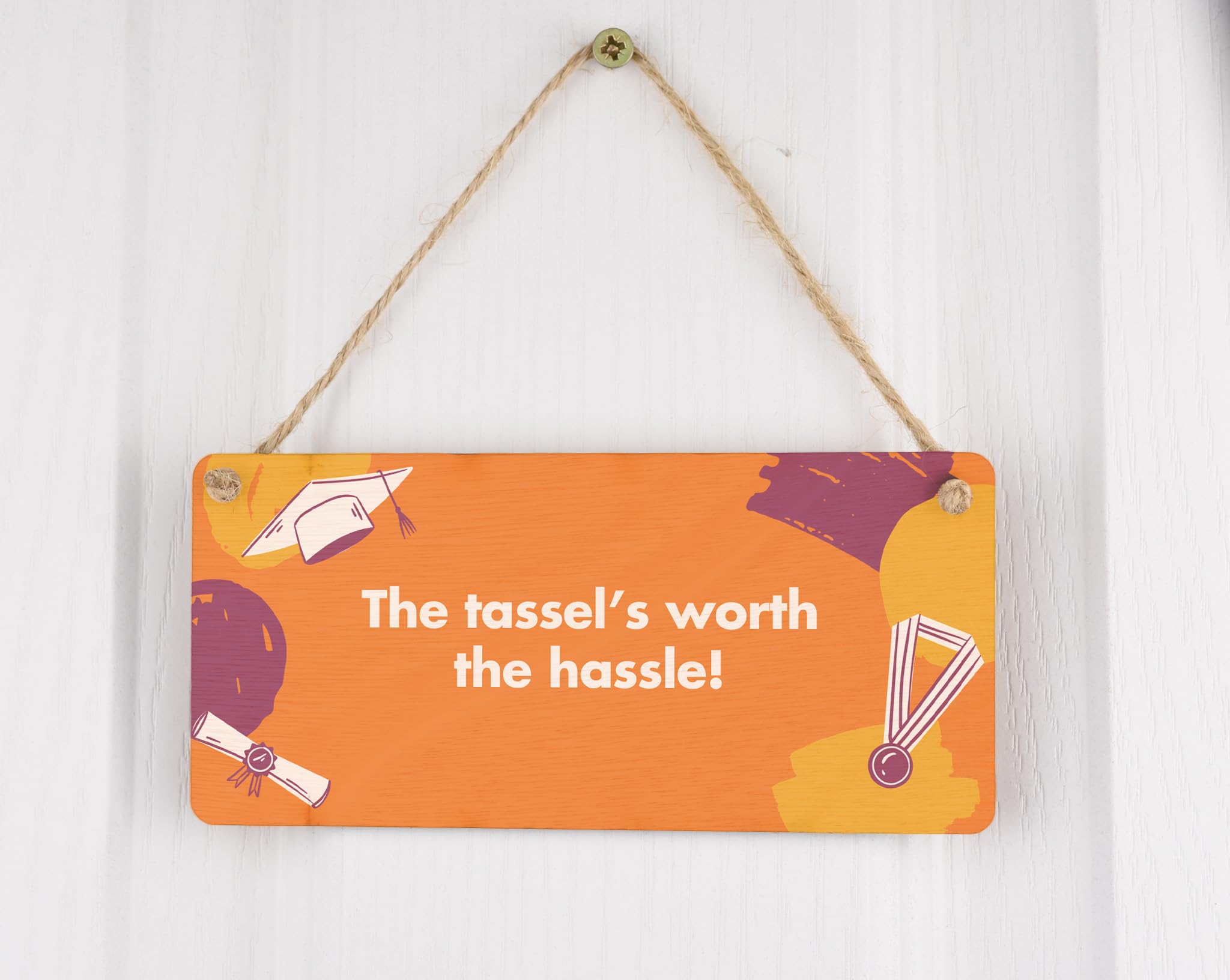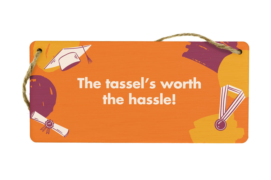 Add some style and personality to your home decor with this Full Colour Plywood Hanging Sign. This novelty sign is the perfect gift for him or her to celebrate their graduation. Made from durable plywood, this sign features a vibrant, eye-catching design that reads 'The Tassel's Worth the Hassle', reminding graduates of their hard work and achievements. Hang this sign in your living room or give it as a gift for home to show your support and congratulations. Prioritise your graduation celebration with this unique and meaningful gift!