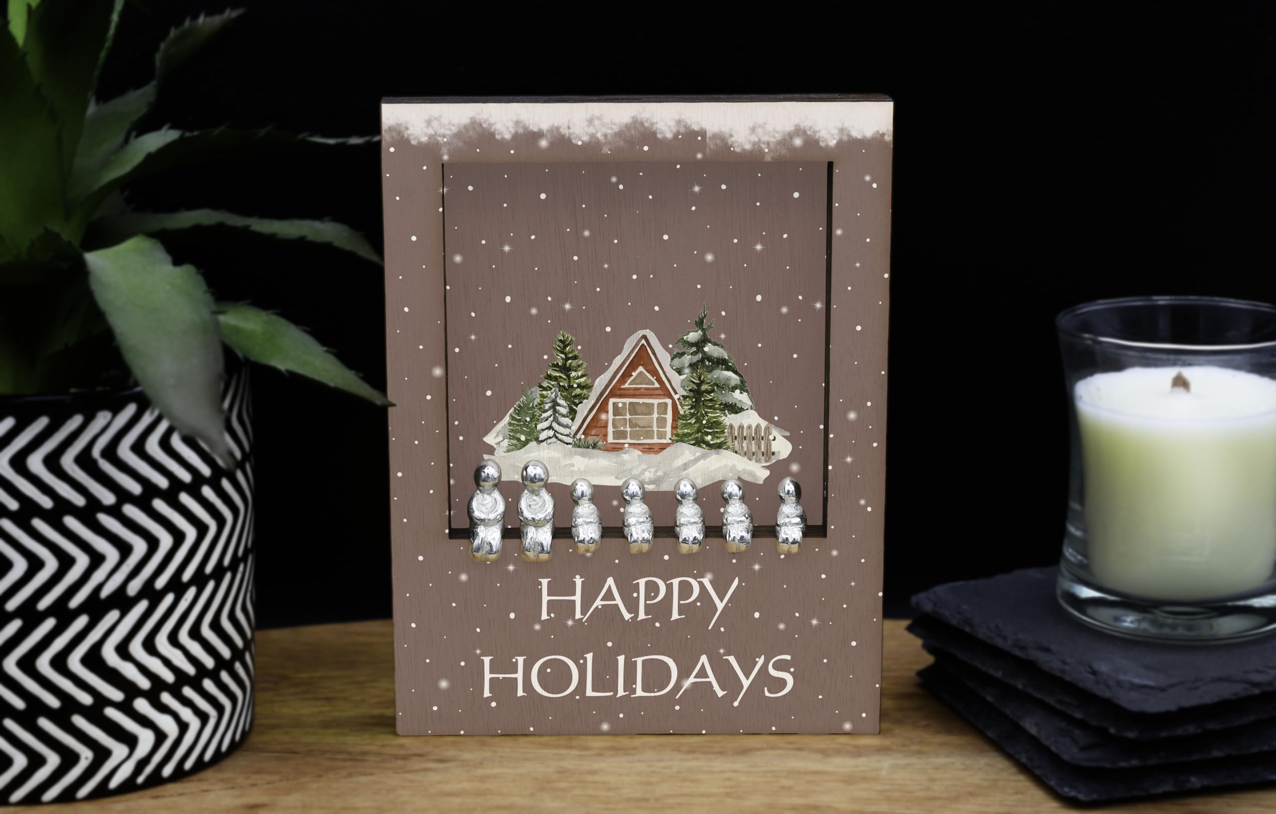 Add a touch of festive cheer to your home with our Customisable Family Ornament - Happy Holidays in Snowy Scene! This 7-Person Set is the perfect way to celebrate the holiday season and showcase your unique family. Made from quality plywood, this ornament features a charming image of a house buried in snow against a warm brown background. The snowy scene creates a cozy and heartwarming atmosphere in your home. The ornament reads 'Happy Holidays' in white writing, spreading joy and happiness to all who see it. With the ability to customise your own family combination, this ornament is a truly special addition to your holiday decor.