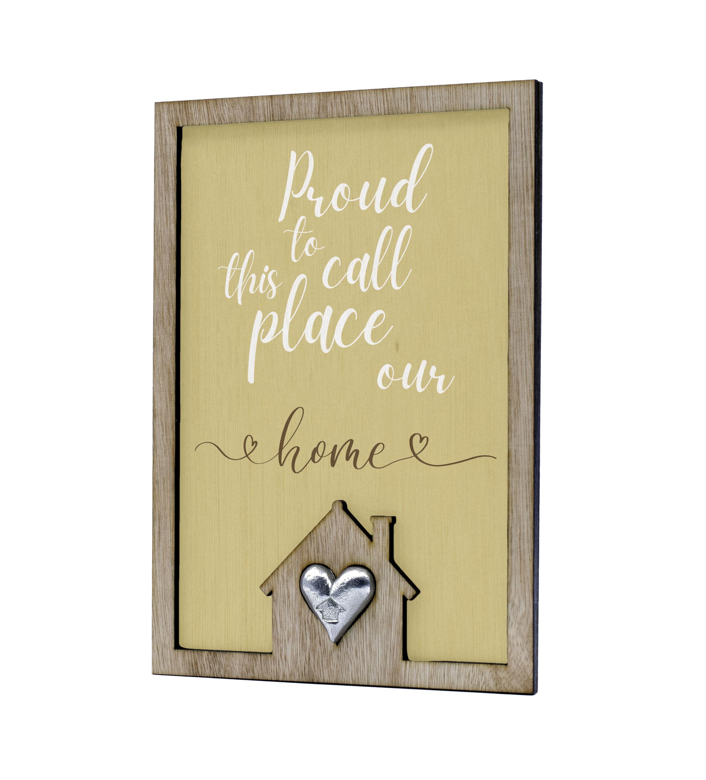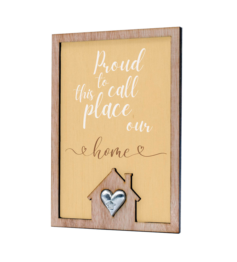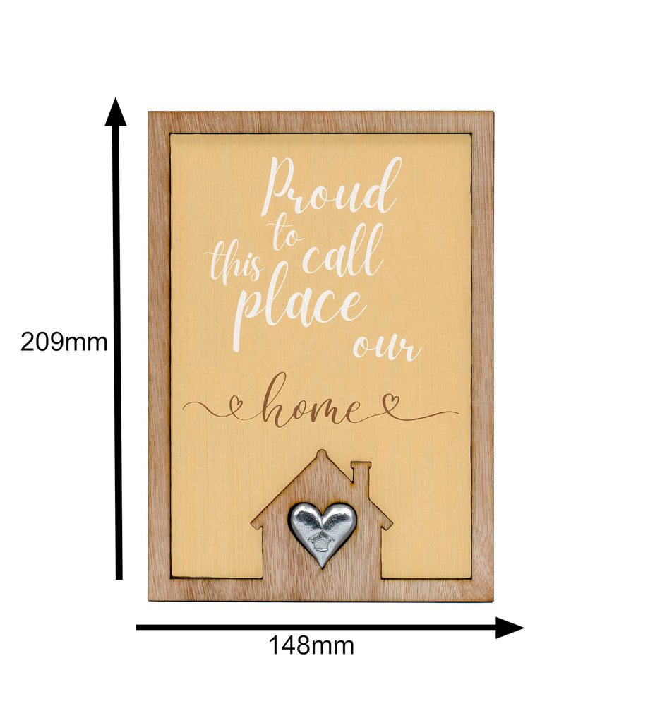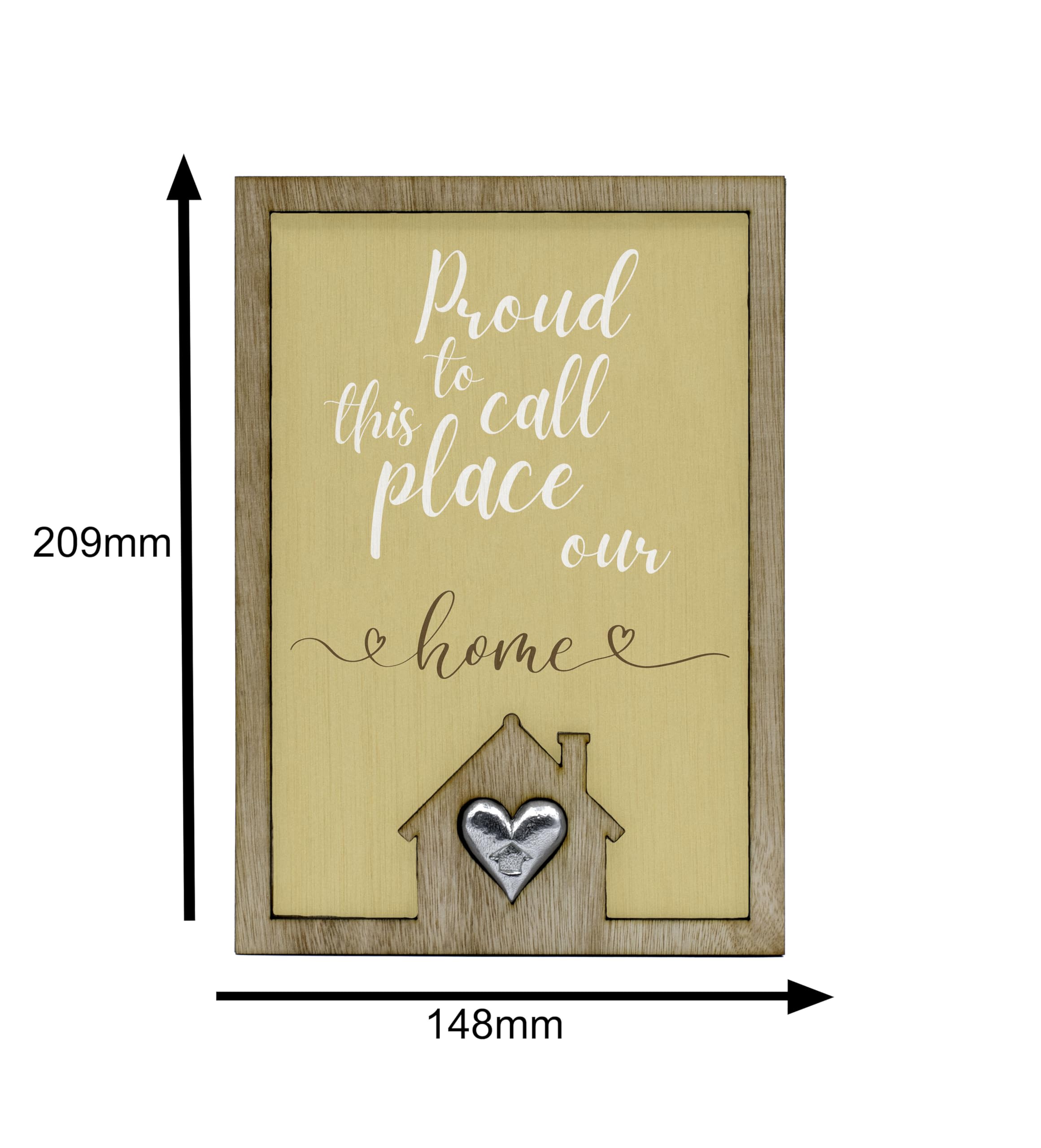 Add a touch of warmth and sentiment to your home with our Heartwarming Home Quote Sign. This decorative plaque is perfect for those who take pride in their living space and want to showcase their love for their home. The handcrafted laser cut plywood product features a full colour ornament with a charming yellow caligraphic design that reads 'Proud to Call This Place Our Home'. Whether you're looking for a housewarming gift or just want to add a cozy accent to your living room, this inspirational message is sure to bring a smile to your face. Made from tin and pewter, this heartfelt decor will make a beautiful addition to any family room, creating a space that is truly proud and happy. Embrace the love-themed ornament and let it remind you of the joy and comfort of being in a place that you can call your own.