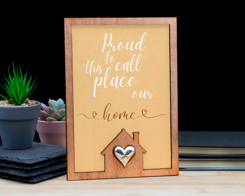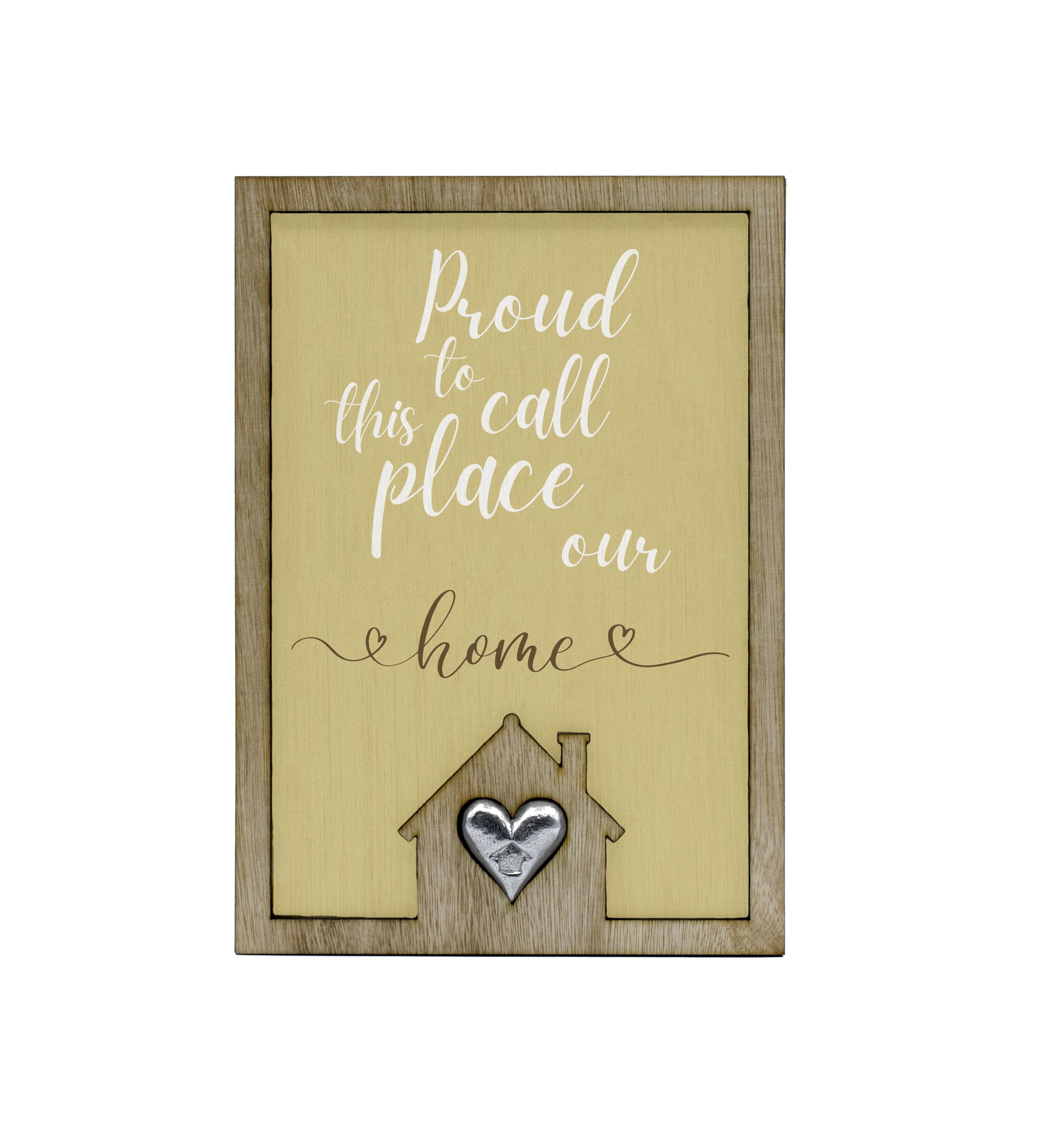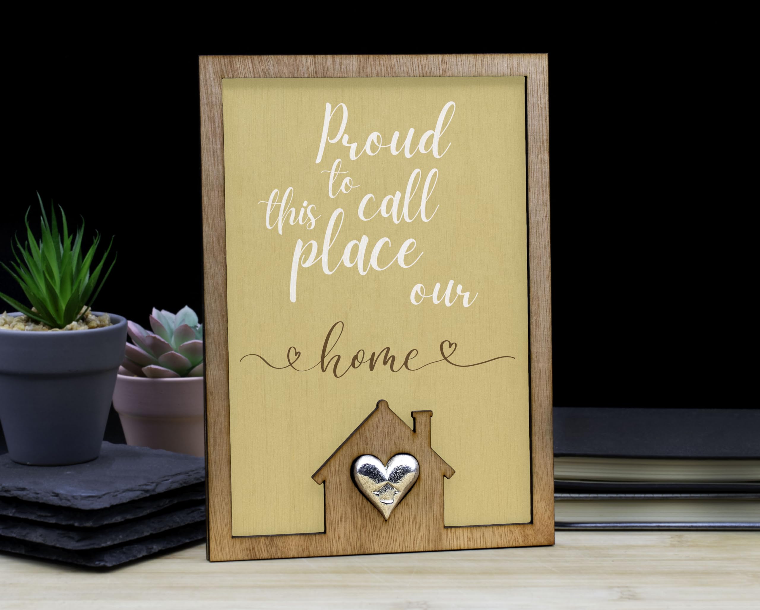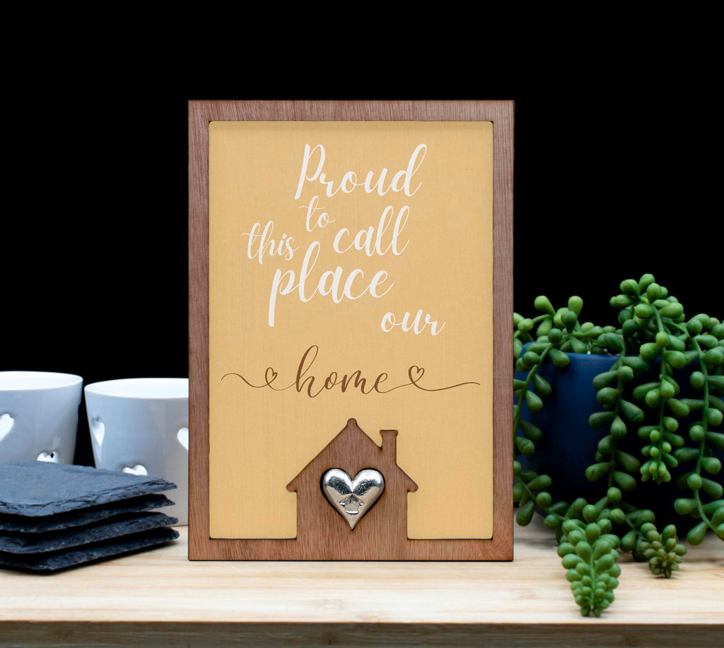 Add a touch of warmth and sentiment to your home with our Heartwarming Home Quote Sign. This decorative plaque is perfect for those who take pride in their living space and want to showcase their love for their home. The handcrafted laser cut plywood product features a full colour ornament with a charming yellow caligraphic design that reads 'Proud to Call This Place Our Home'. Whether you're looking for a housewarming gift or just want to add a cozy accent to your living room, this inspirational message is sure to bring a smile to your face. Made from tin and pewter, this heartfelt decor will make a beautiful addition to any family room, creating a space that is truly proud and happy. Embrace the love-themed ornament and let it remind you of the joy and comfort of being in a place that you can call your own.