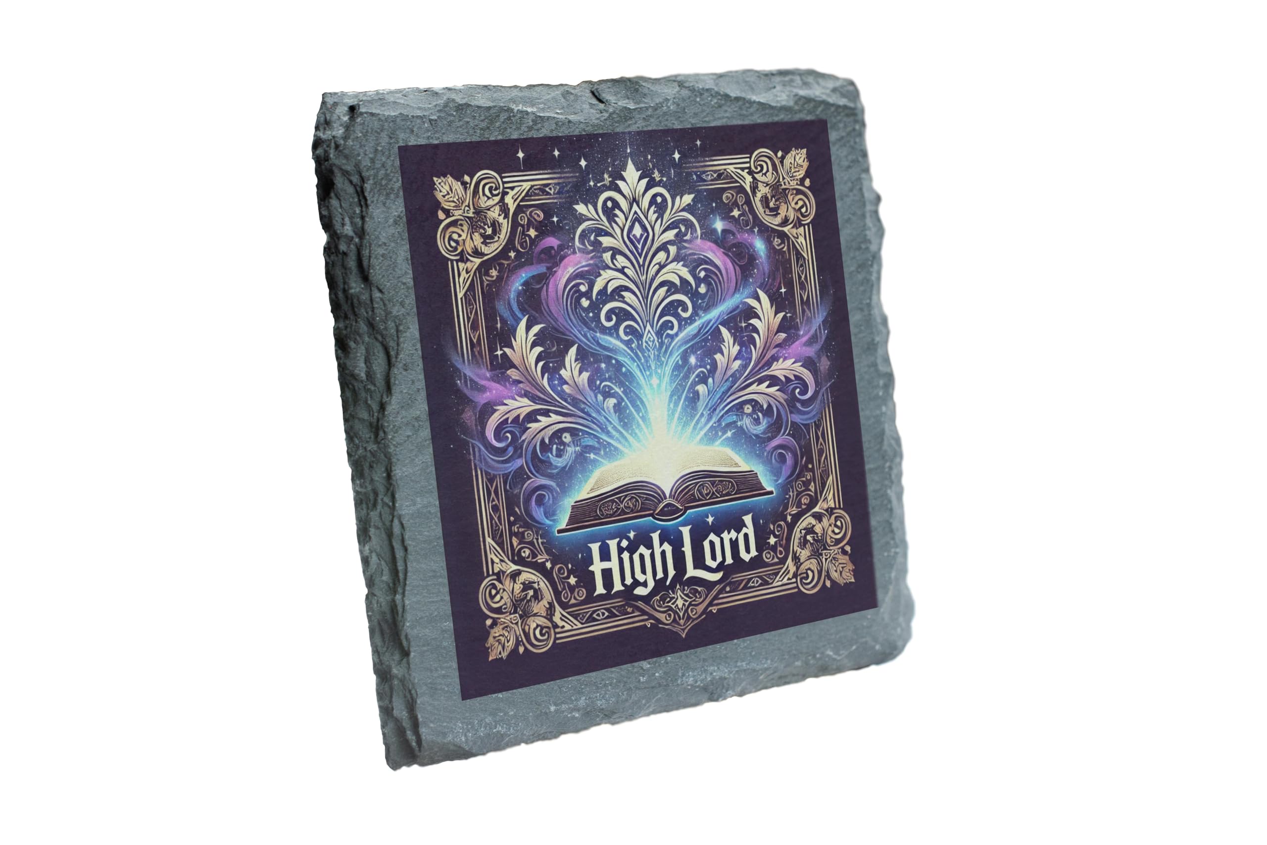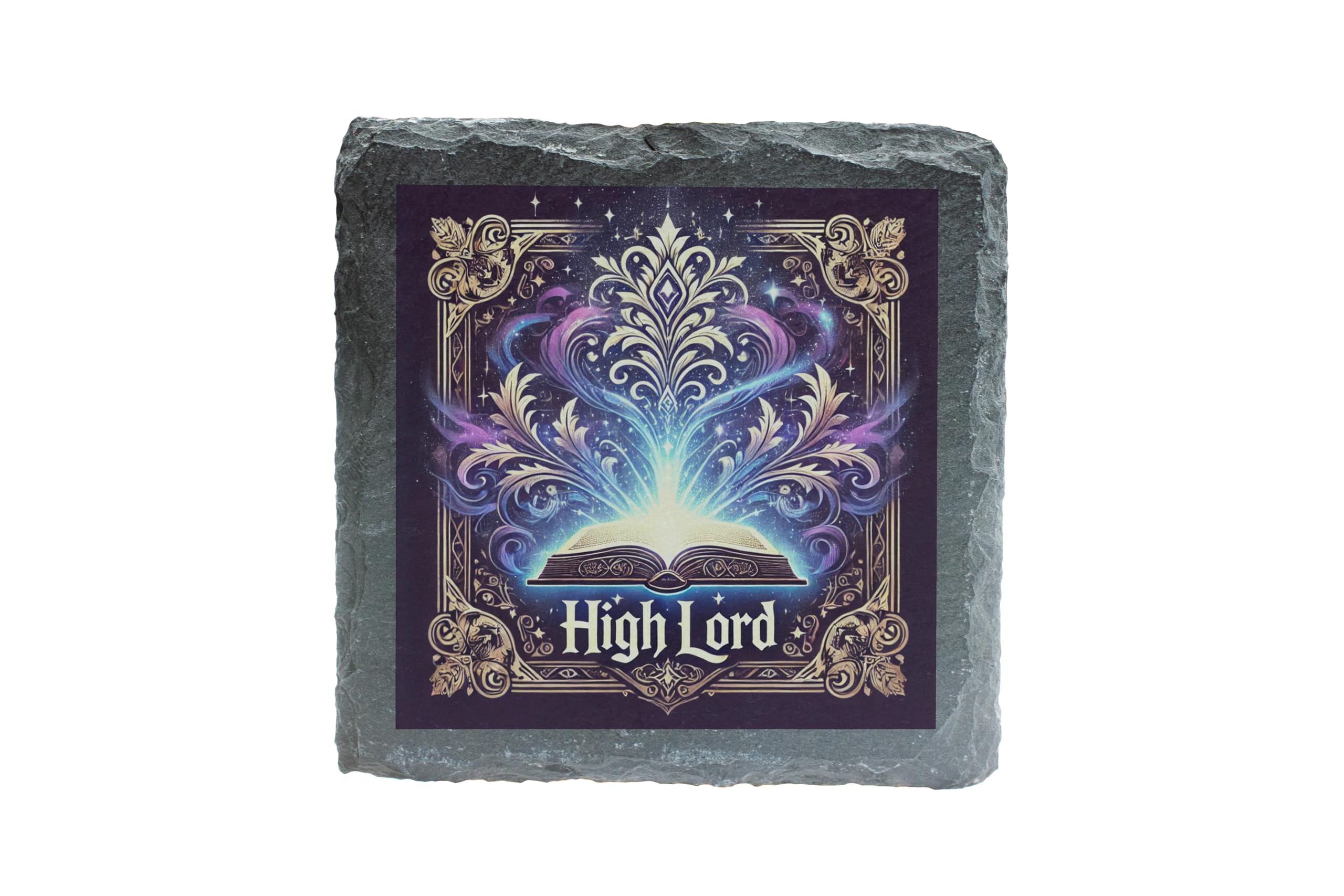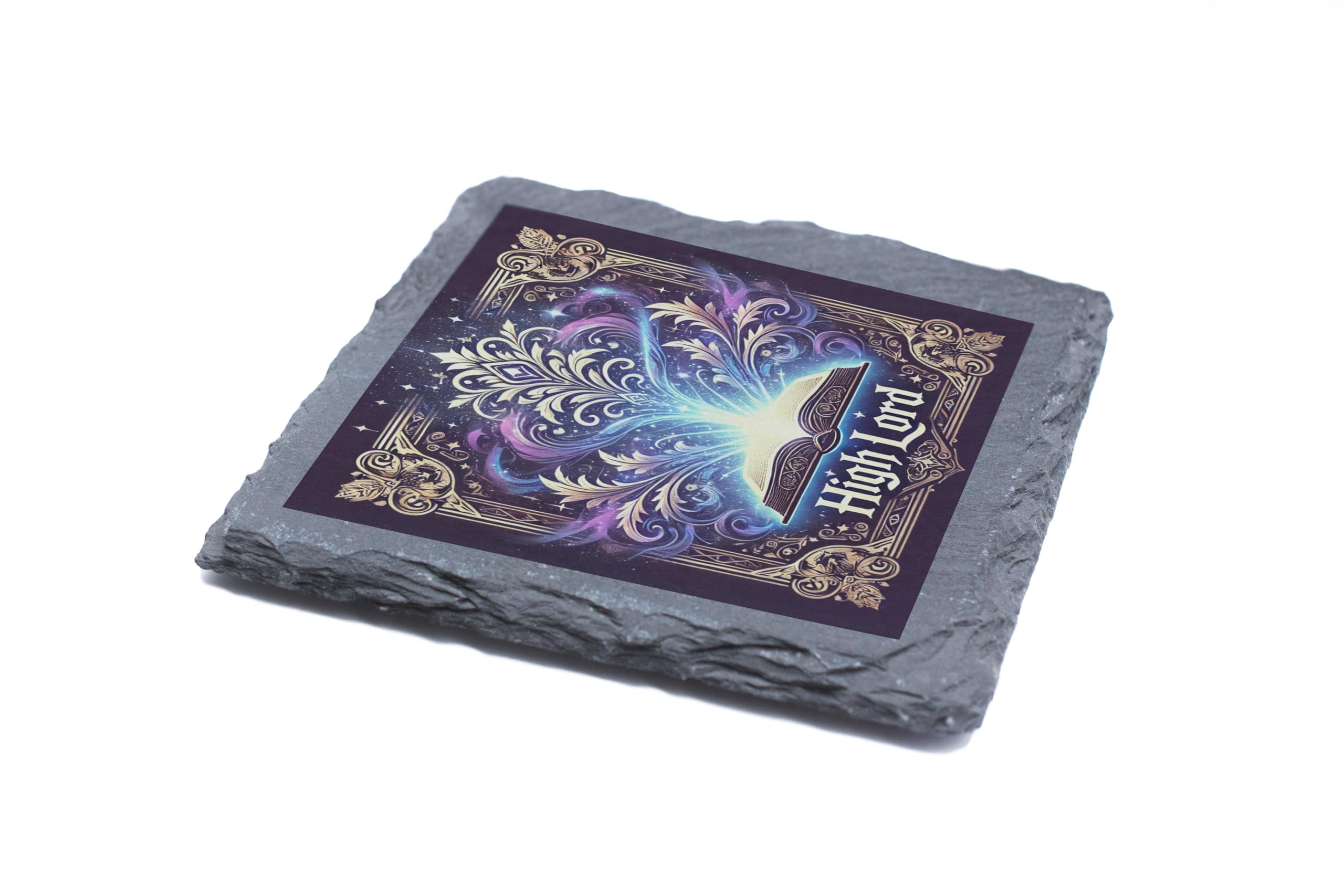 Step into a world of magic and mystique with the "High Lord" Slate Coaster. This beautifully crafted coaster showcases an open book glowing with ethereal light and surrounded by swirling magical patterns, perfect for sparking the imagination and enhancing your space. Constructed from natural slate with a textured, rustic edge, this coaster seamlessly combines functionality and style. Whether you're sipping tea, coffee, or enjoying a chilled beverage, it offers robust protection for your surfaces while becoming a conversation starter. The "High Lord" design is an ideal gift for lovers of fantasy, storytelling, and magical decor. Whether for your desk, coffee table, or as part of a themed decor collection, this slate coaster brings a touch of enchantment to any space.