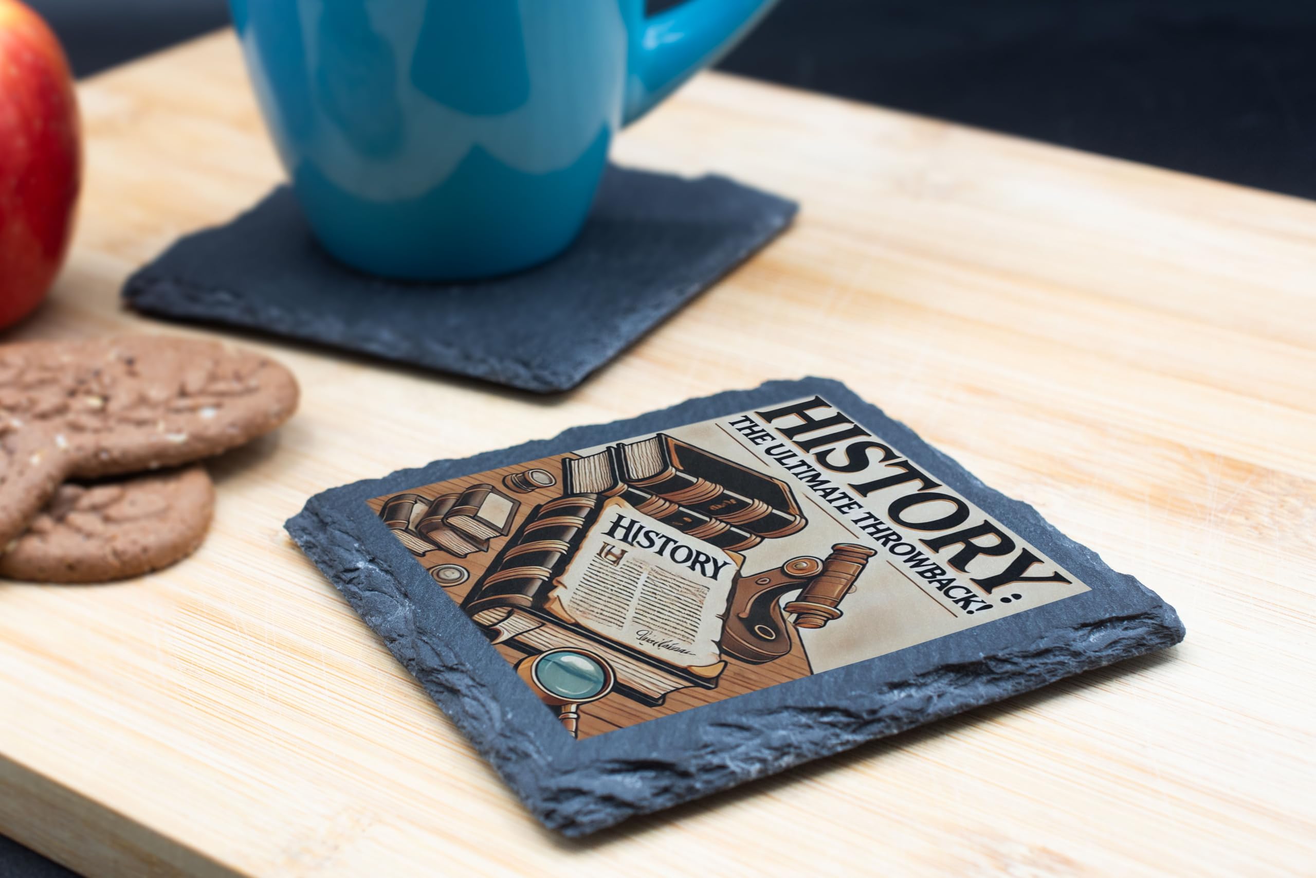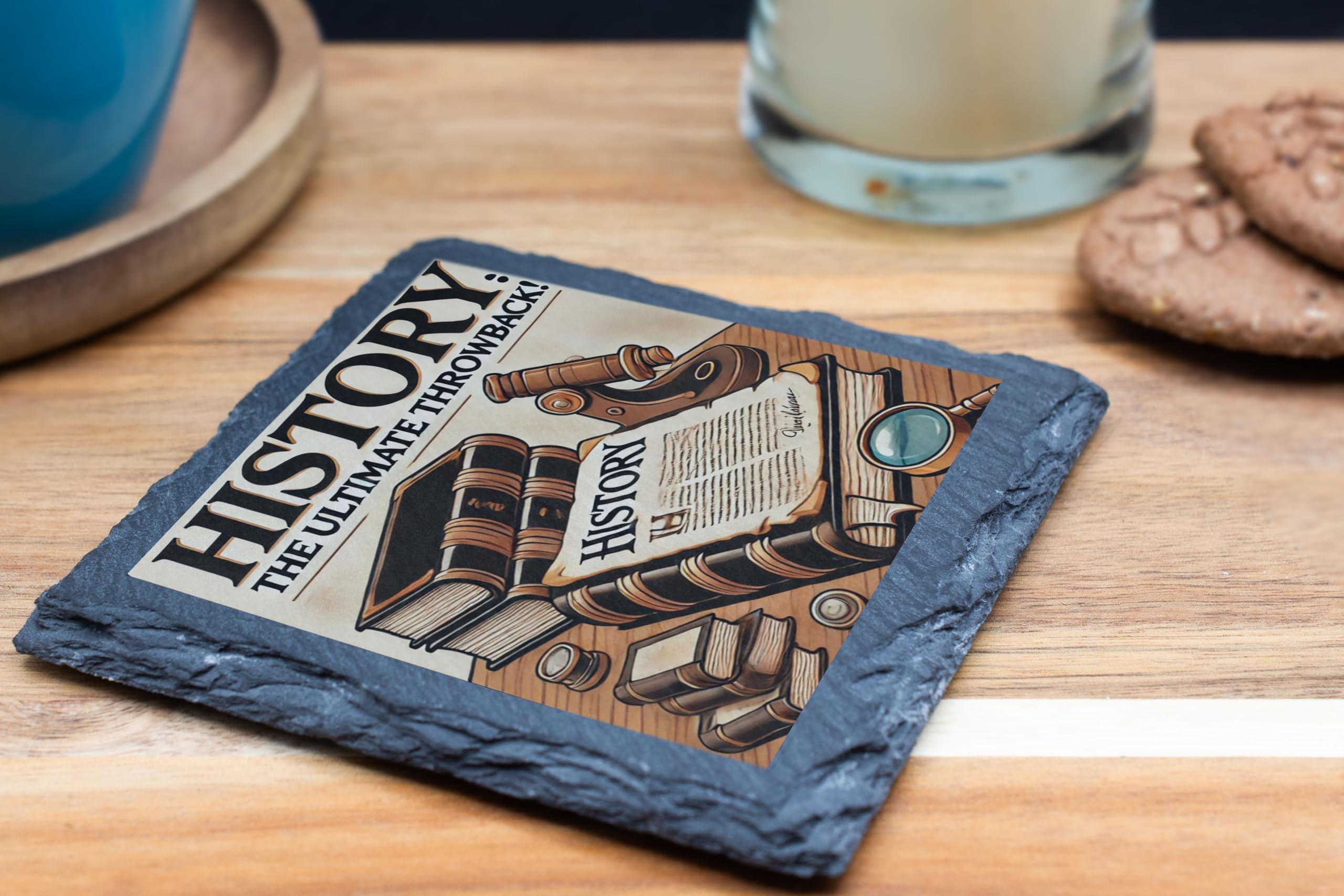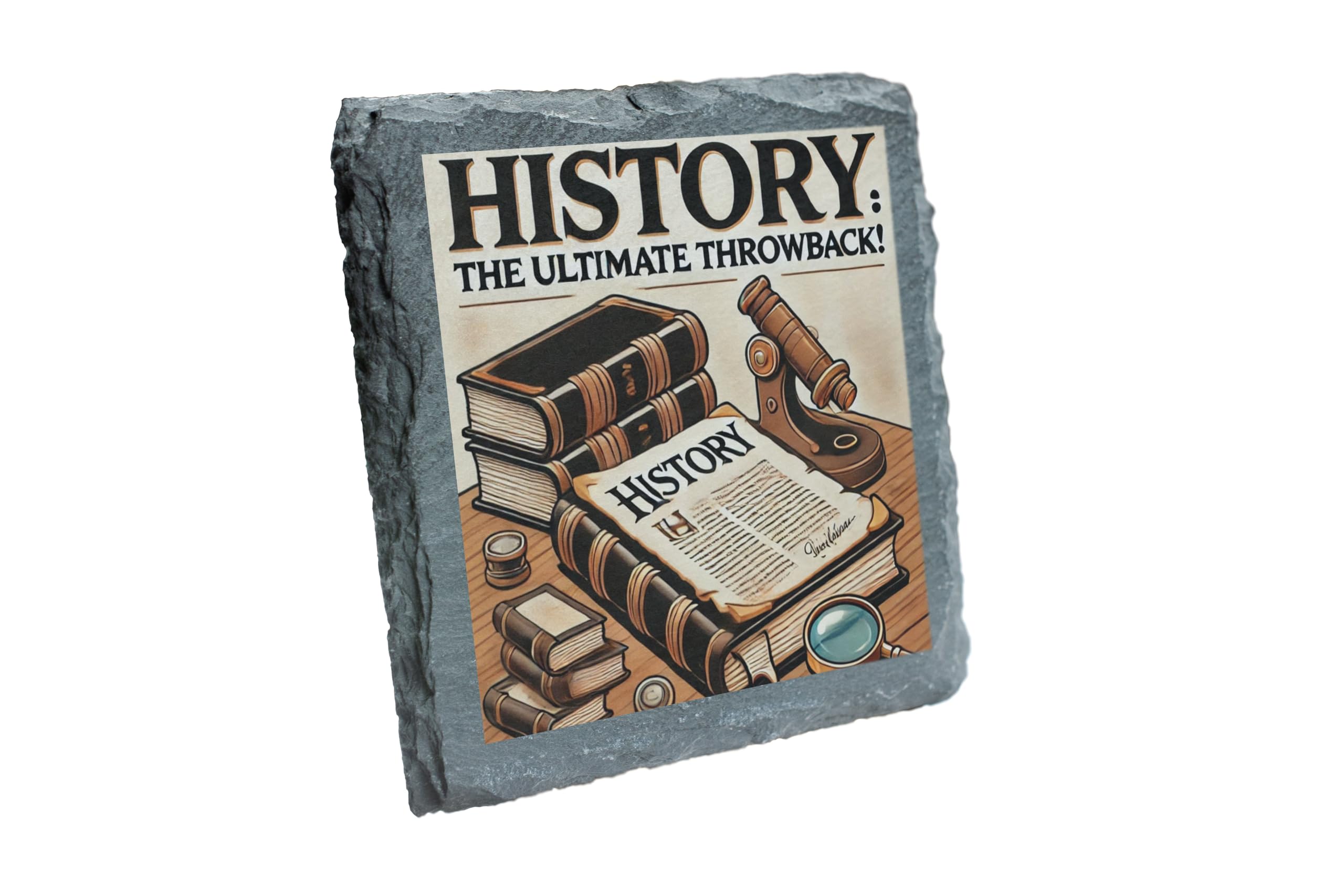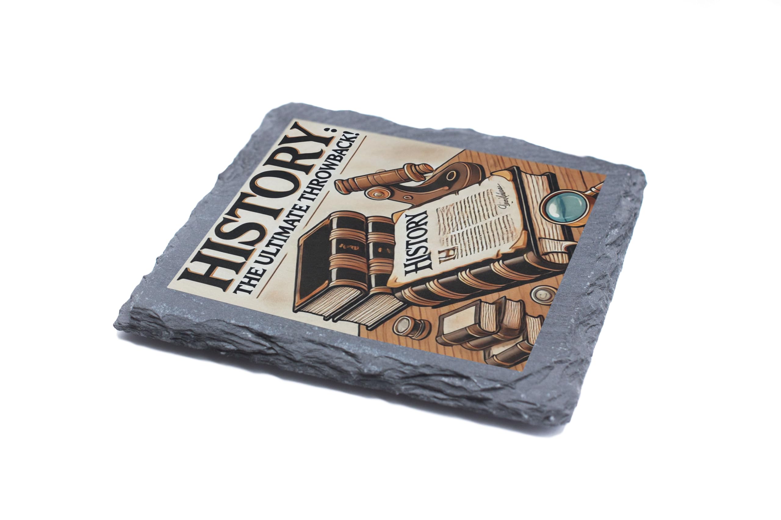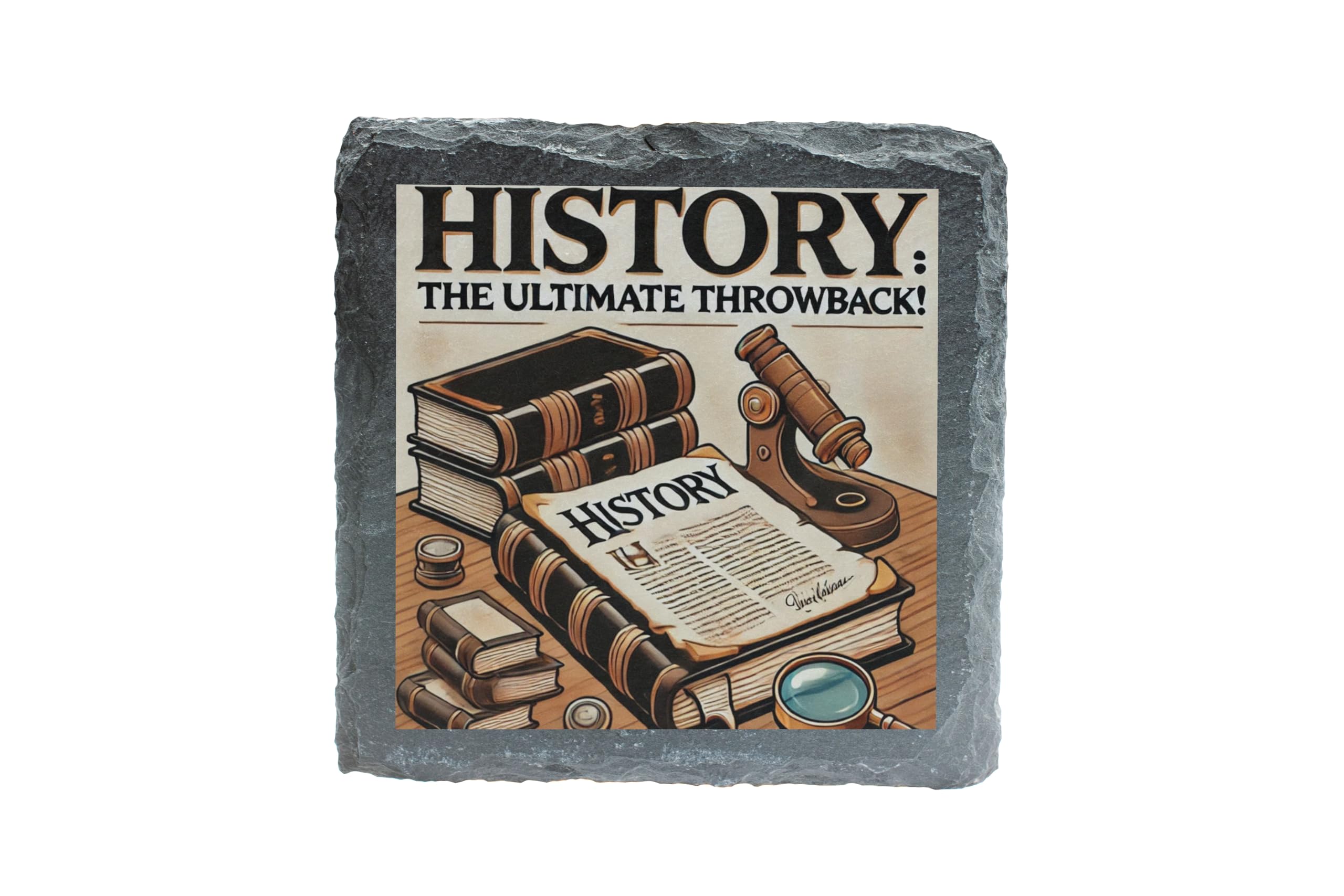 Step back in time with the "History: The Ultimate Throwback" Decorative Slate Coaster. Perfect for history enthusiasts, this beautifully designed coaster showcases a collection of historical books, a magnifying glass, and a quill, evoking the charm of bygone eras. Made from high-quality natural slate, this coaster is not only visually appealing but also highly functional, protecting your furniture from water rings and spills. The fade-resistant print ensures the vibrant design remains as striking as the day you receive it. Whether you're sipping your morning coffee, hosting a history-themed gathering, or looking for a thoughtful gift for a history lover, this slate coaster combines style, durability, and a love for the past in one perfect package. Add a timeless touch to your home or office with this unique decorative piece!