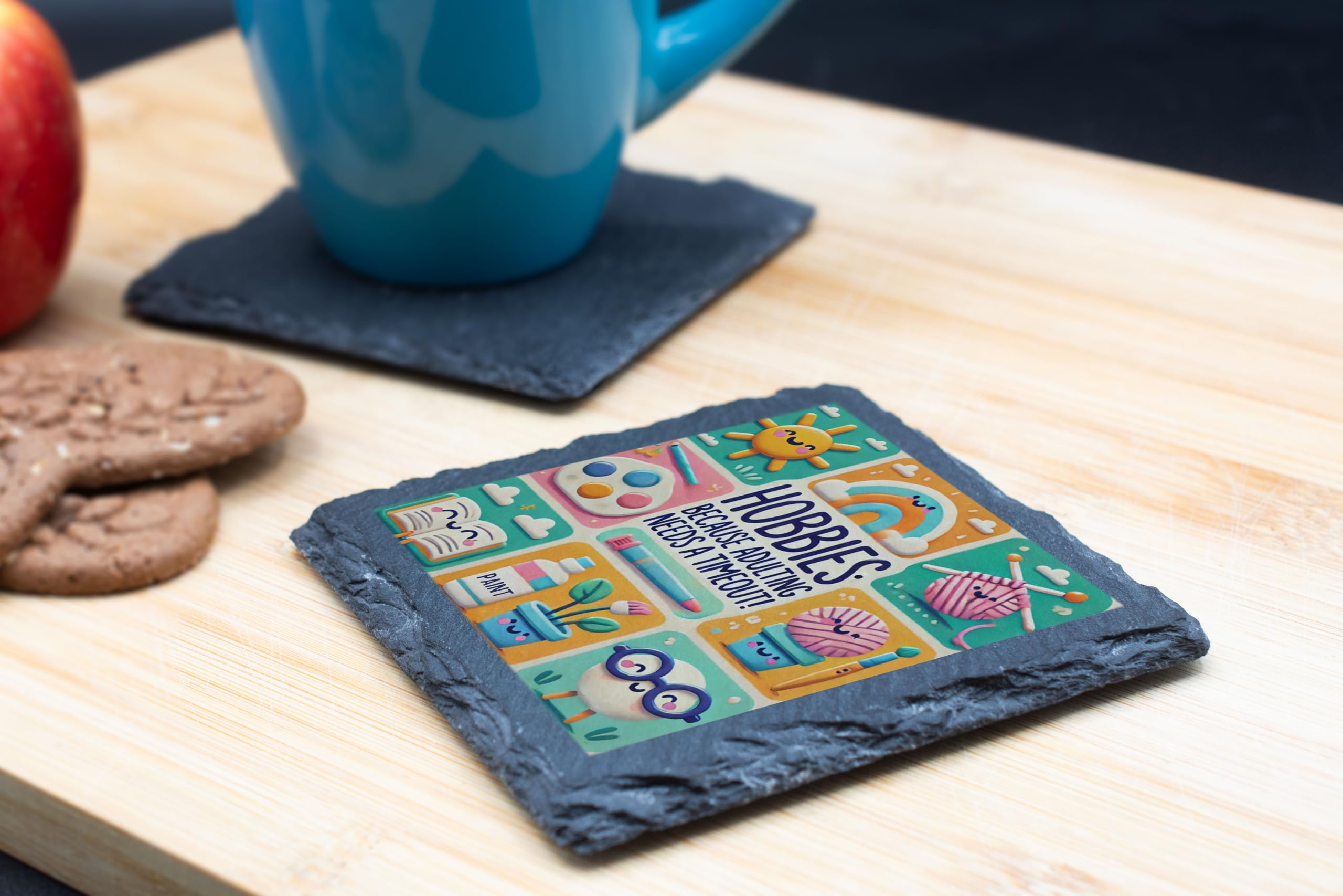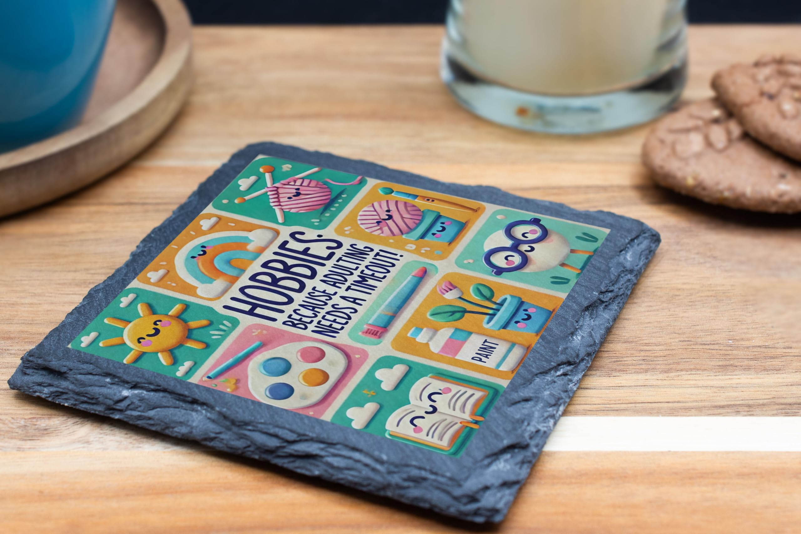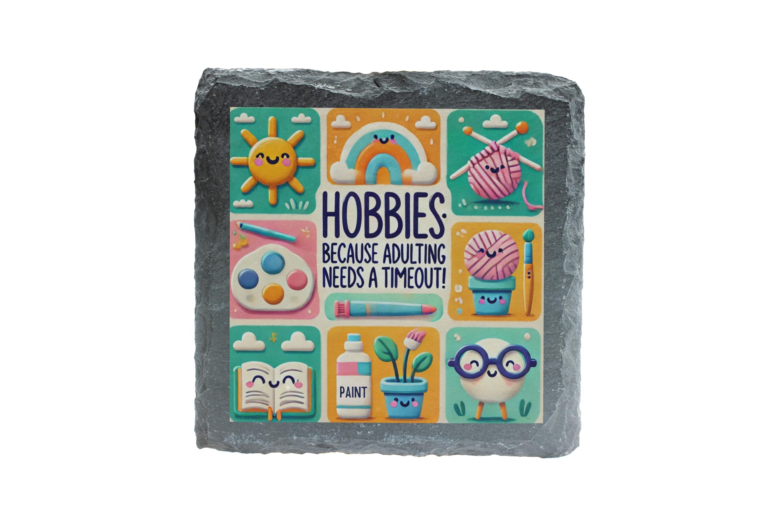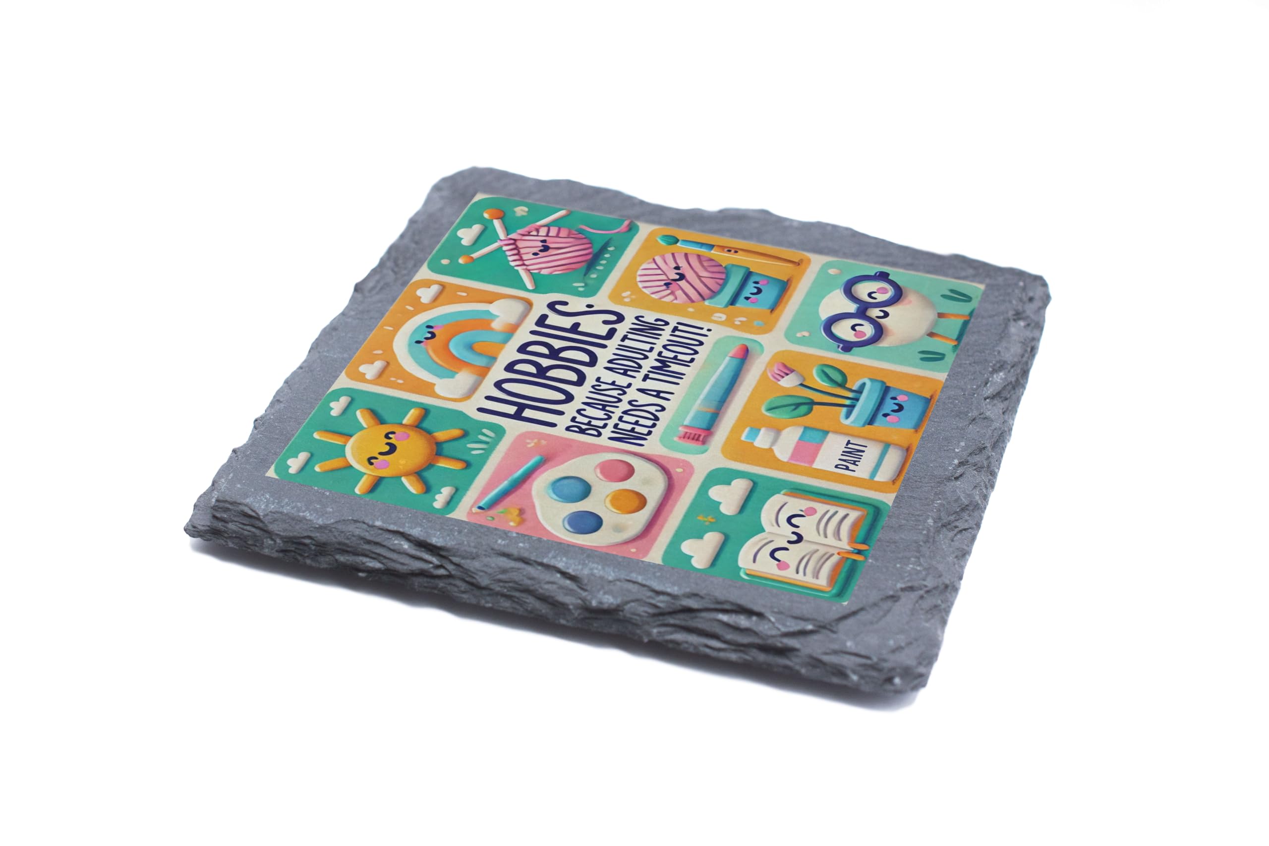 Take a break from adulting with this Hobbies Slate Coaster, featuring the witty phrase "Because Adulting Needs a Timeout" surrounded by vibrant illustrations of knitting, painting, gardening, and more. This coaster celebrates the joy of hobbies and is perfect for adding a touch of personality to your workspace or craft area. Made from premium natural slate, it combines durability with style, while the non-slip backing ensures your surfaces stay safe. Whether you're sipping coffee during a crafting session or enjoying tea while reading, this coaster is the perfect companion. An ideal gift for anyone who cherishes their hobbies and knows the importance of a timeout!