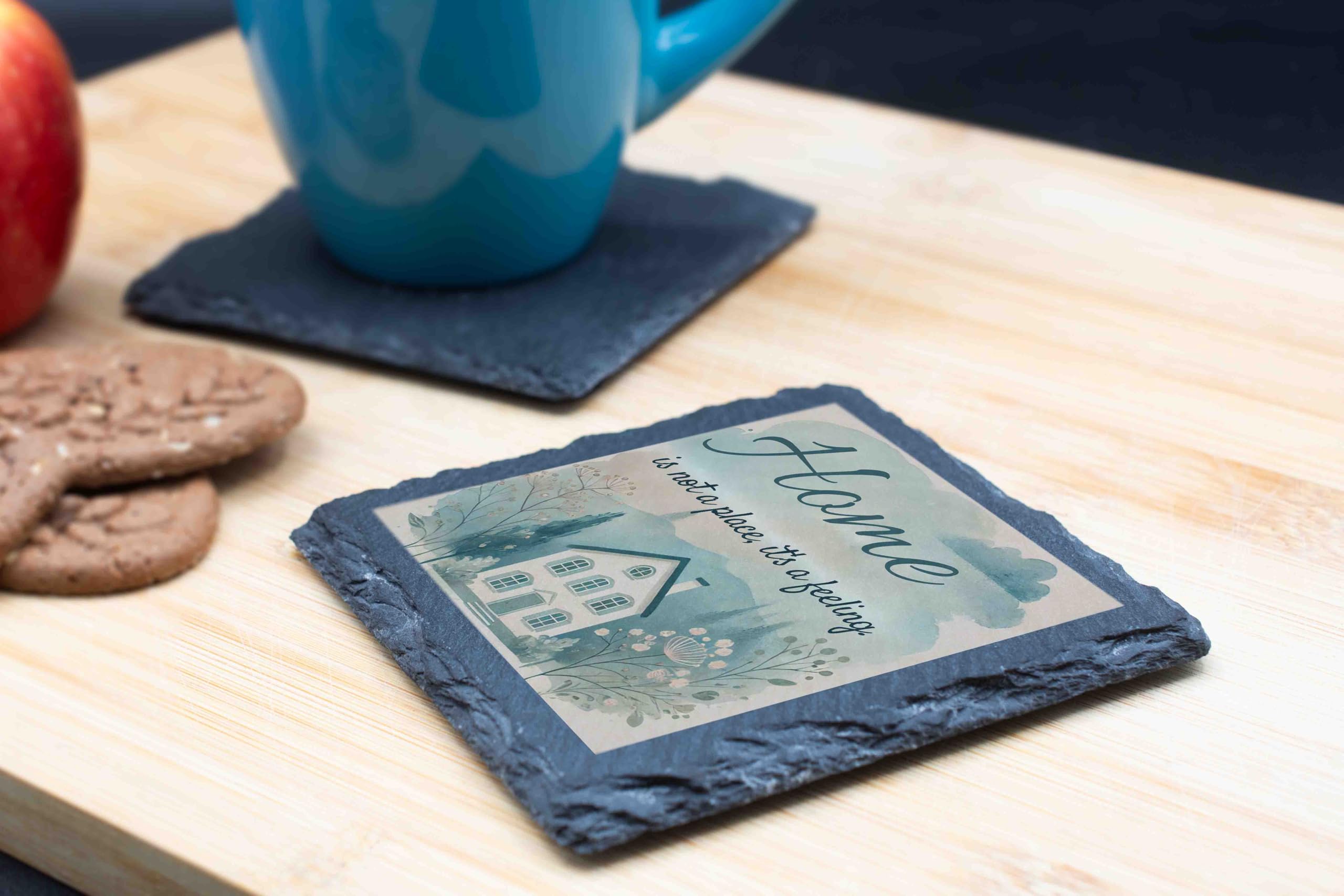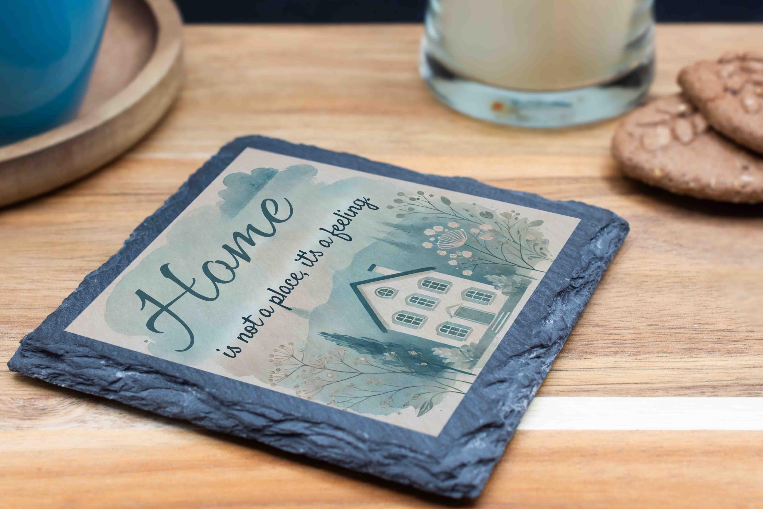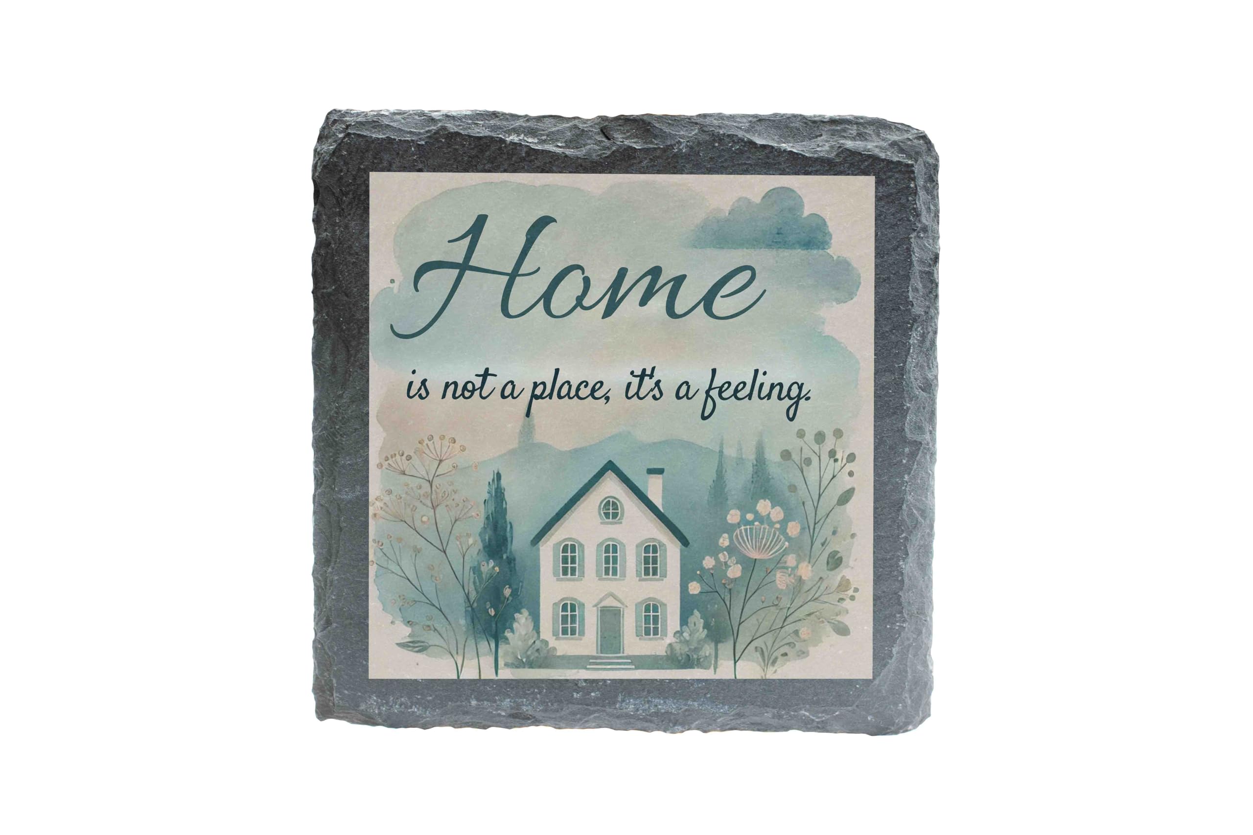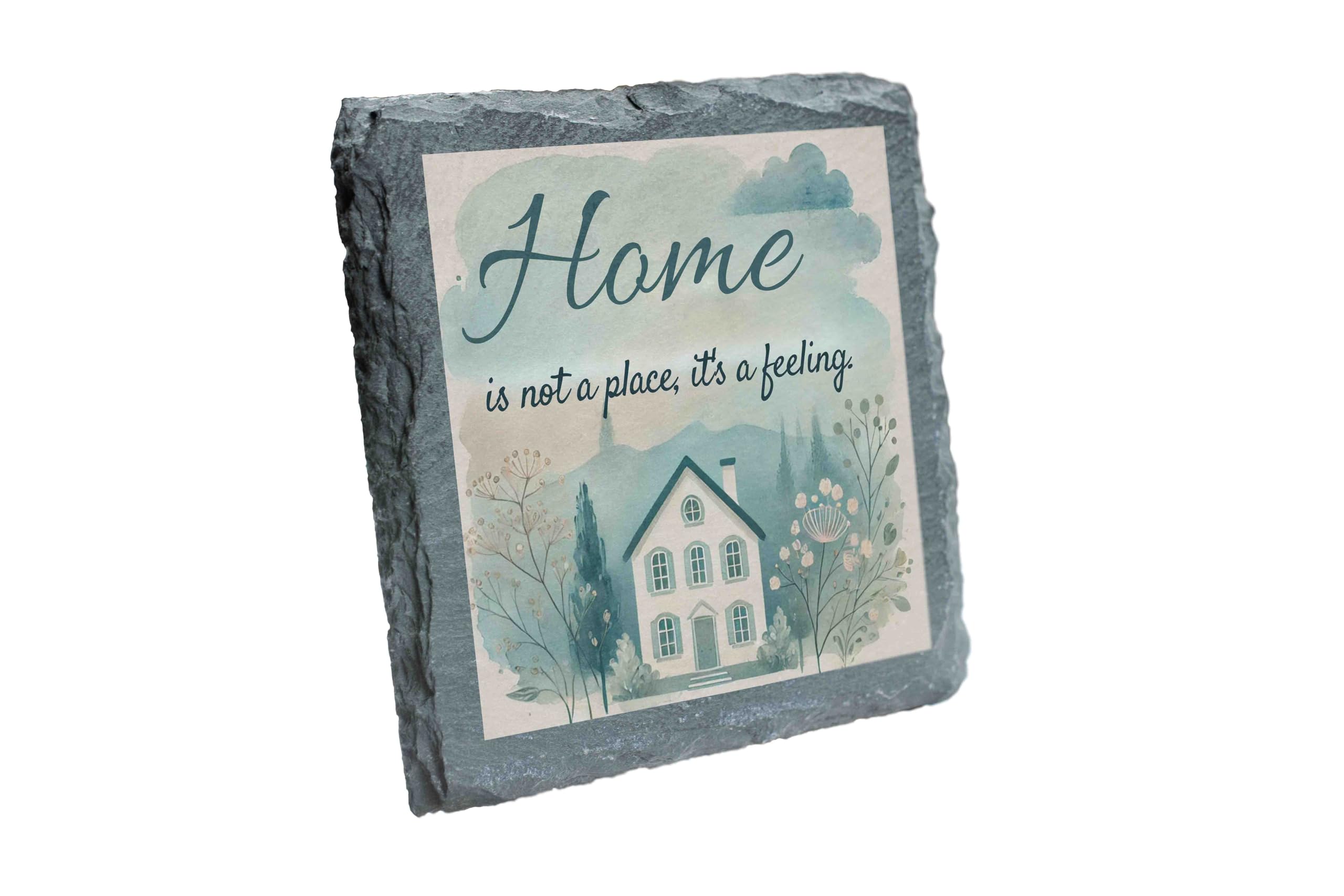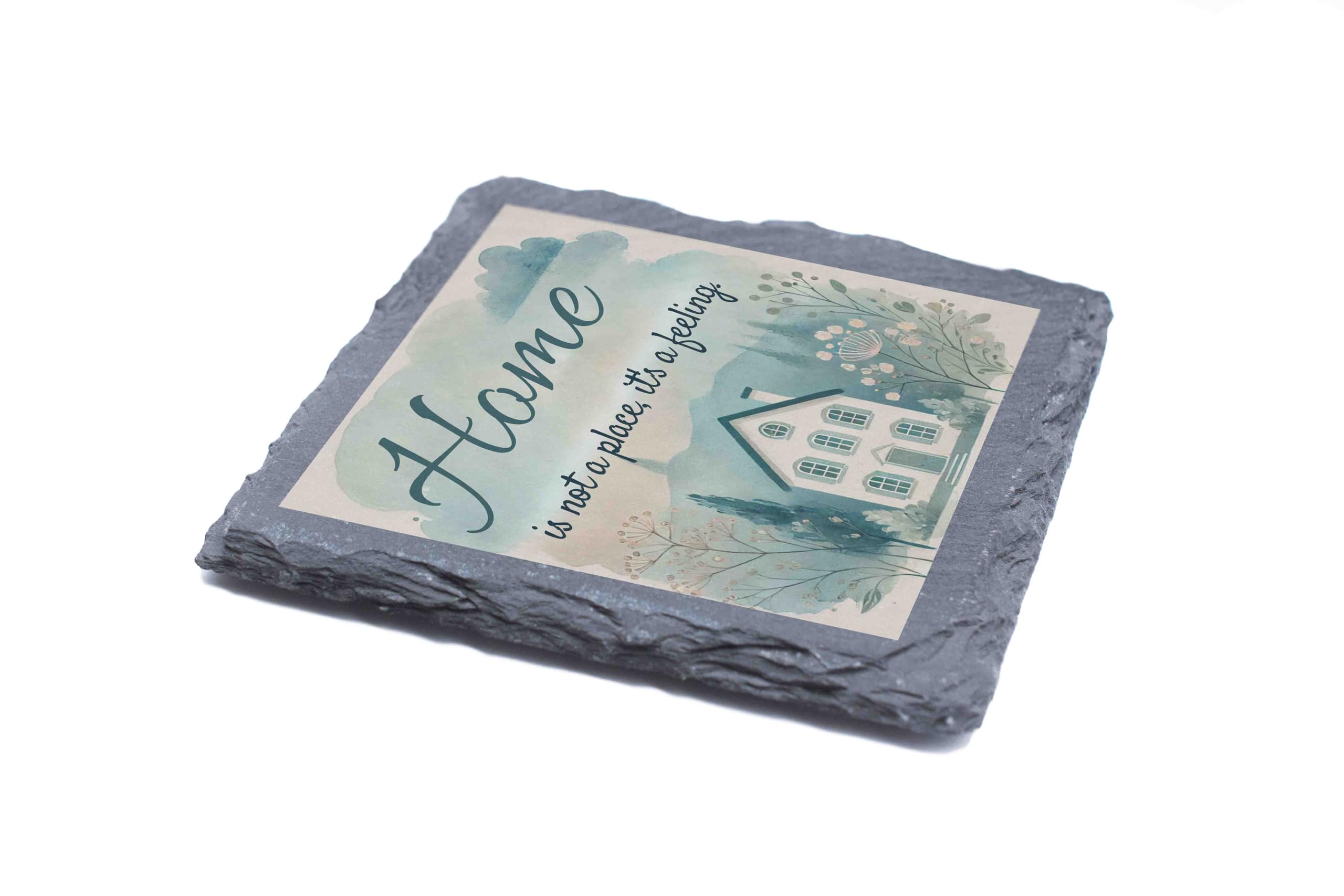 Capture the essence of home with this beautifully designed slate coaster. The heartwarming message "Home is Not a Place, It's a Feeling" paired with a delicate watercolor illustration evokes a sense of comfort and belonging. Perfect for both practical use and as a decorative piece, this natural slate coaster protects surfaces while adding a personal touch to your living space. Ideal as a housewarming gift or a token of appreciation for loved ones, this coaster celebrates the true meaning of home. Each handcrafted piece ensures a unique and authentic finish.